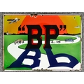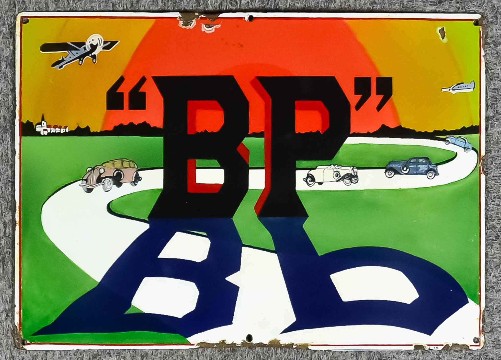 A Reproduction "BP" Enamel Advertising Sign, in many colours depicting the 'BP' logo casting a shadow, with a plane, a seaplane and three cars in the background, 17ins wide x 12ins high