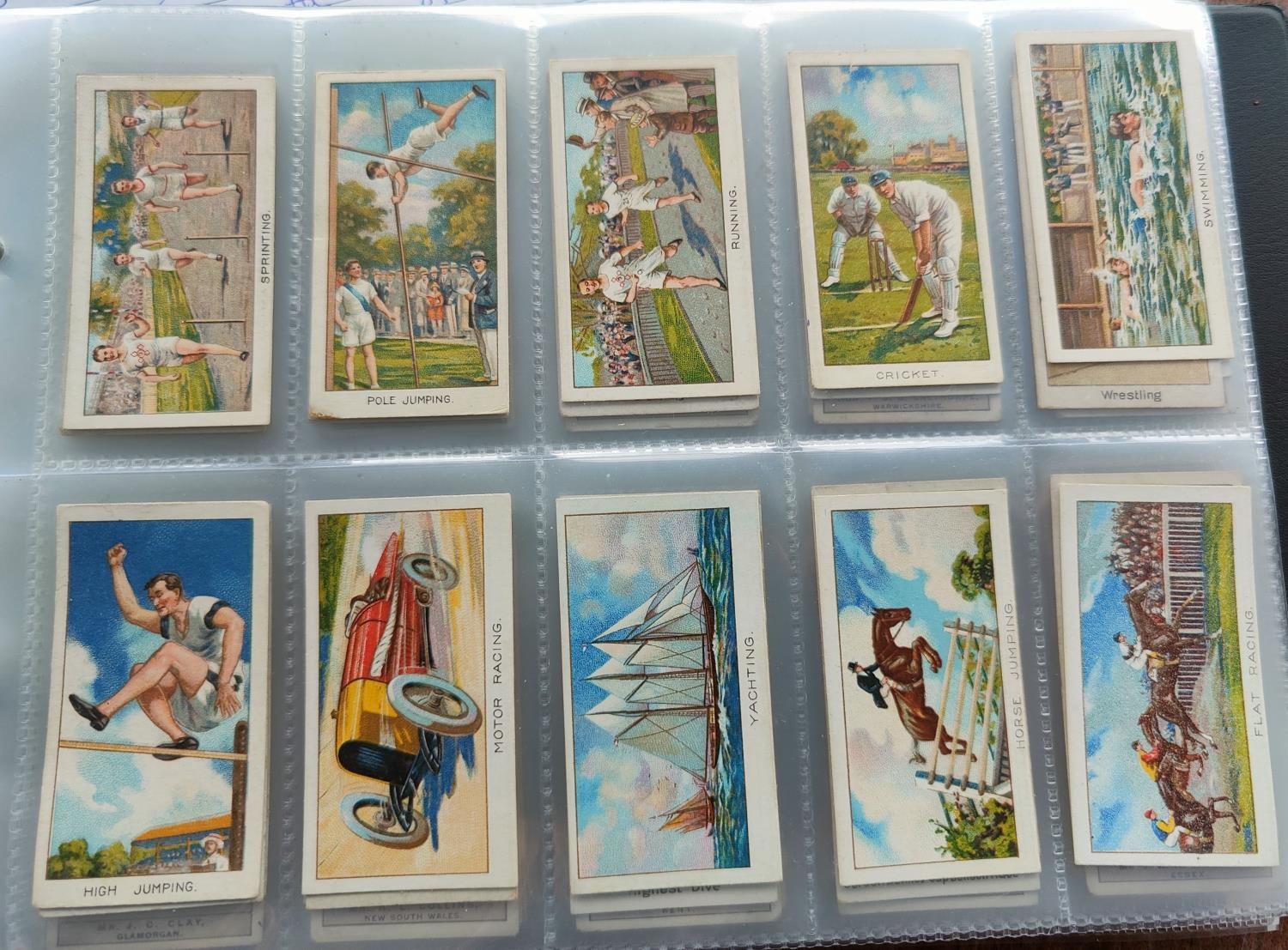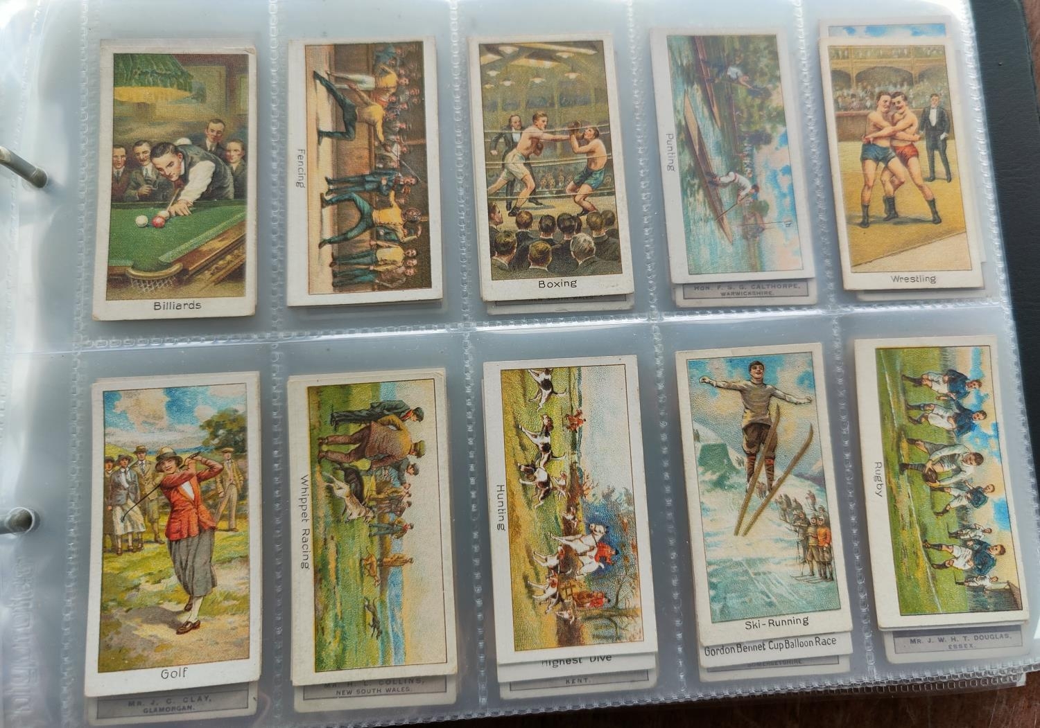 An album of 32 sheets of part sets of cigarette cards, including Ogdens, Faulkner, Hignetts etc.