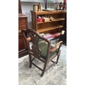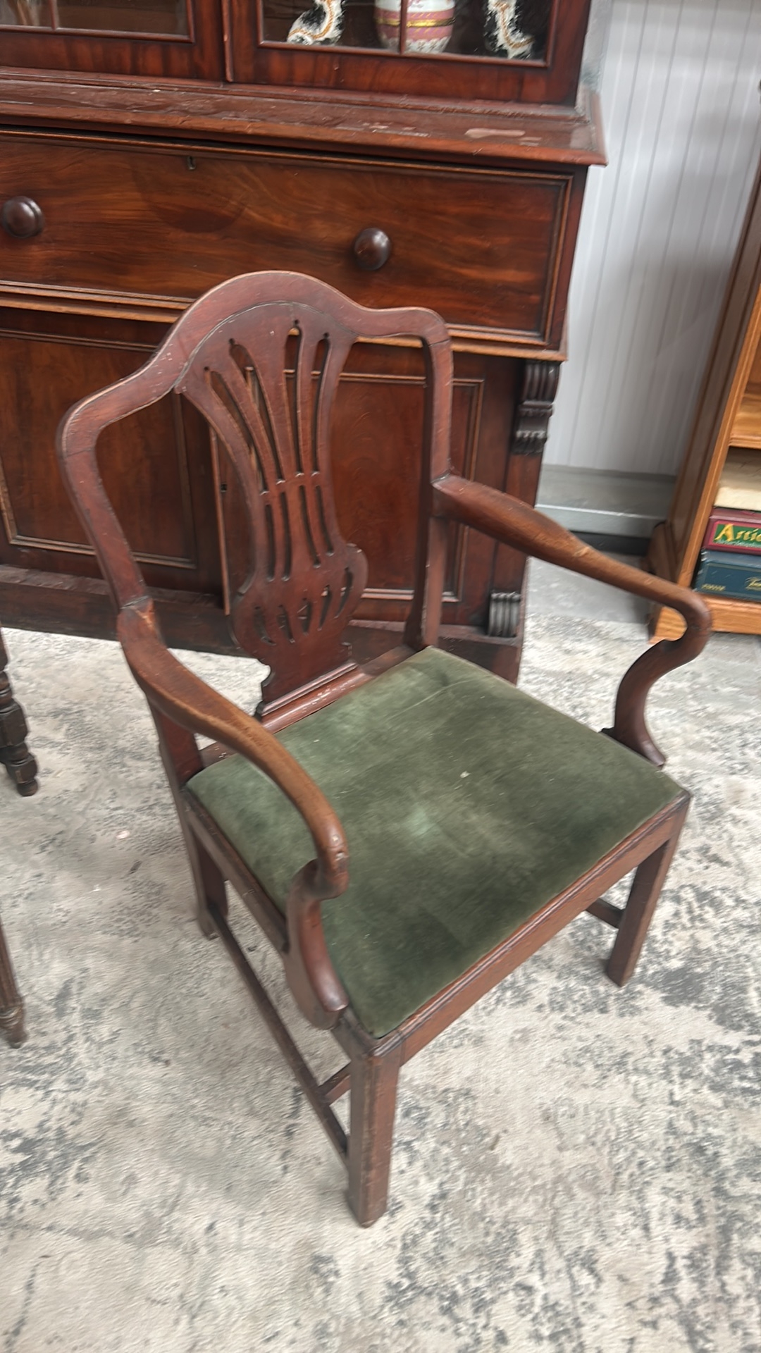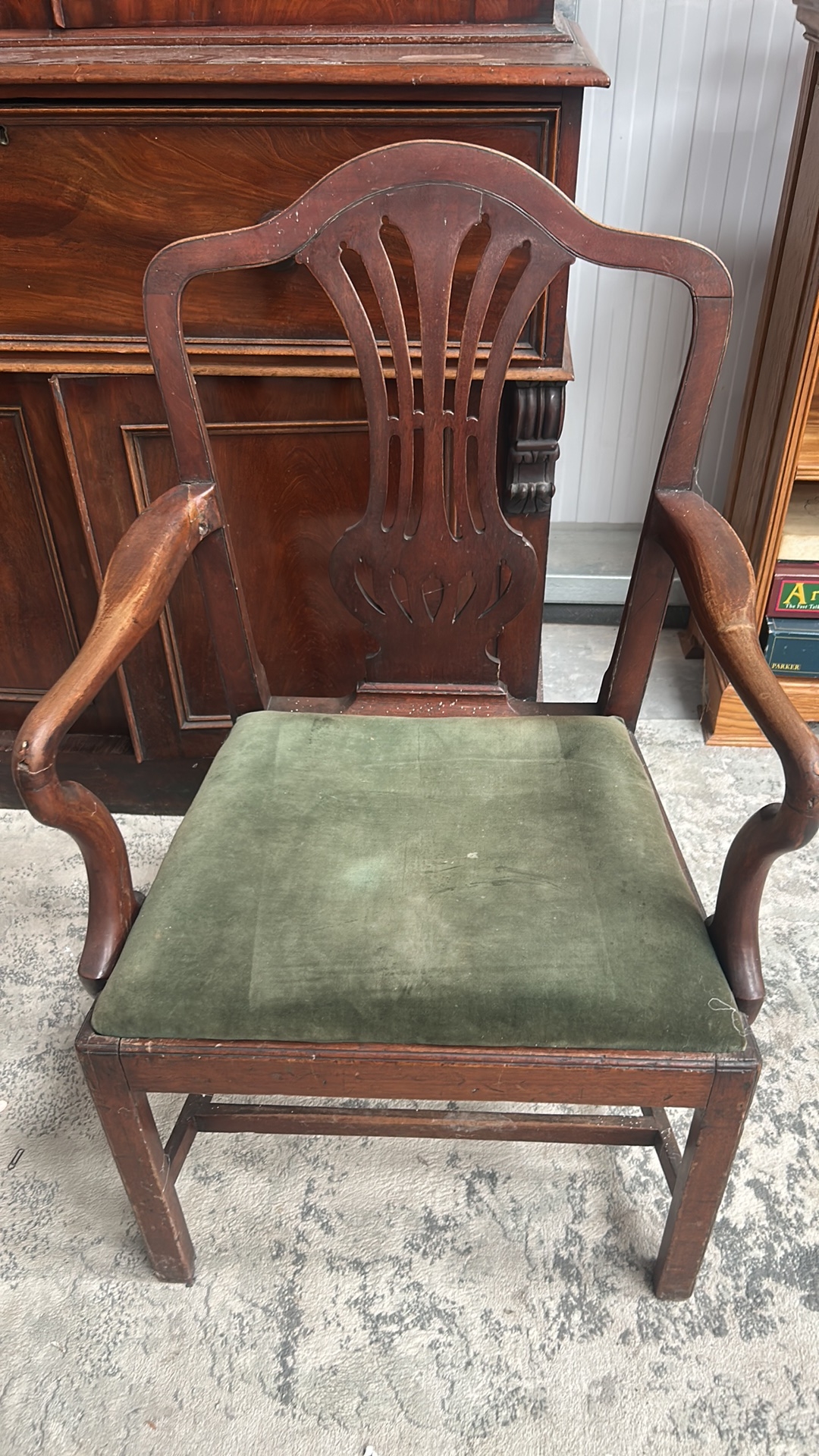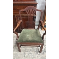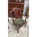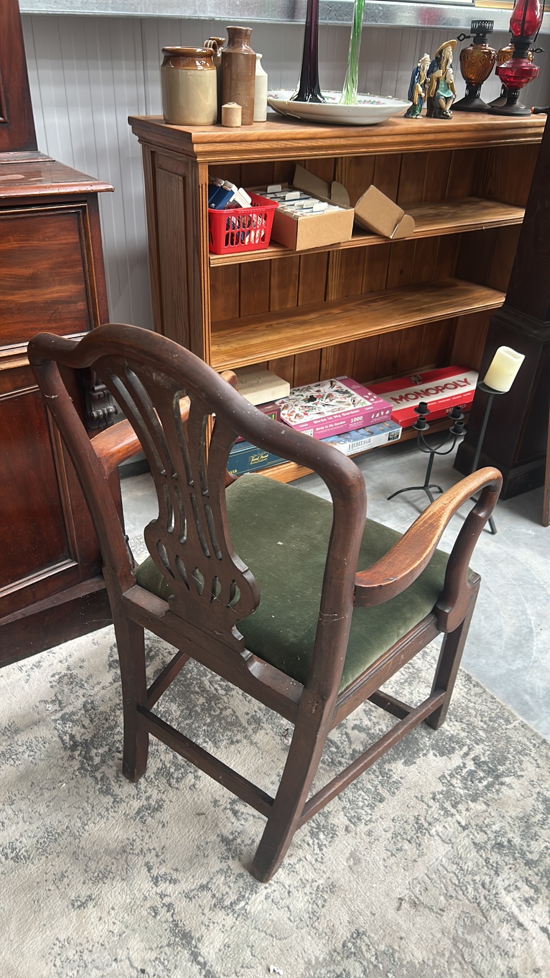 Mahogany armchair with serpentine crest rail, pierced vase splat and shaped arms, green velvet drop-in seat, square legs with H-stretchers, early 20th century Georgian revival.
