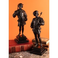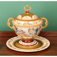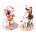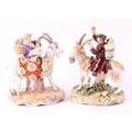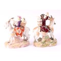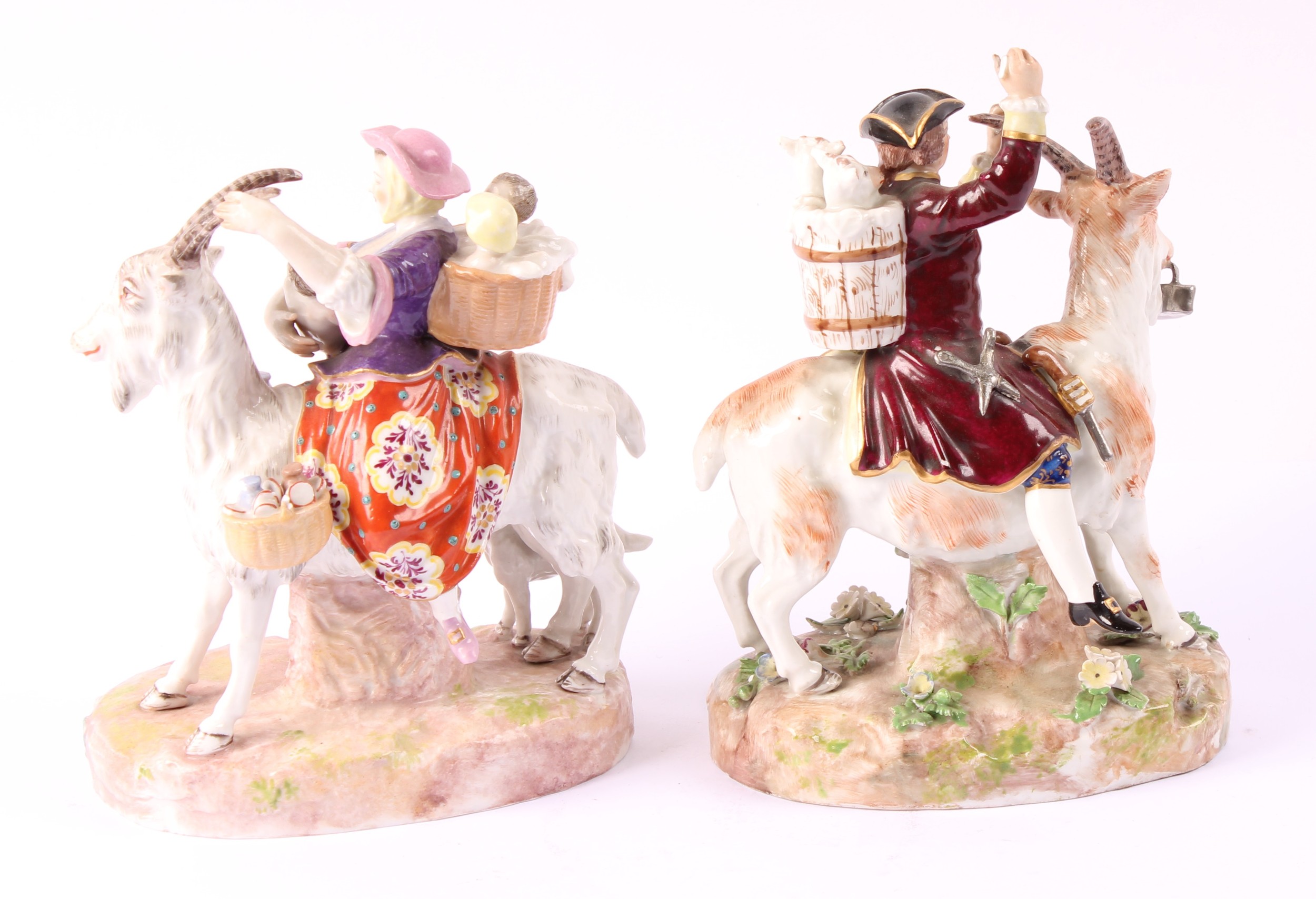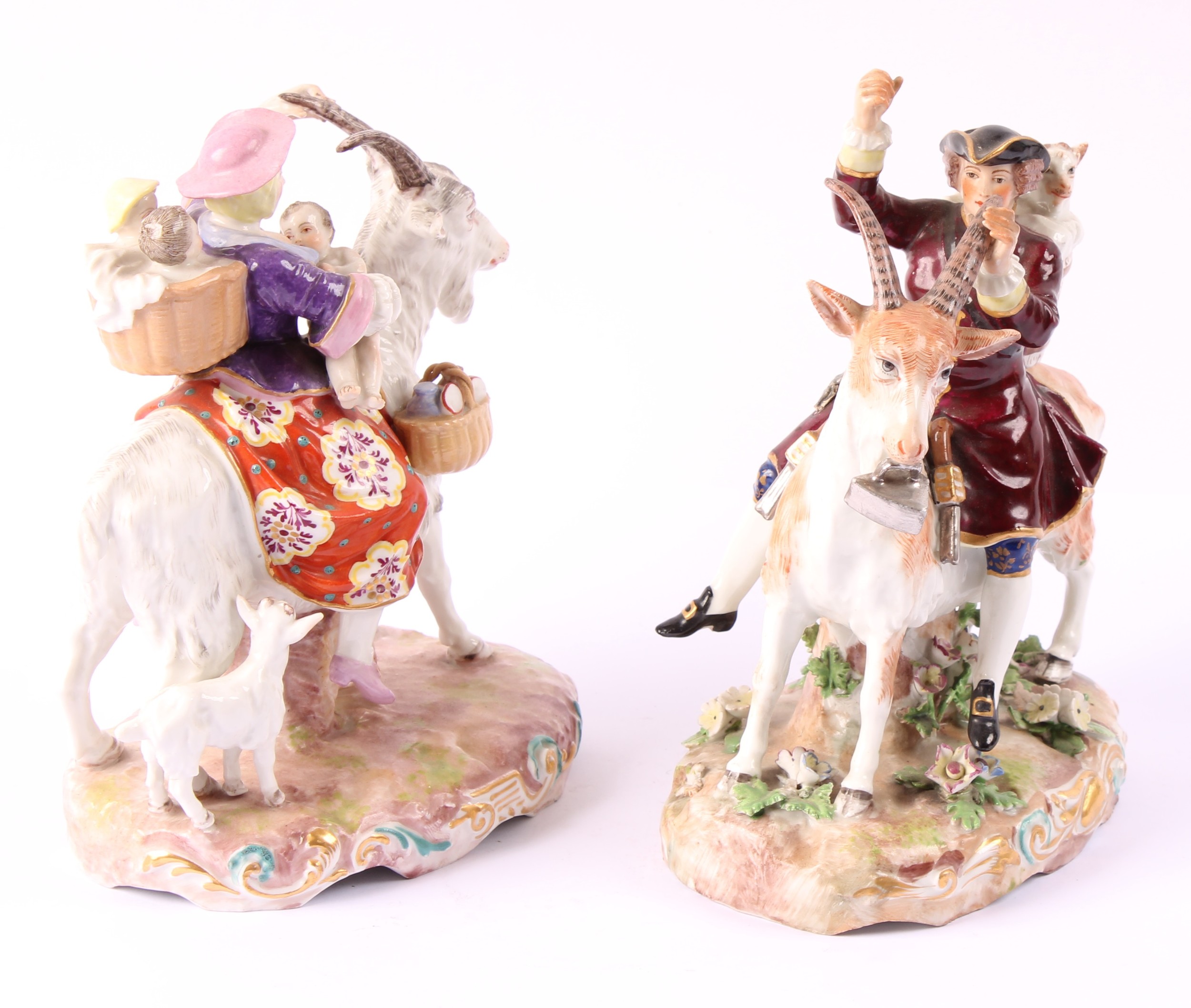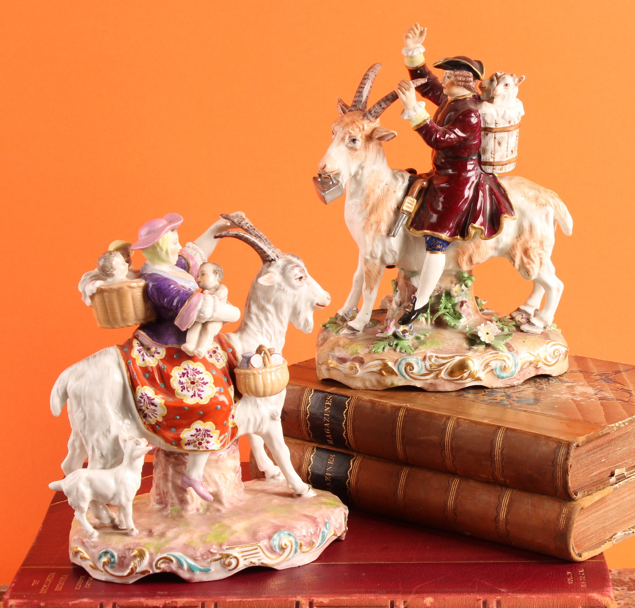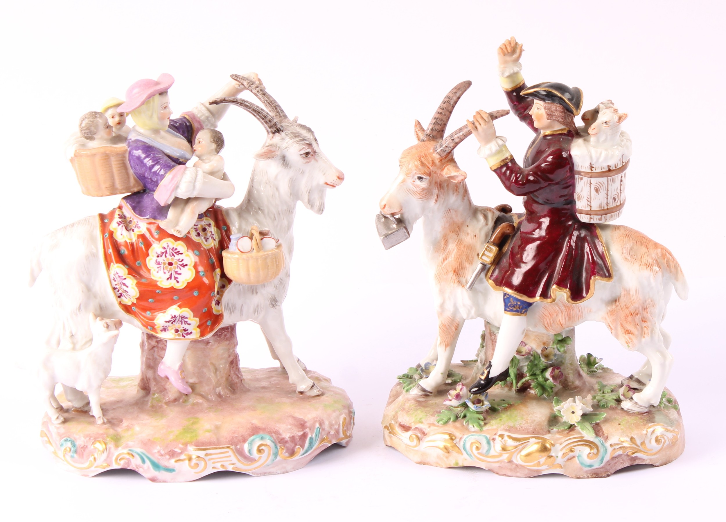 A matched pair of Continental porcelain figures, of the Welch Tailor and his Wife, both astride a goat, he with a pannier of kids on his back, she with a child in her arms and a basket with two babies on her back, painted in polychrome picked out in gilt, scroll bases, 19cm high, probably Samson Paris, 19th century
