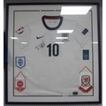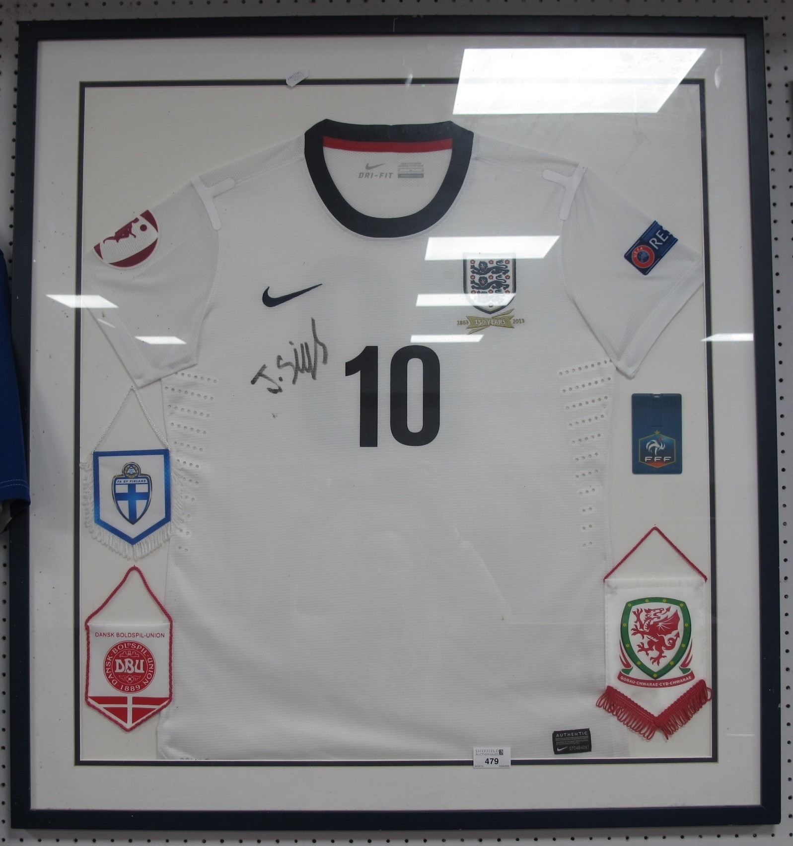 England Nike Home Shirt, bearing signature, size M, together with small pennants of Finland, Denmark & Wales plus French badge, mounted and framed, overall 84 x 79cm.