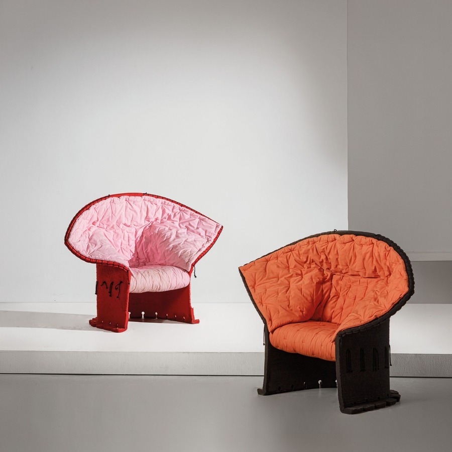 Due poltrone della serie I Feltri. Resina, materiale plastico, feltro, tessuto. Prod. Cassina, 1987 ca.