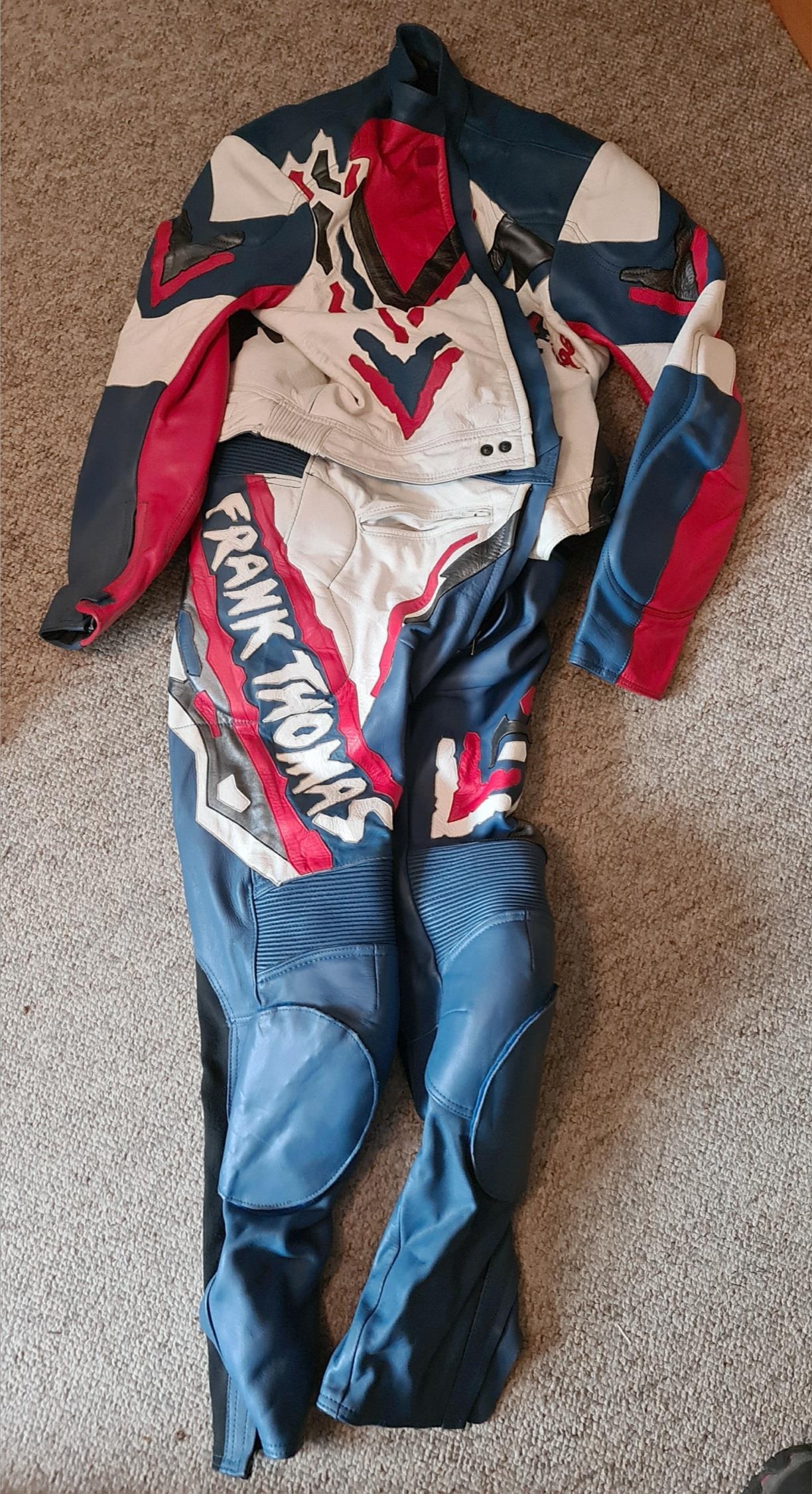 Vintage Frank Thomas 1980s Original Raw Edge Motorcycle Biker Leather Suit. UK Size 40. Worn but not used condition. Shipping is available. Please ask for a quote before bidding. Where possible we combine shipping costs. Remember, if you are the highest bidder above reserve on this Lot you have bought the item and are legally responsible for the item. Viewing is recommended in either person or via video link. Contact us to arrange.