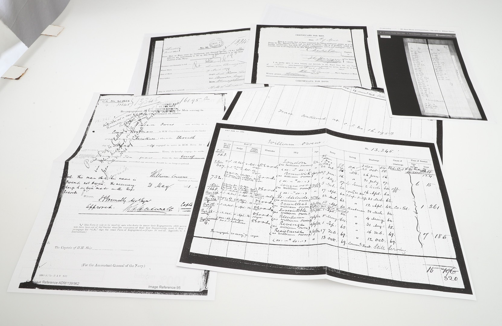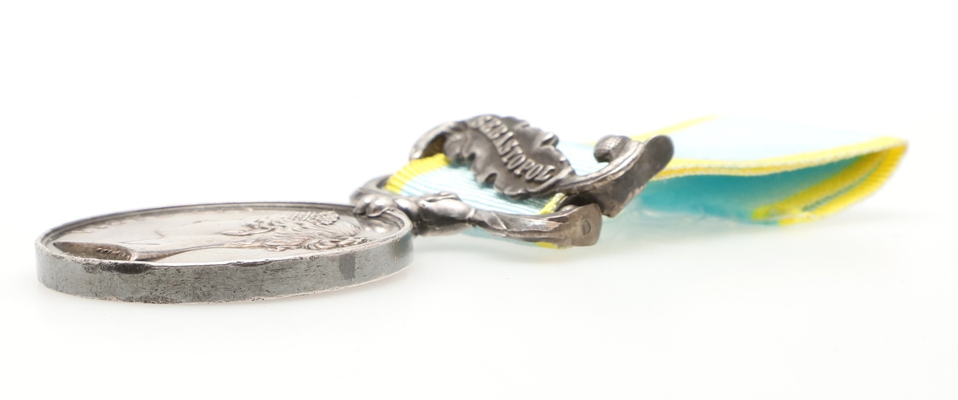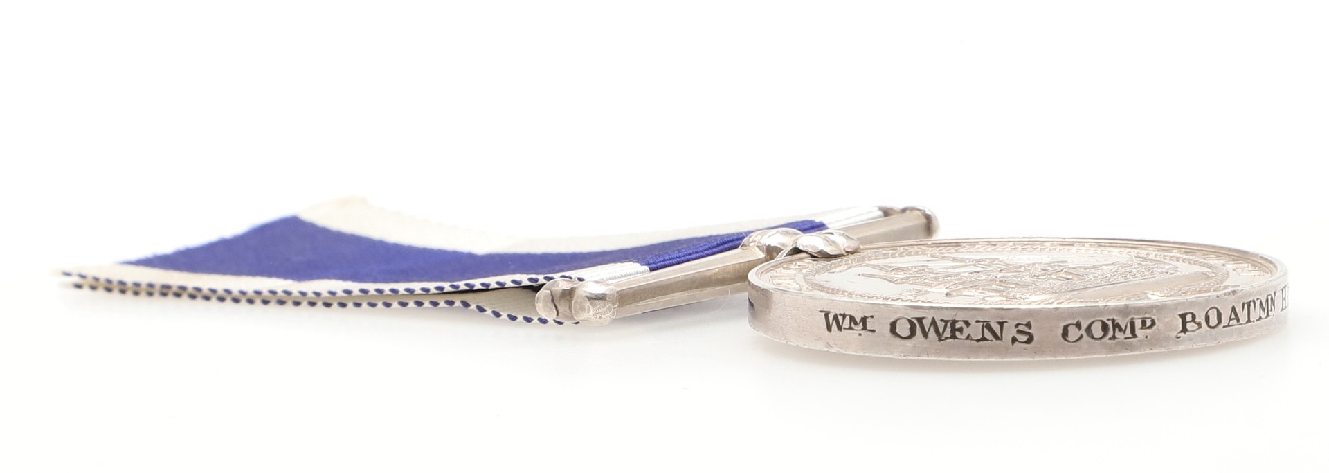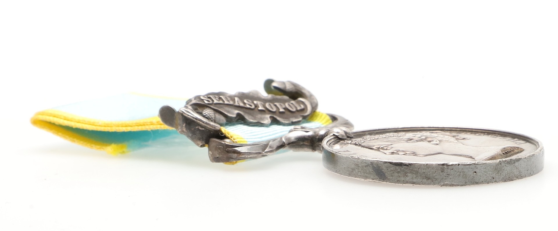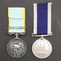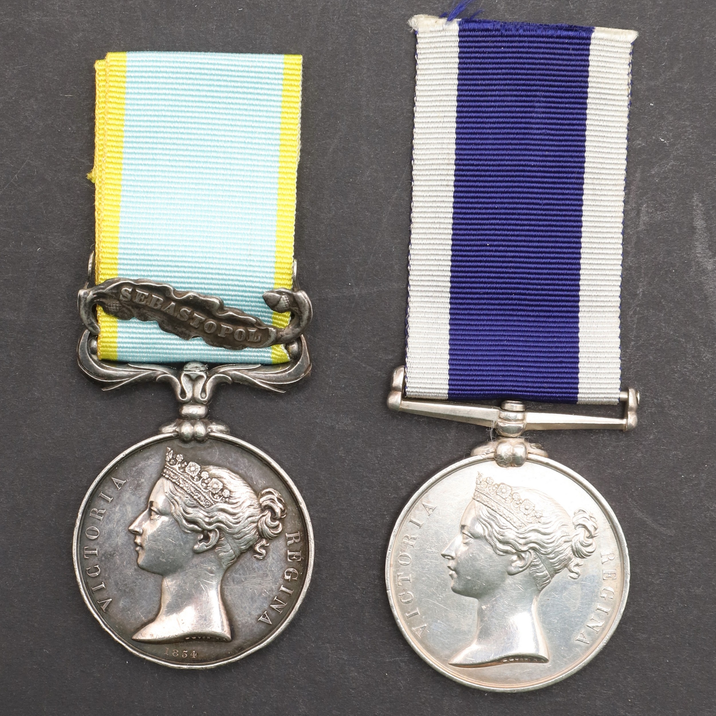 A CRIMEA AND LONG SERVICE GROUP TO H.M. COAST GUARD. A Crimea medal 1854-56 with Sebastopol clasp, unnamed as issued but attributed to the recipient of a Naval Long Service and Good Conduct medal named to Wm Owens Comd Boatmn HM Coast Gd. William Owens from Swansea was born on the 19th April 1832, he enlisted on the 1st December 1853 to serve aboard H.M.S. London, having previously served 7 years in Merchant Ships. He was given number 13345. He transferred to HMS Brunswick in 1856, was promoted to Able then Leading Seaman and later 2nd Captain of the Foretop. Discharged to the Coastguard in 1862 from HMS Royal Adelaide. Various ships followed, Petty Officer for a short period and a final posting to HMS Defence until April 1882. With extensive copied research and service records.