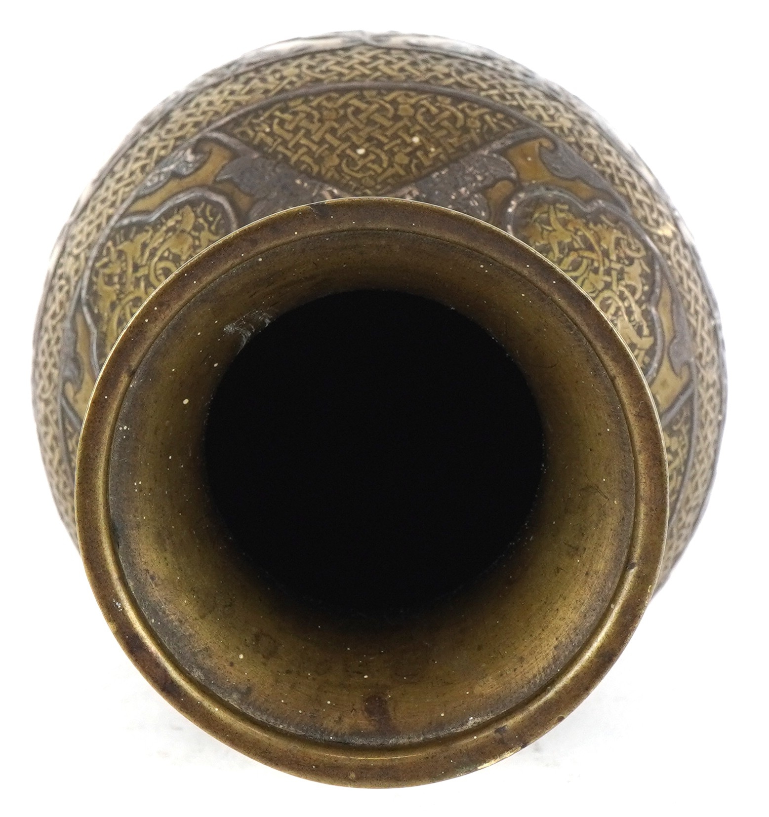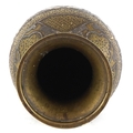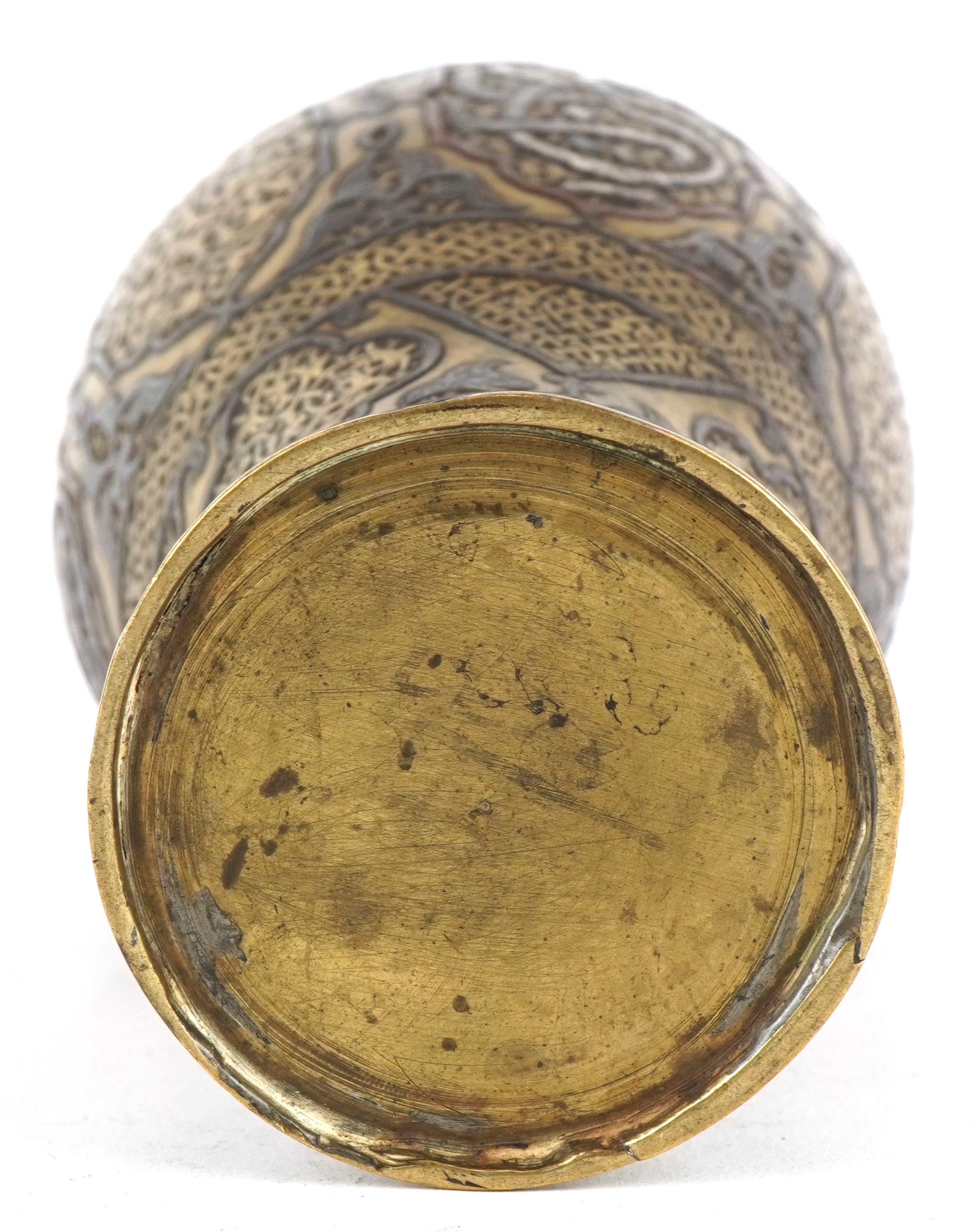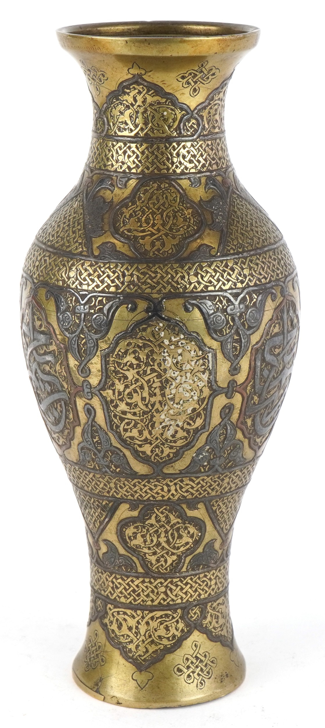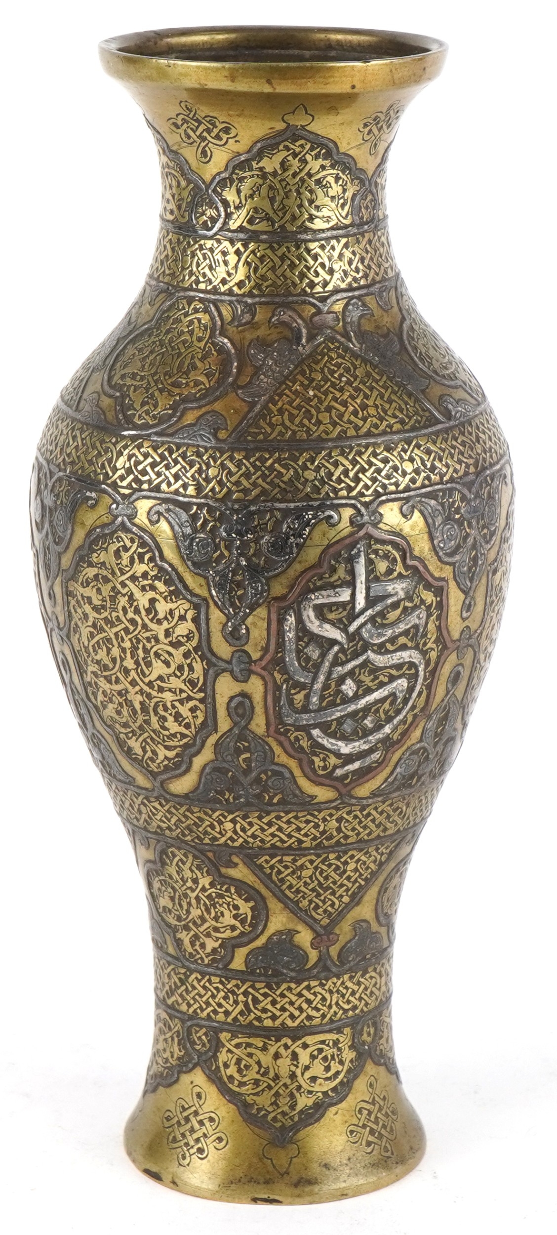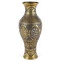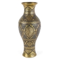 A Middle Eastern brass baluster vase with silver and copper inlay, profusely engraved with scrolling decoration and birds, 22.5cm high.