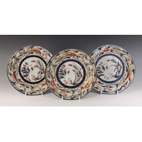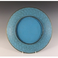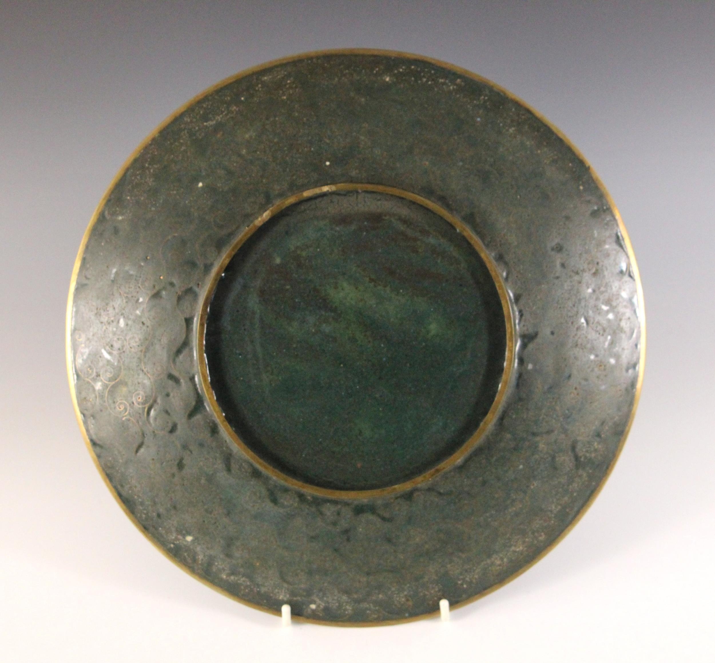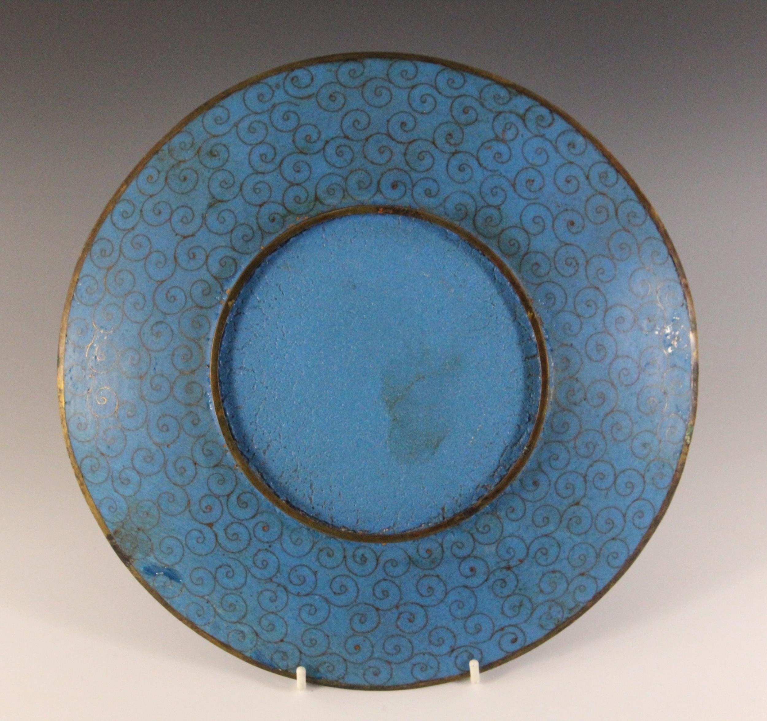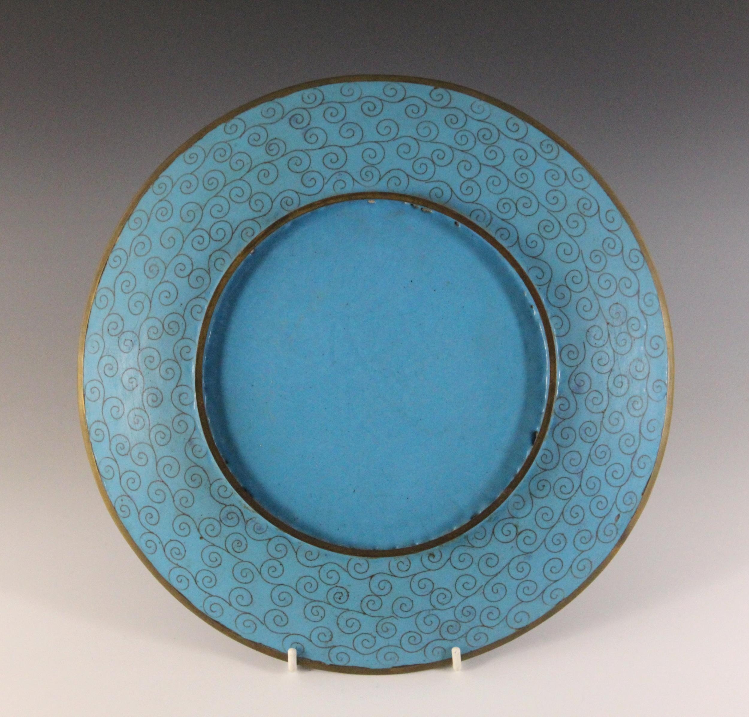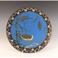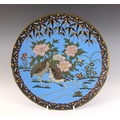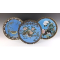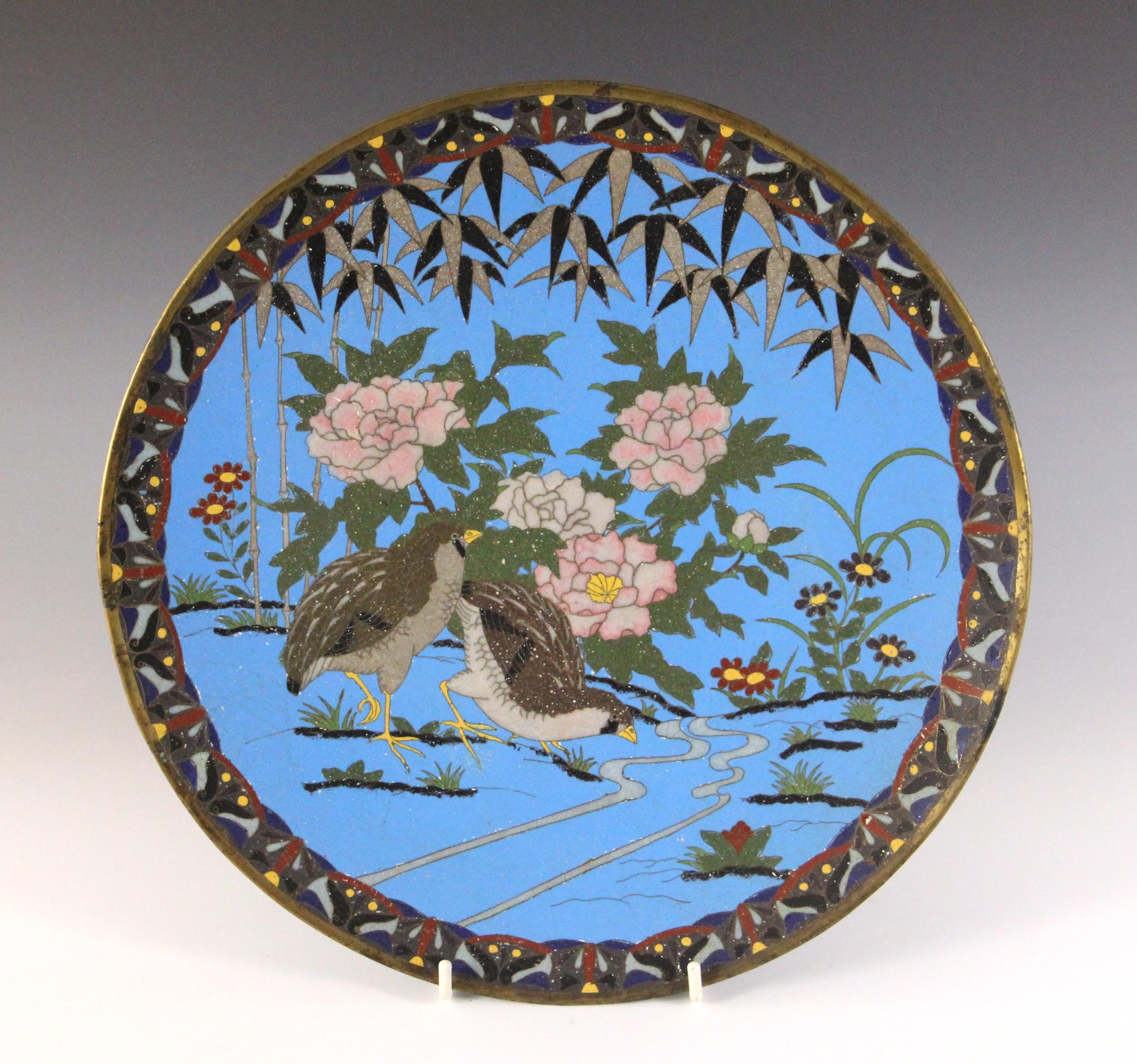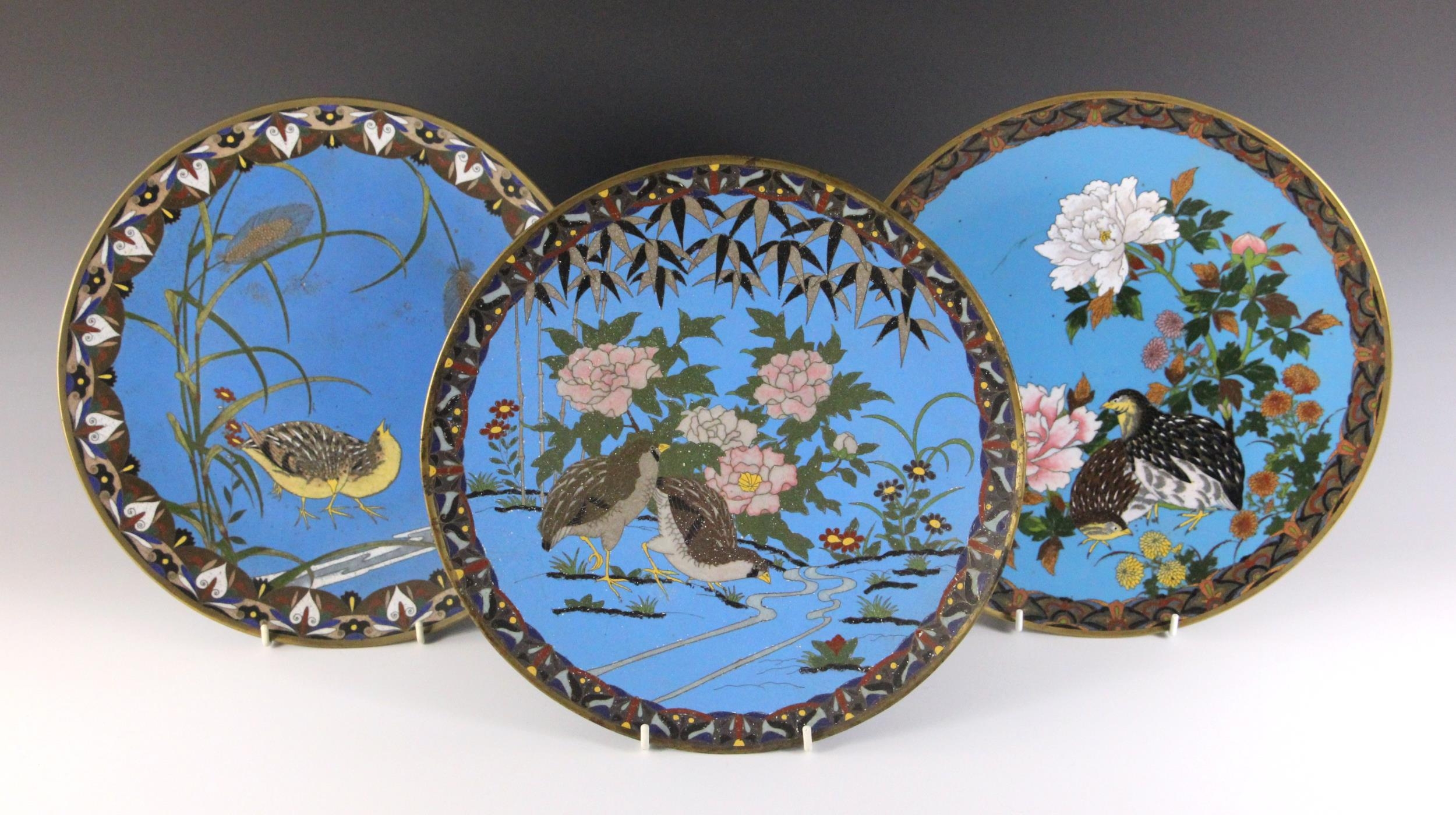 A near pair of Japanese cloisonne chargers, Meiji Period (1868-1912), each of circular form and decorated with two quail amidst floral sprays, 30.5cm diameter, with another similar (3)
