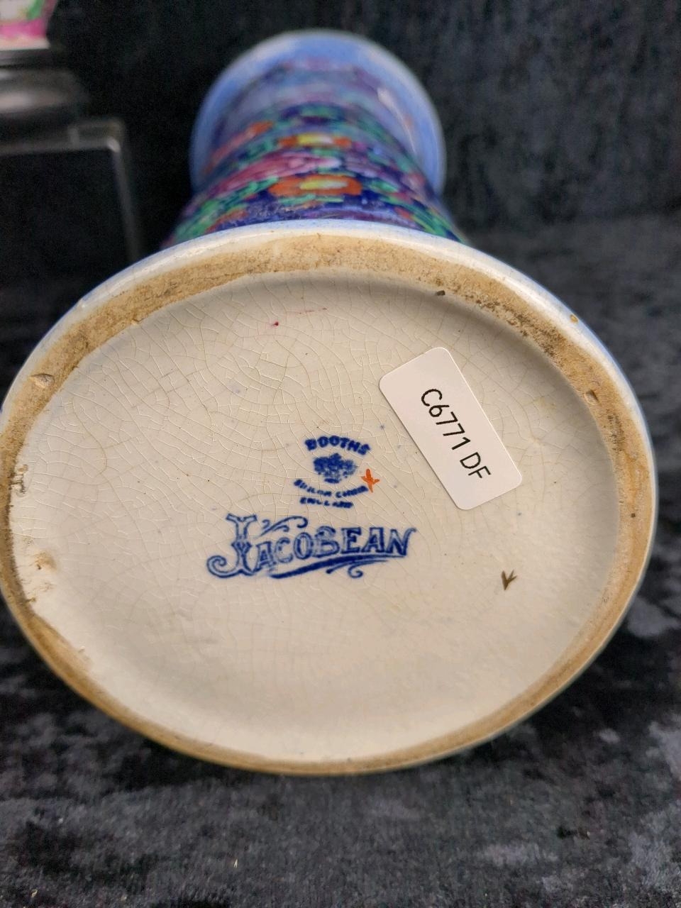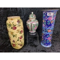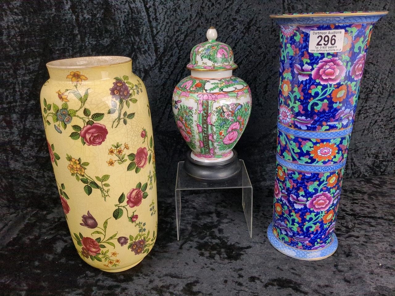 Stunning trio of vintage ceramics including a tall Booths Jacobean multi-coloured vase. Tallest approx H36cm.