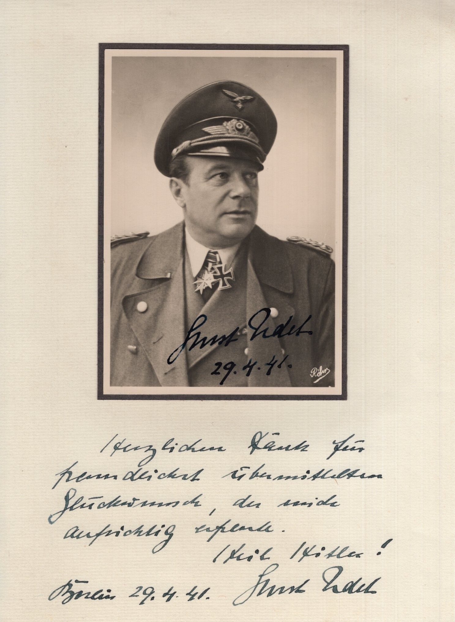 Udet, Ernst signed Hoffmann postcard set about a short message from Udet dated a few months before his death in 1941. Ernst Udet (26 April 1896 17 November 1941) was a German pilot during World War I and a Luftwaffe Colonel-General (Generaloberst) during World War II. Udet joined the Imperial German Air Service in April 1915 at the age of 19 and eventually became a notable flying ace of World War I, scoring 62 confirmed victories. The highest scoring German fighter pilot to survive that war, and the second-highest scoring after Manfred von Richthofen, his commander in the Flying Circus, Udet rose to become a squadron commander under Richthofen, and later under Hermann Göring. Udet held prominent positions in the Luftwaffe and Nazi party and his signature is very rare!