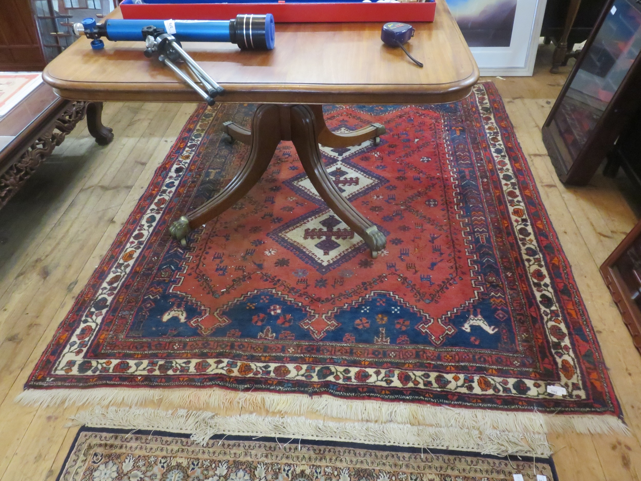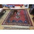 Red and blue fringed rug, 81 by 66 inches