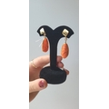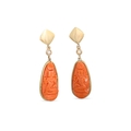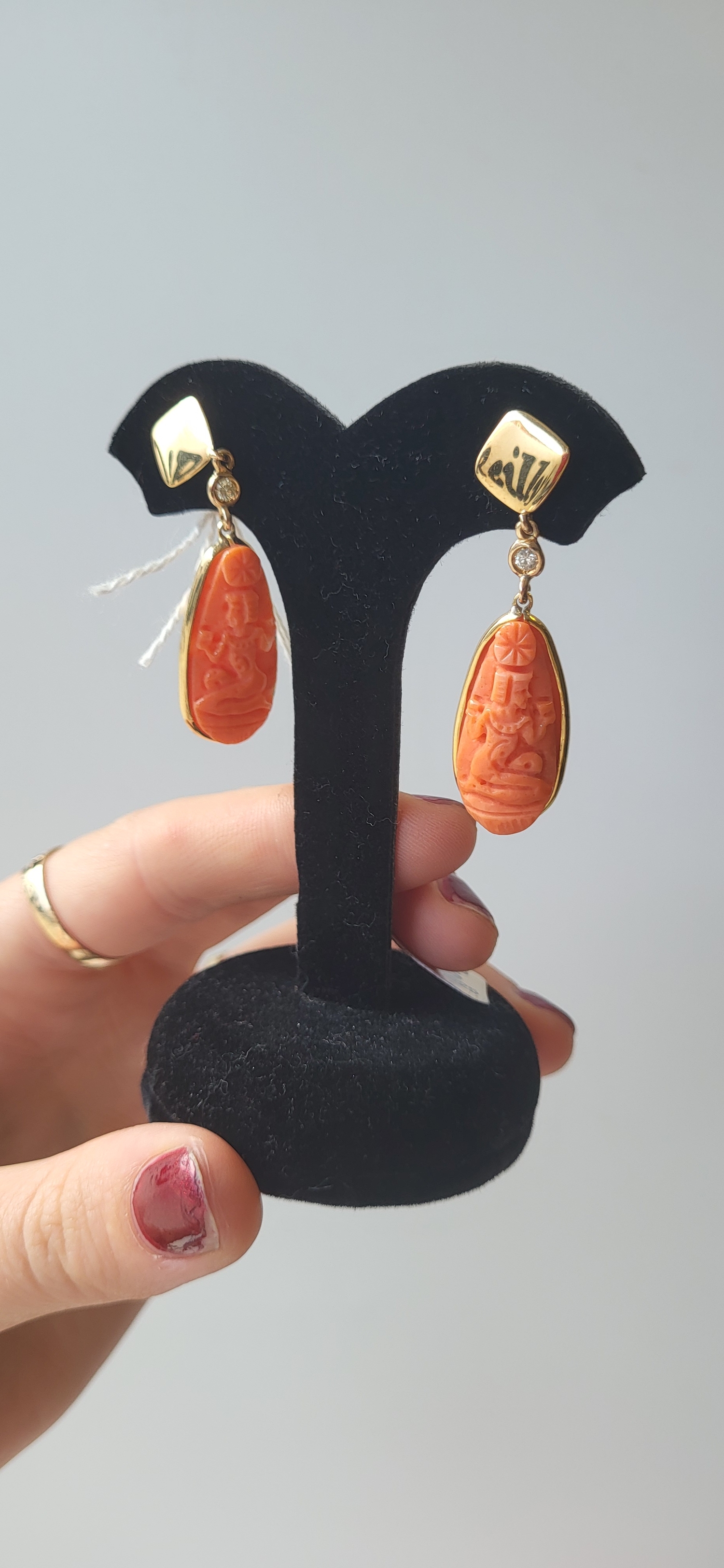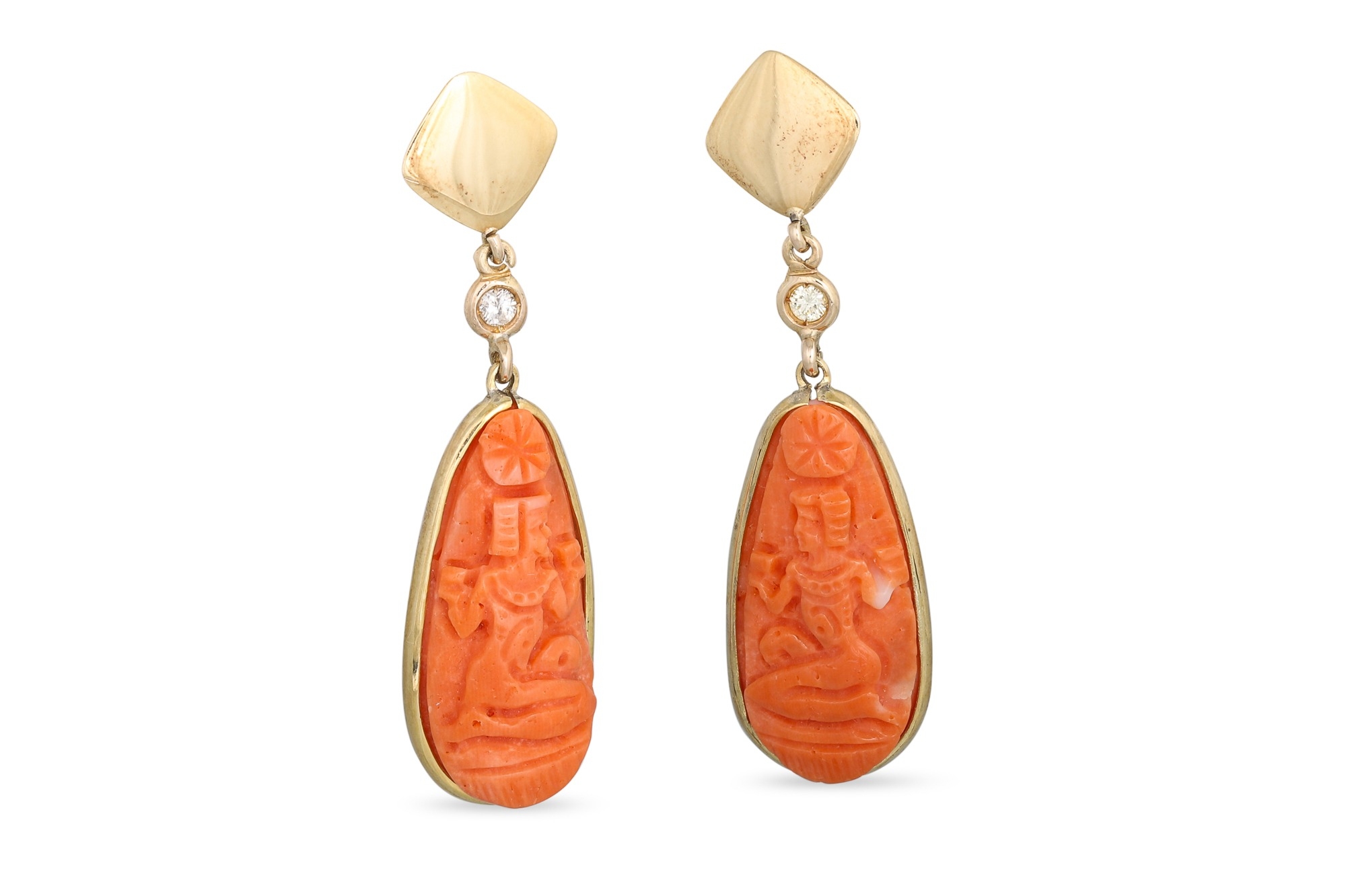 A PAIR OF CORAL DROP EARRINGS, with carved figures, mounted in 18ct yellow gold, 2" drop