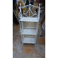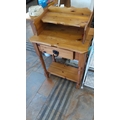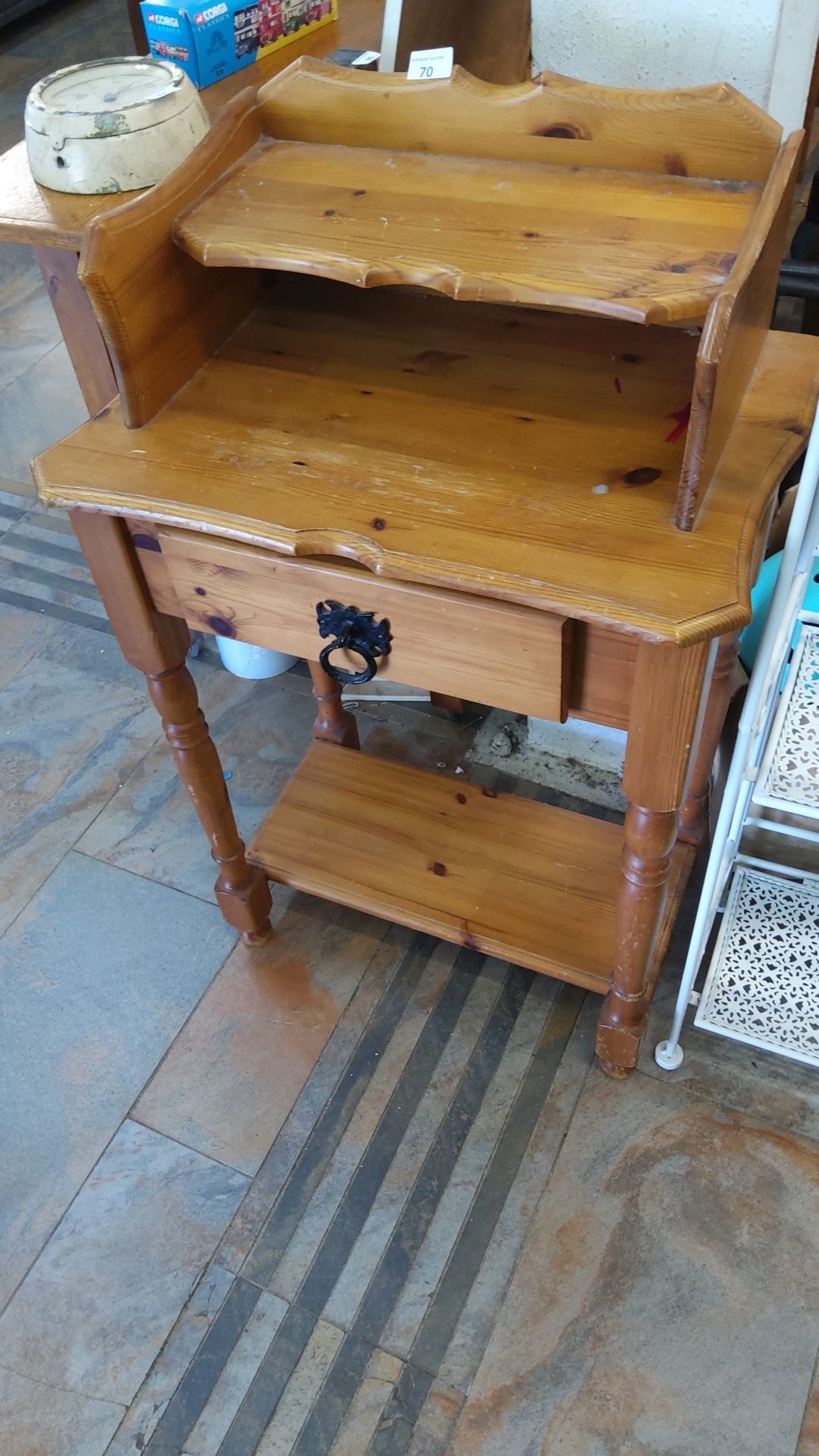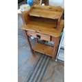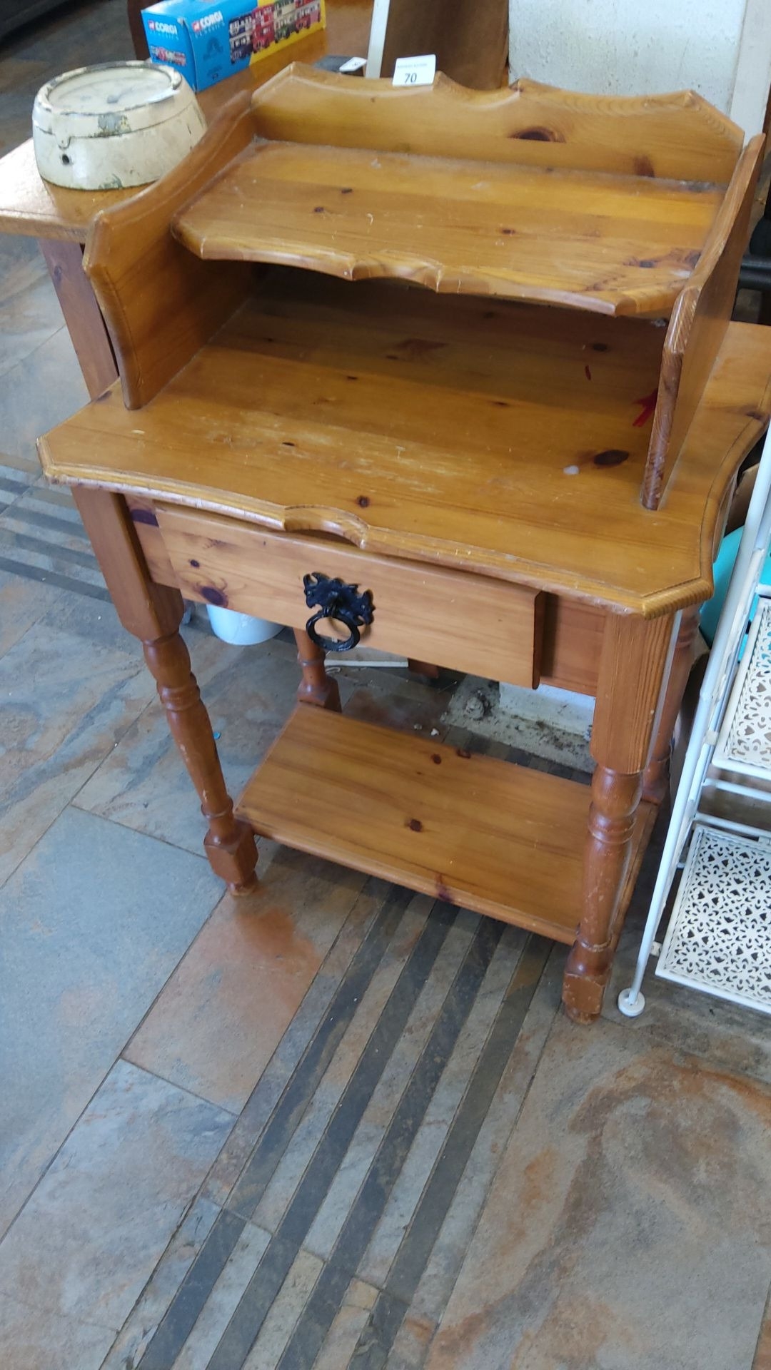Rustic pine washstand or bedside cabinet, scalloped gallery back with shaped mid-tier, single frieze drawer with black iron ring handle, turned legs and lower shelf.