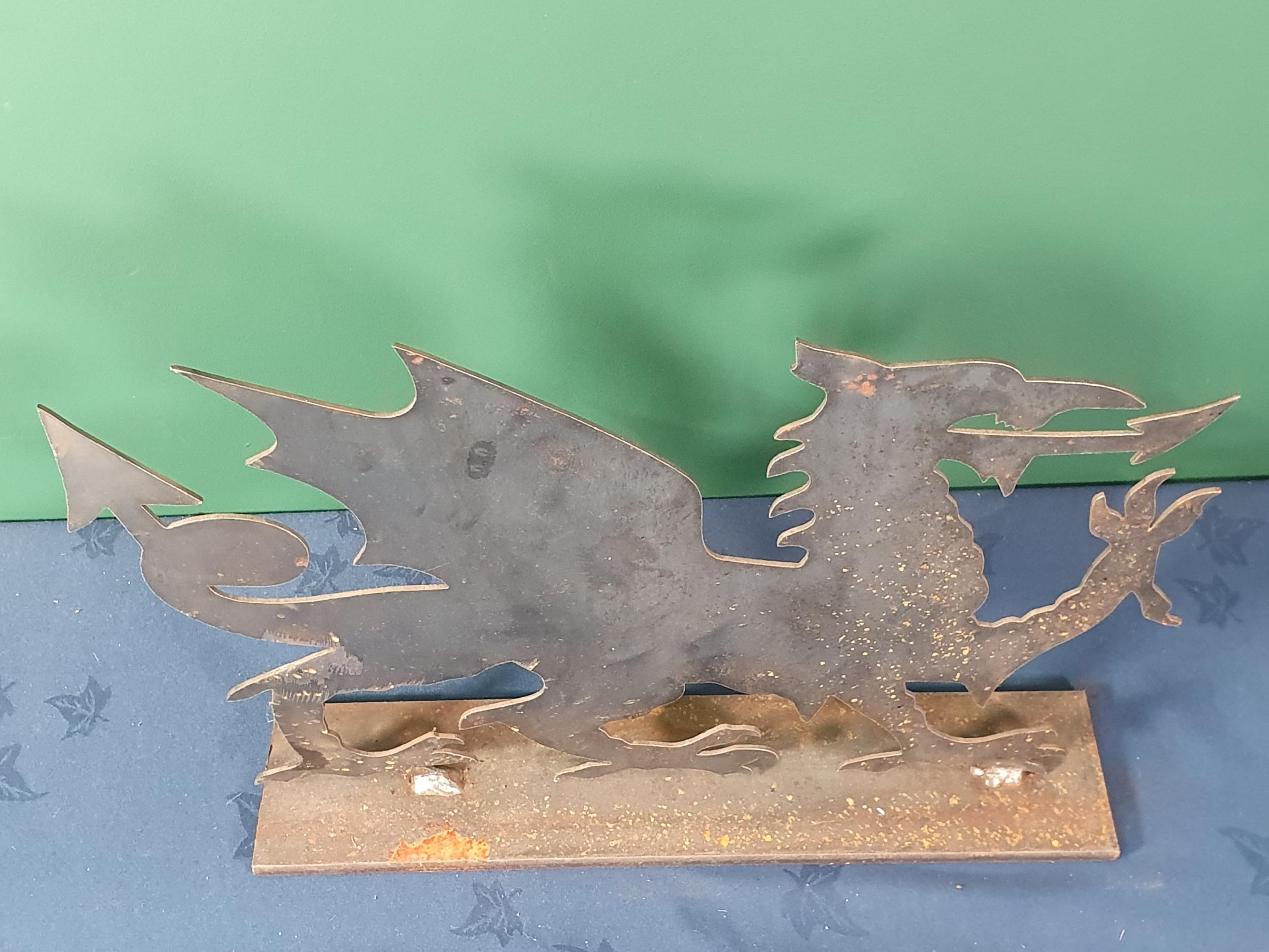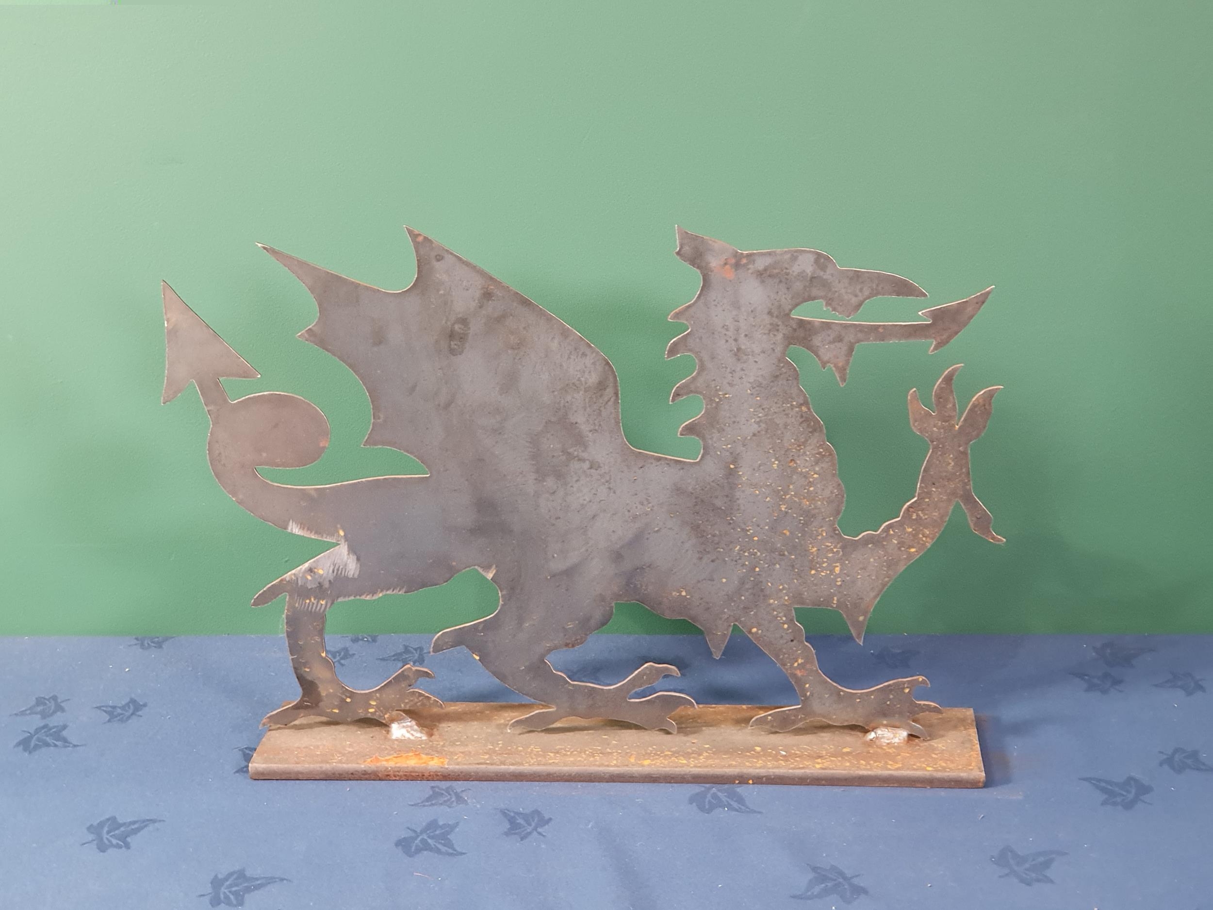 A metal CYMRU Welsh Dragon on plinth base, 13"High x 20"Wide. (R8).