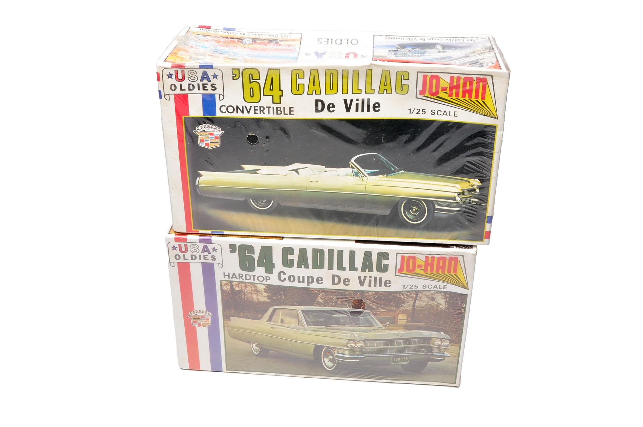 Jo-Han 1/25 plastic model vehicle kits x 2, comprising Cadillac hardtop / convertible. Both still sealed.