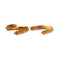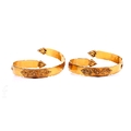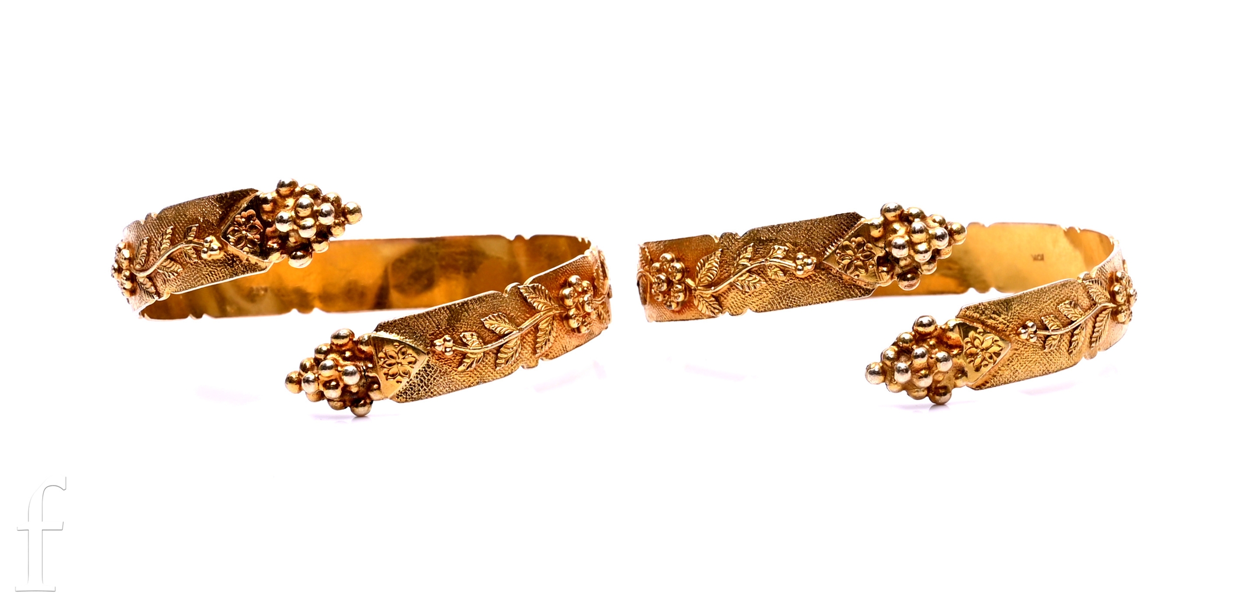 A pair of gold bangles, with foliate detail against a textured ground, total weight 65g.
