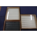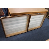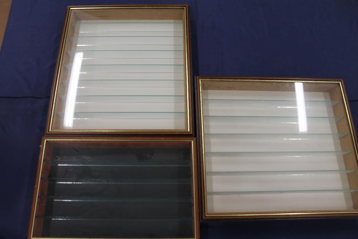 Three multi-shelf wall cabinets with glazed panel door, previously used to display model railway and model vehicles but would also support whisky miniatures or similar small collector's items, the largest 60cm x 68cm. (3)