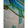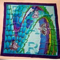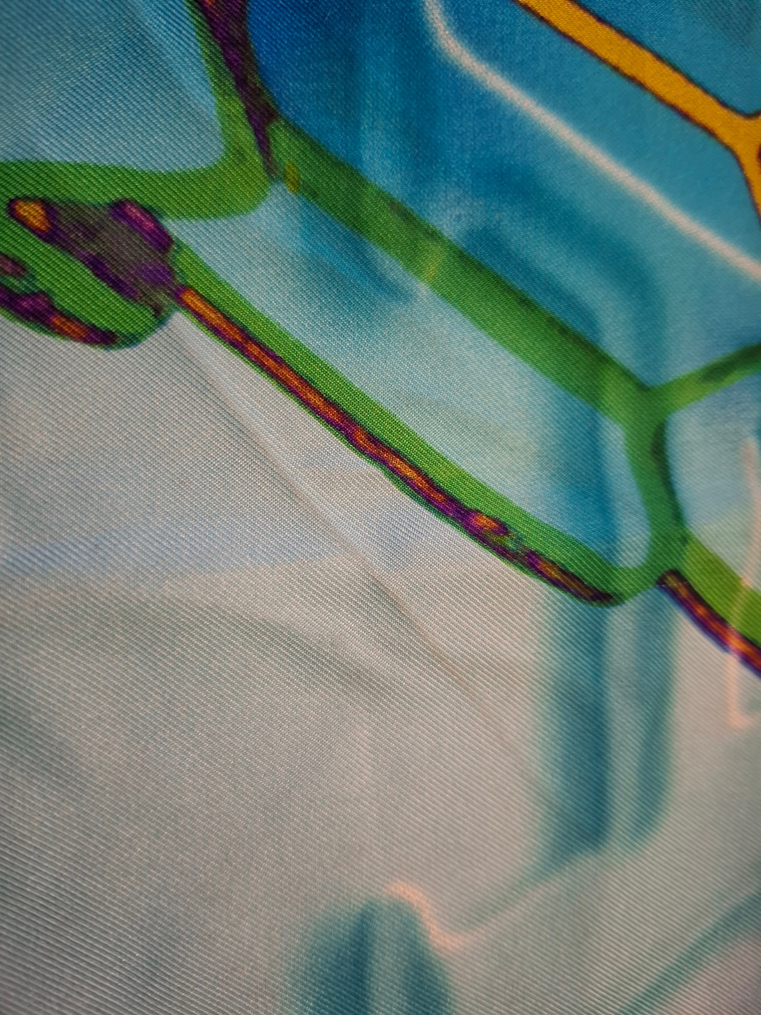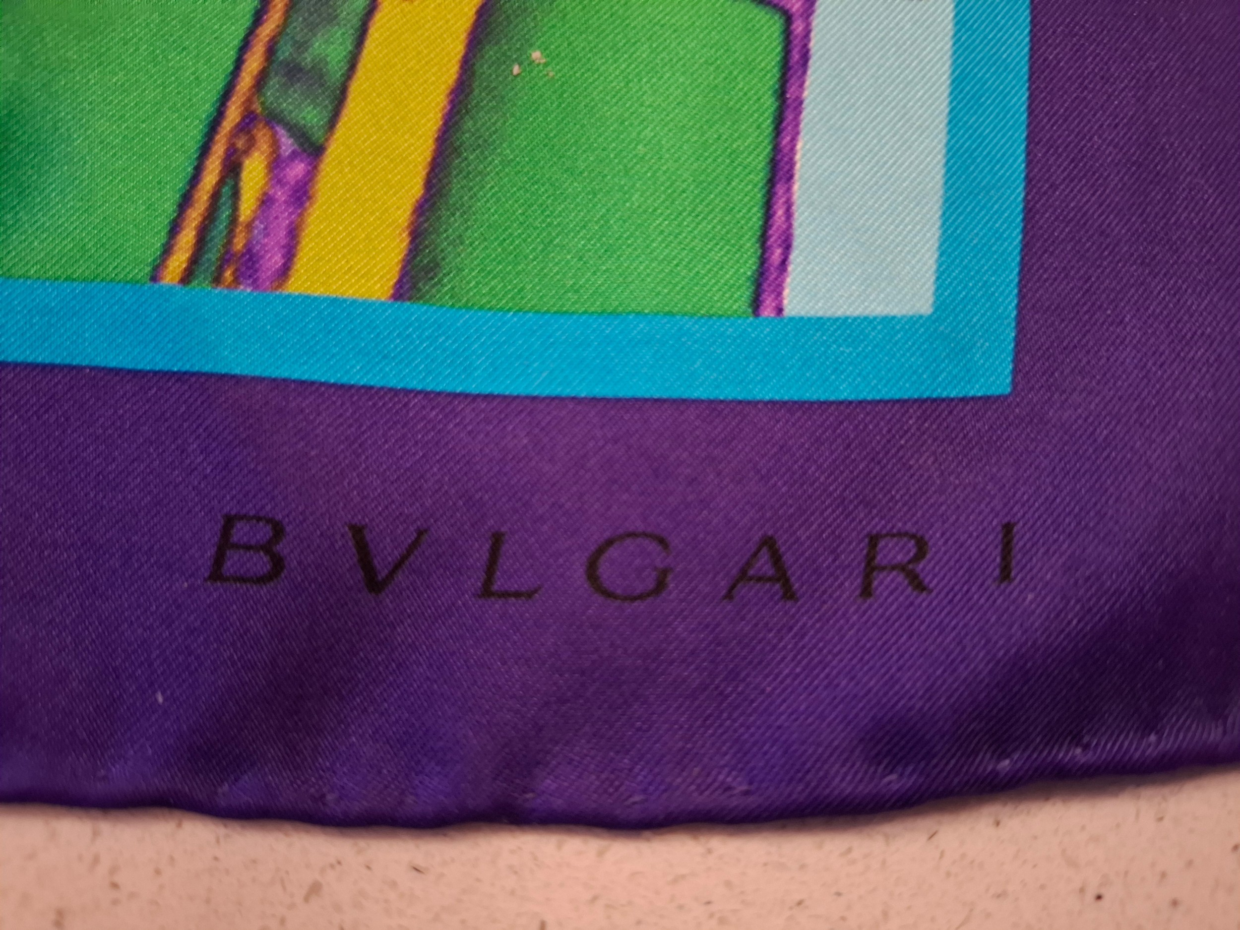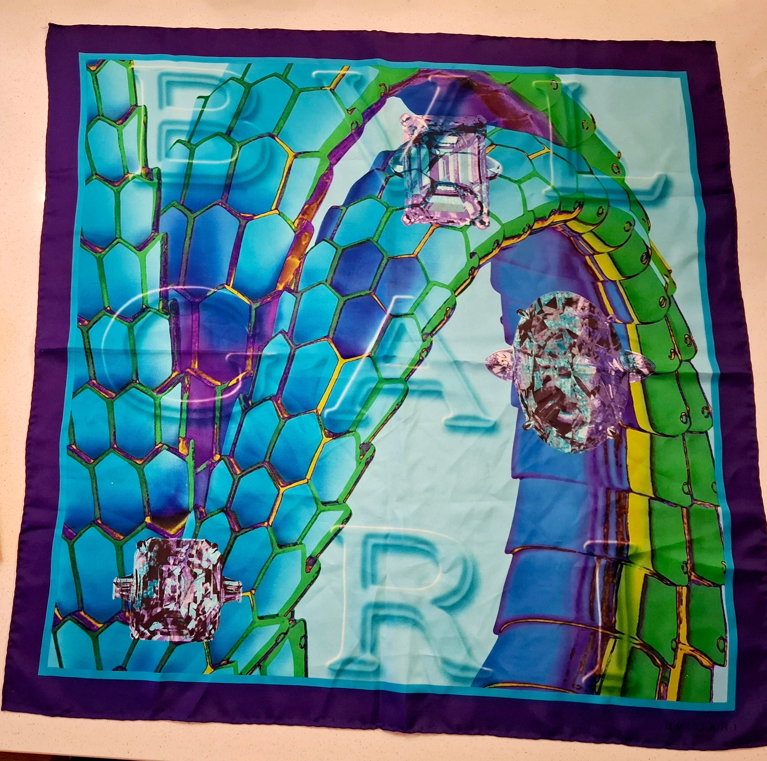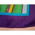 Bulgari/Bvlgari- A silk scarf in tones of turquoise, purple, green and gold having the brand name in large letters to the centre and in one corner with images of diamonds to the centre, hand-rolled edges, approx 68cm x 68cm. Location:A4M If there is no condition report, please request.