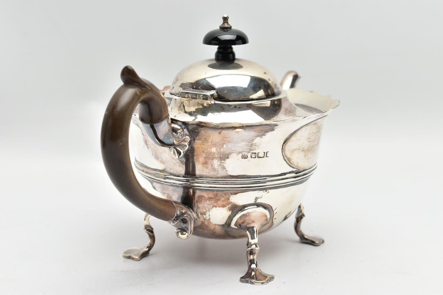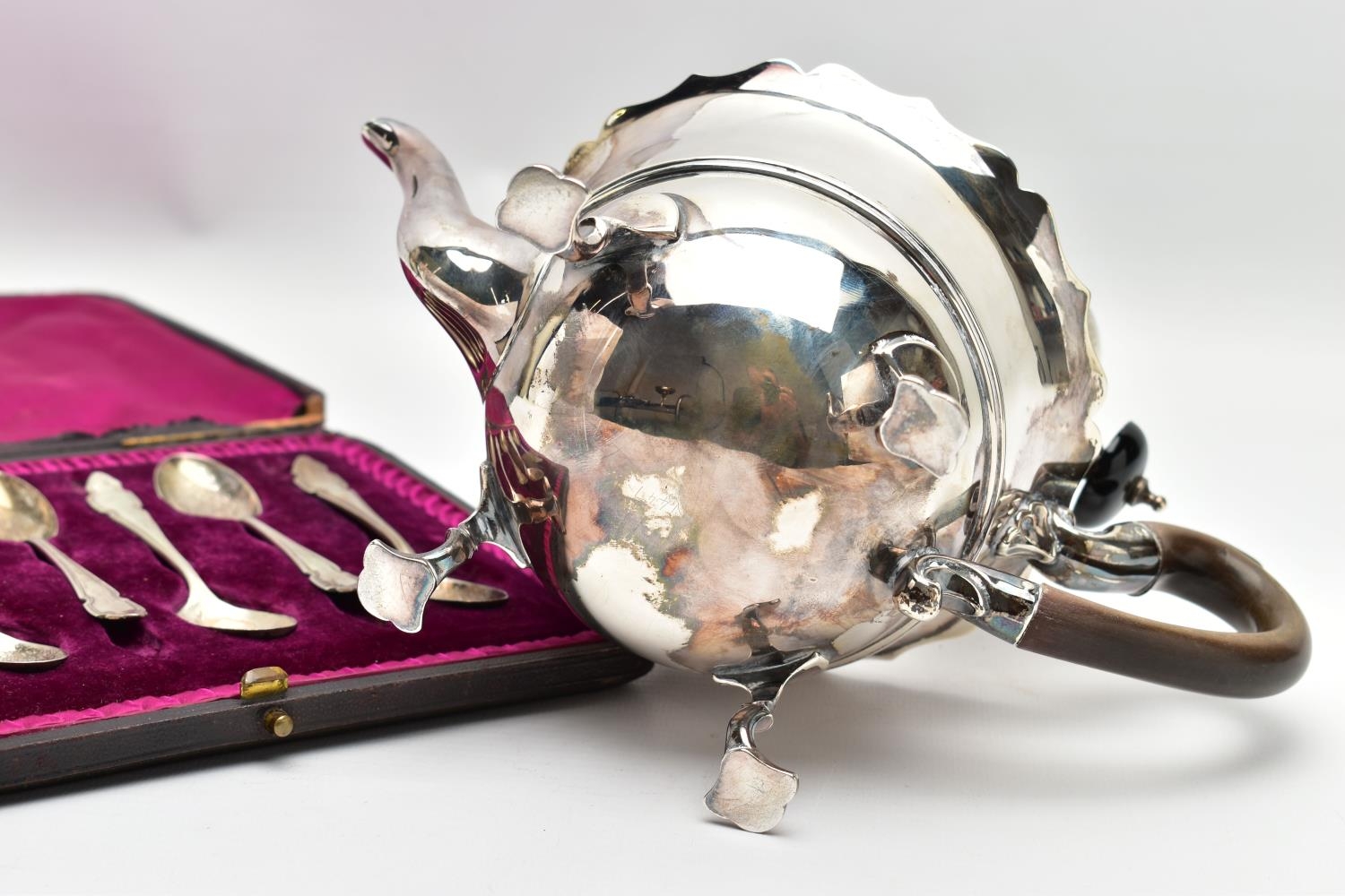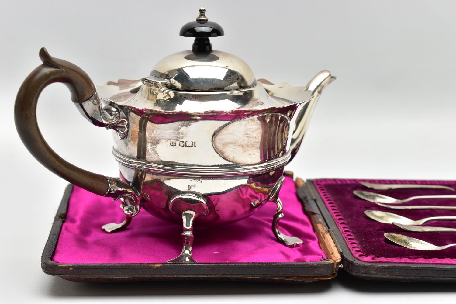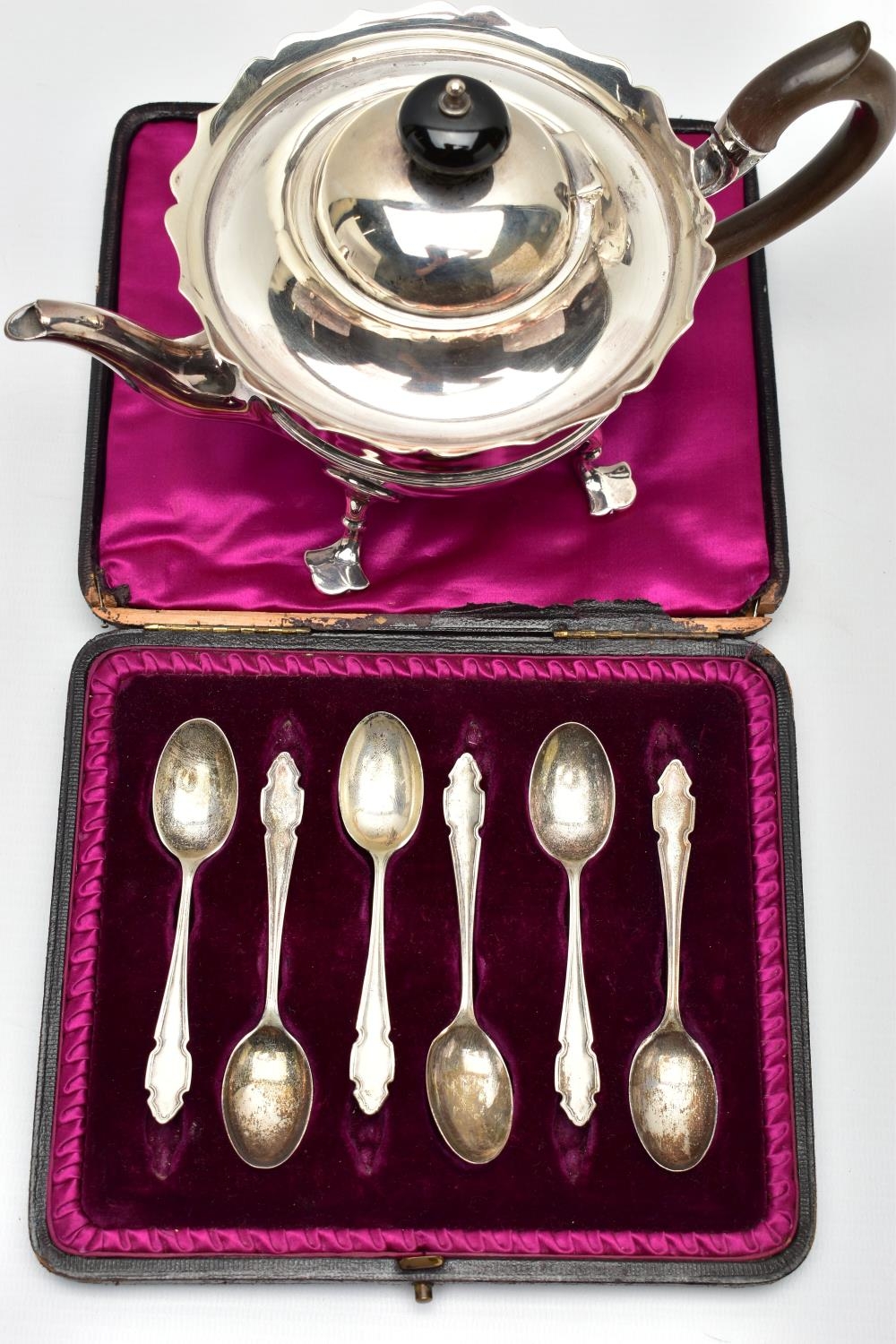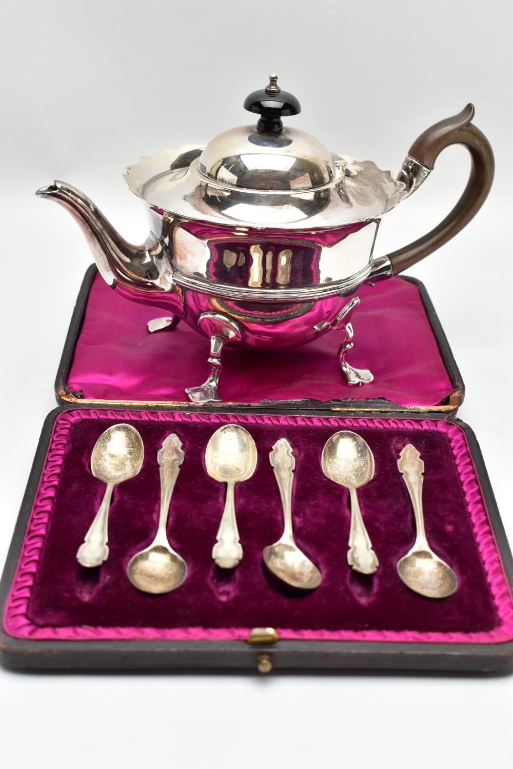 AN EARLY 20TH CENTURY SILVER TEAPOT AND A SET OF SIX GEORGE V SILVER COFFEE SPOONS IN AN UNASSOCIATED CASE, the teapot of circular form with wavy rim, black and brown bakelite fitments, reeded girdle, on four cabriole legs with pad feet, makers Fenton Brothers Ltd, Sheffield, date letter rubbed, the teaspoons makers Cooper Brothers & Sons Ltd, Sheffield 1933, gross weight 16ozt, 497.7 grams (2) (Condition report: the teapot has had an oval section cut out and overlaid with an oval shape, this is clearly visible from the interior, the feet rock slightly on a level surface, the handle and finial are different colours, the teaspoons are not original to the case)