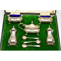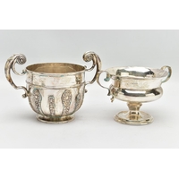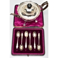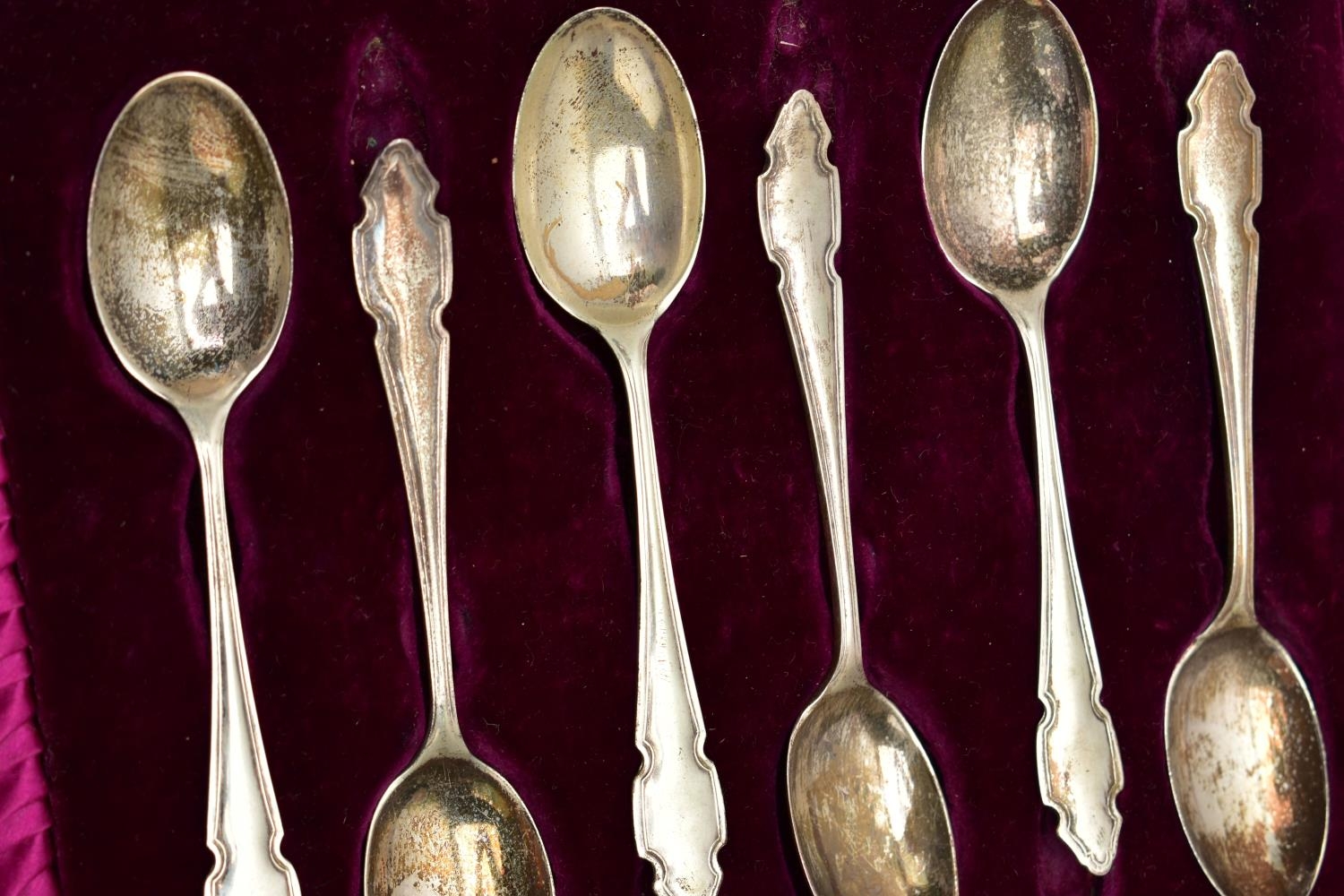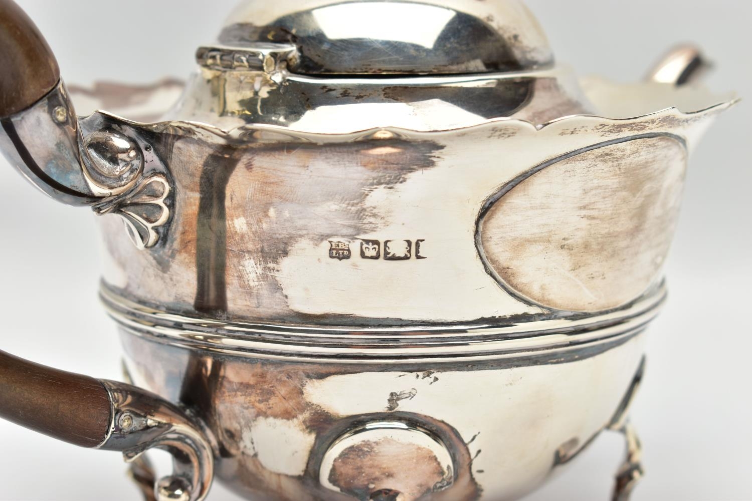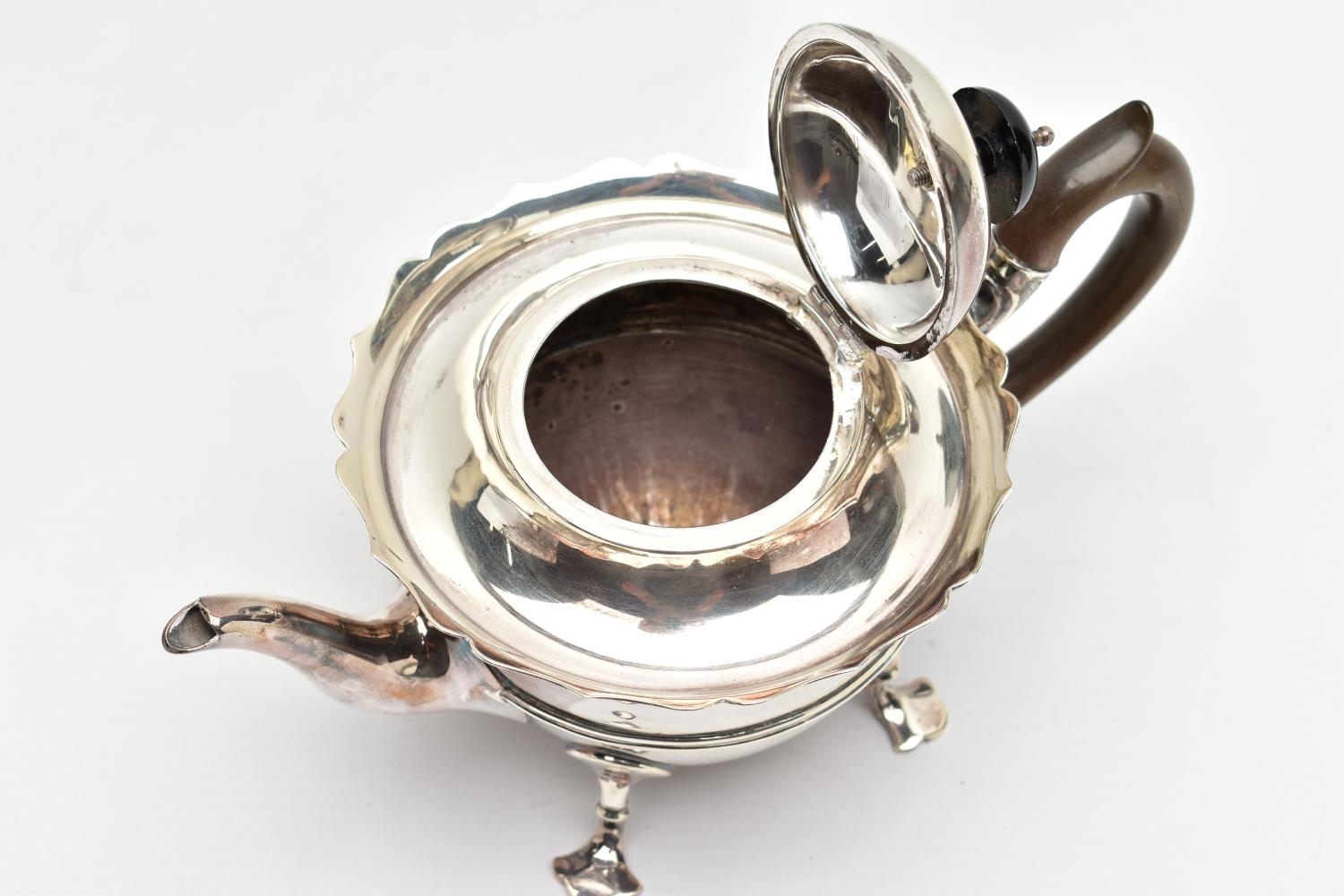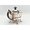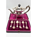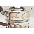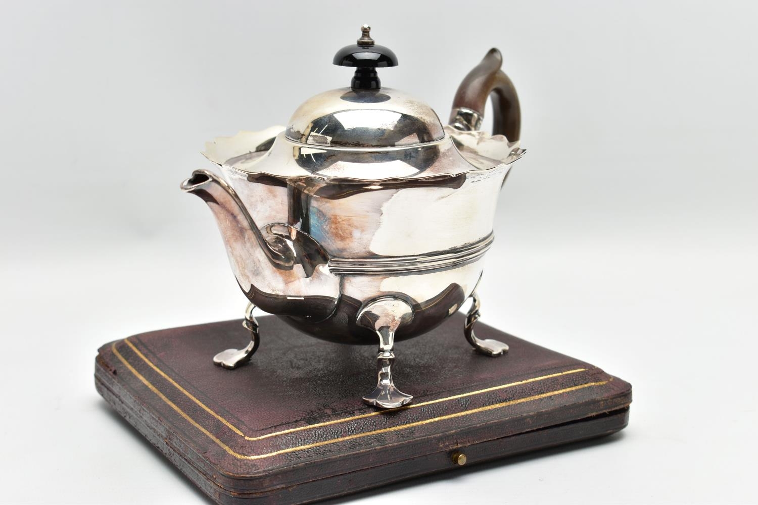 AN EARLY 20TH CENTURY SILVER TEAPOT AND A SET OF SIX GEORGE V SILVER COFFEE SPOONS IN AN UNASSOCIATED CASE, the teapot of circular form with wavy rim, black and brown bakelite fitments, reeded girdle, on four cabriole legs with pad feet, makers Fenton Brothers Ltd, Sheffield, date letter rubbed, the teaspoons makers Cooper Brothers & Sons Ltd, Sheffield 1933, gross weight 16ozt, 497.7 grams (2) (Condition report: the teapot has had an oval section cut out and overlaid with an oval shape, this is clearly visible from the interior, the feet rock slightly on a level surface, the handle and finial are different colours, the teaspoons are not original to the case)