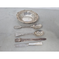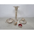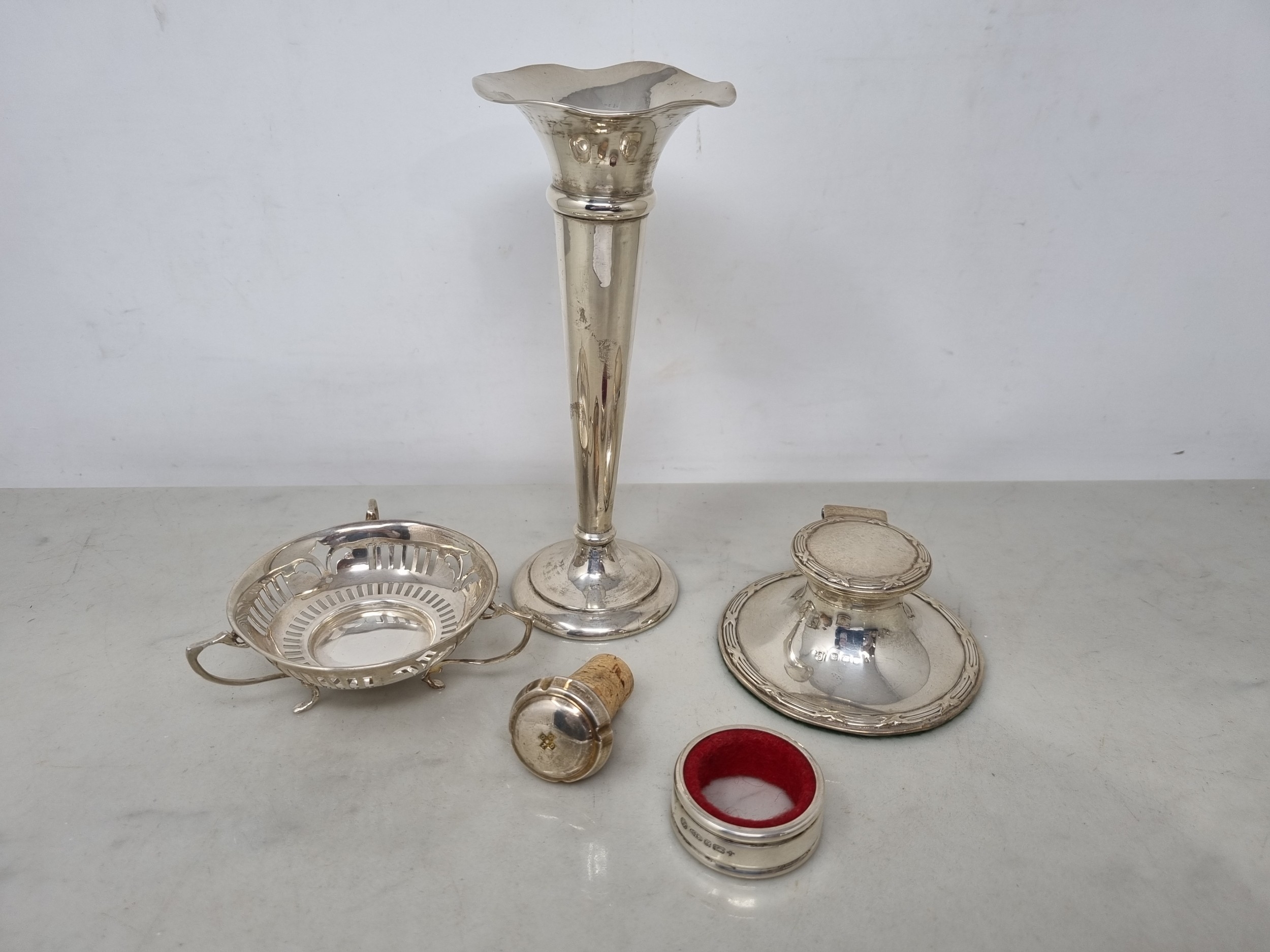 An Edward VII silver capstan Inkwell, Birmingham 1906, a Spill Vase, Birmingham 1905, three handled Trinket Dish, Birmingham 1916, silver mounted Cork and a Wine Ring