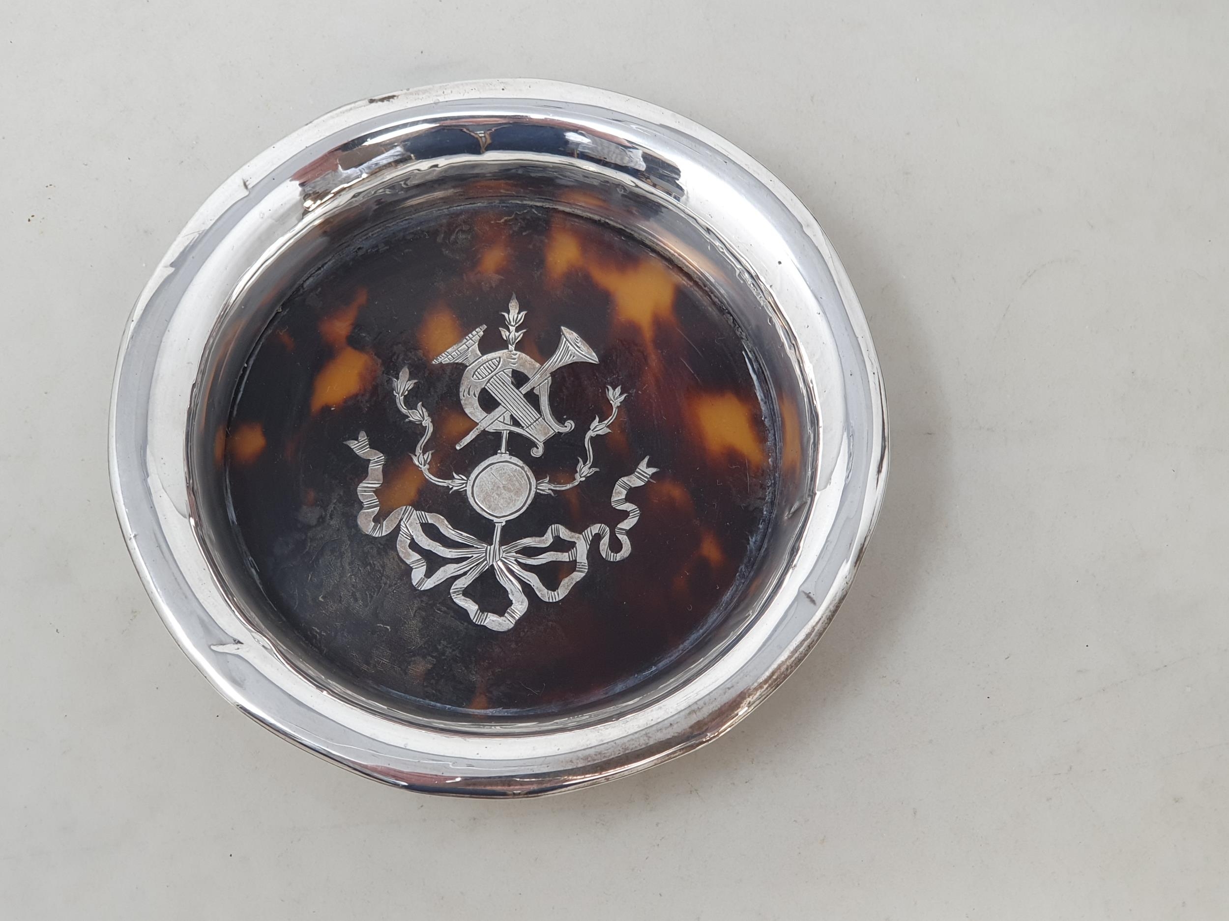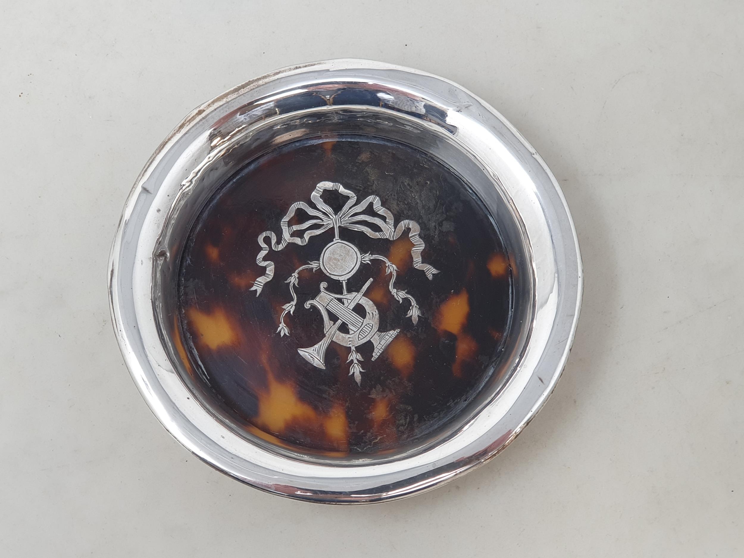 A George V silver and tortoiseshell circular Dish with musical trophy and ribbon decoration, London 1916, and a tortoiseshell rectangular Tray with silver inlay
