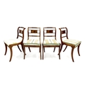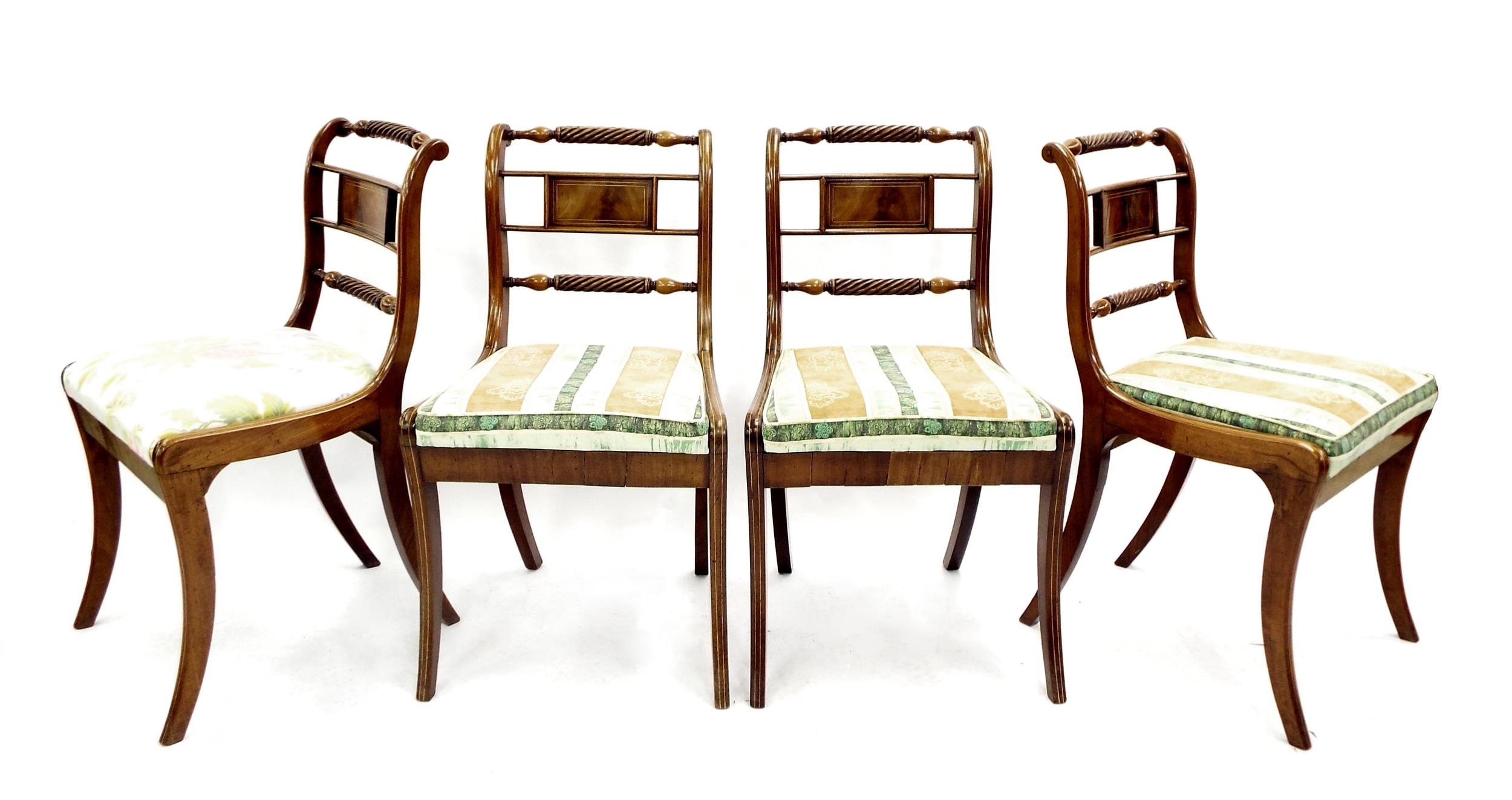 Set of four Regency mahogany dining chairs, each with barley twist and tablet horizontal splats, drop-in seats and sabre front legs (4)