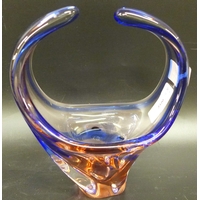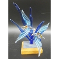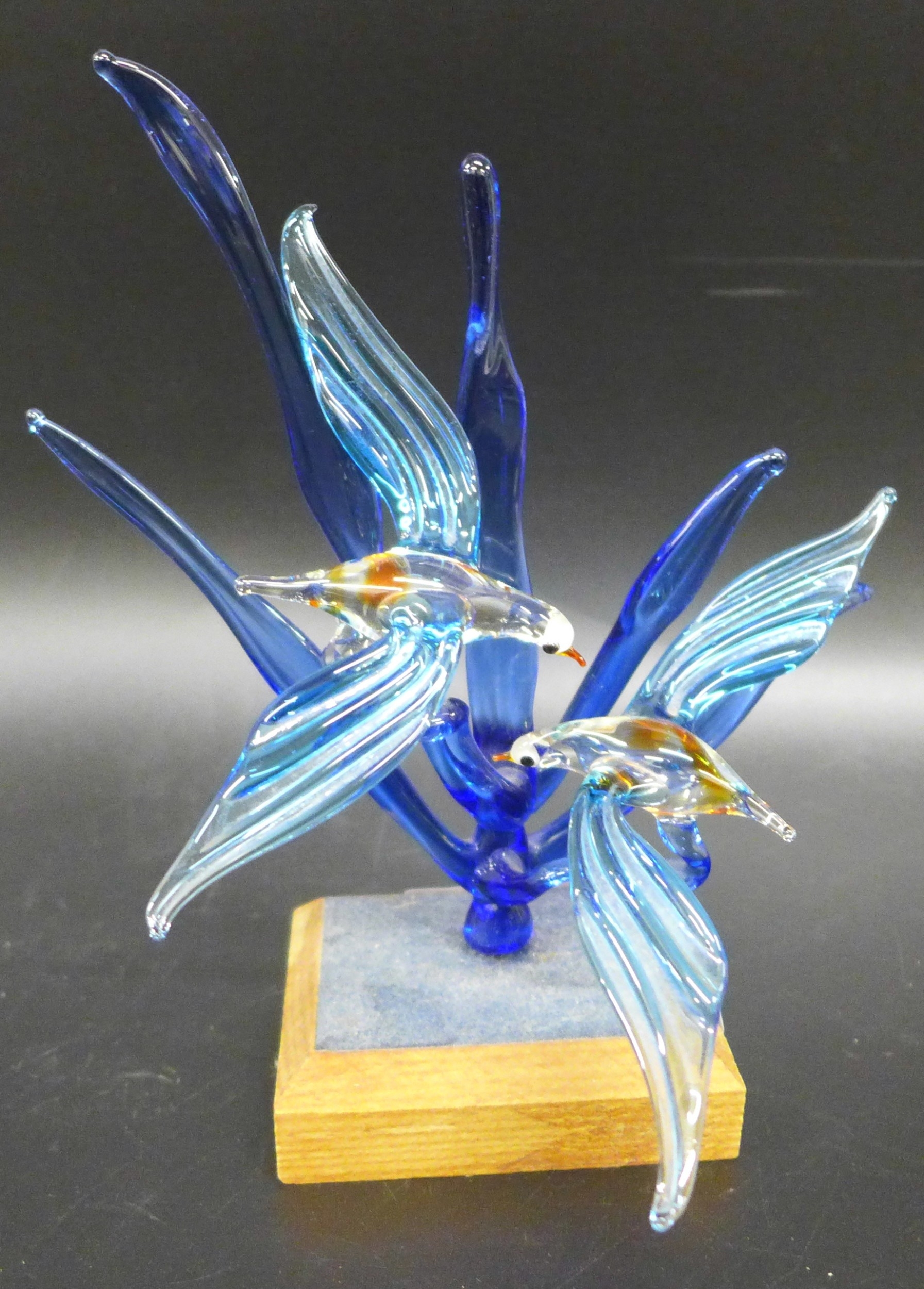 A Murano style coloured glass bird sculpture, raised on wooden base, 18cm h