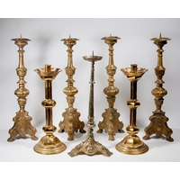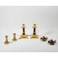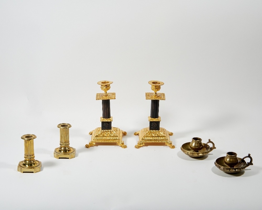 Three pairs of candlesticks, 20th century, comprising: a pair of gilt and patinated bronze candlesticks with fluted columns supporting urn sockets, 21cm high; a pair of brass candlesticks, 10cm high; and a pair of bronze chambersticks, 6cm high (6)