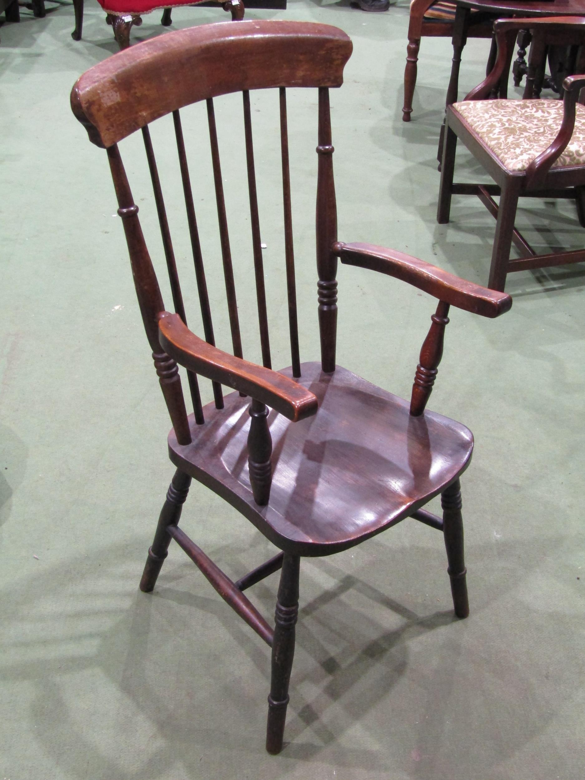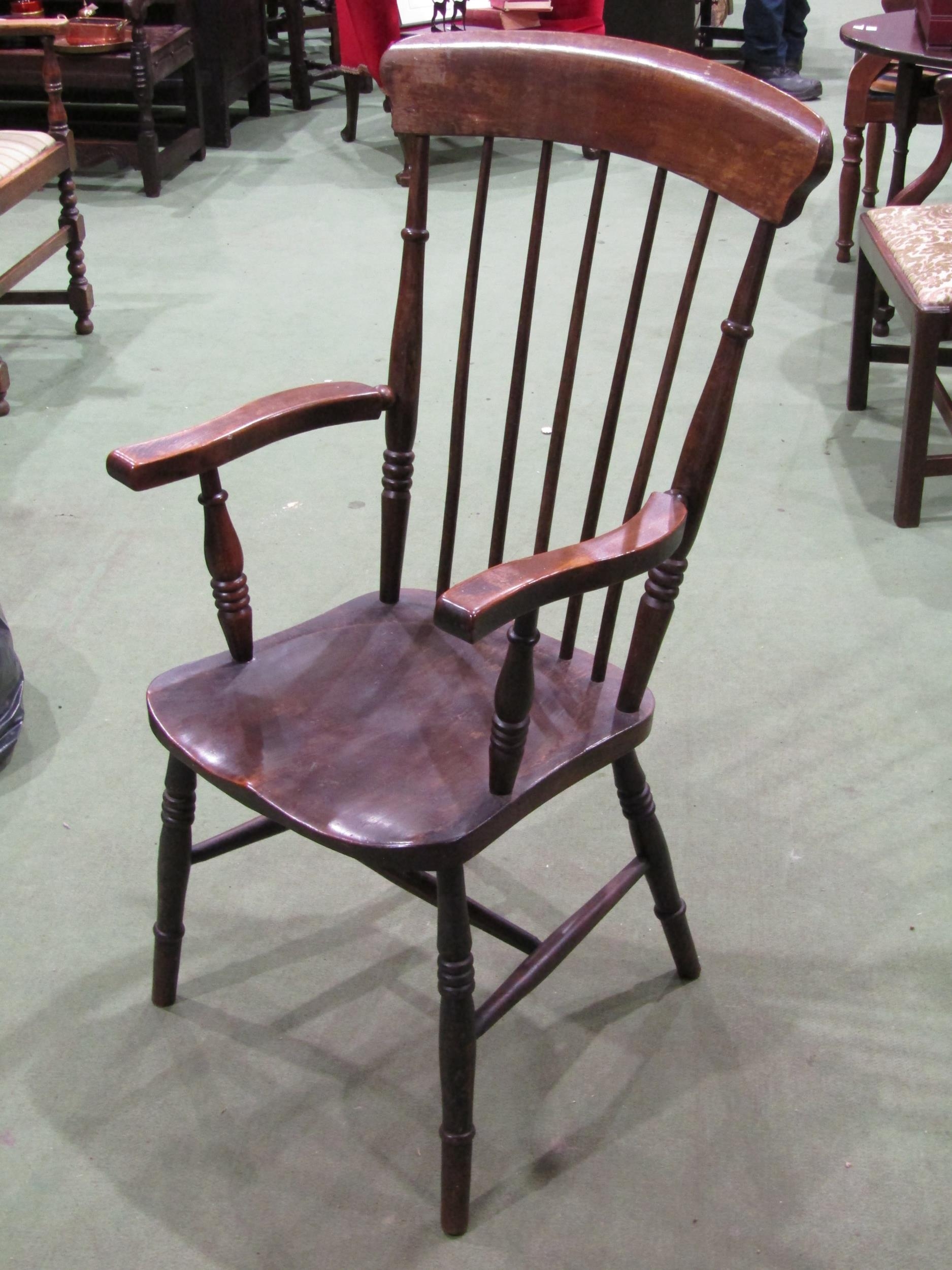 An early 20th Century stick back grandfather's chair on turned legs to 'H' stretcher base