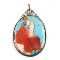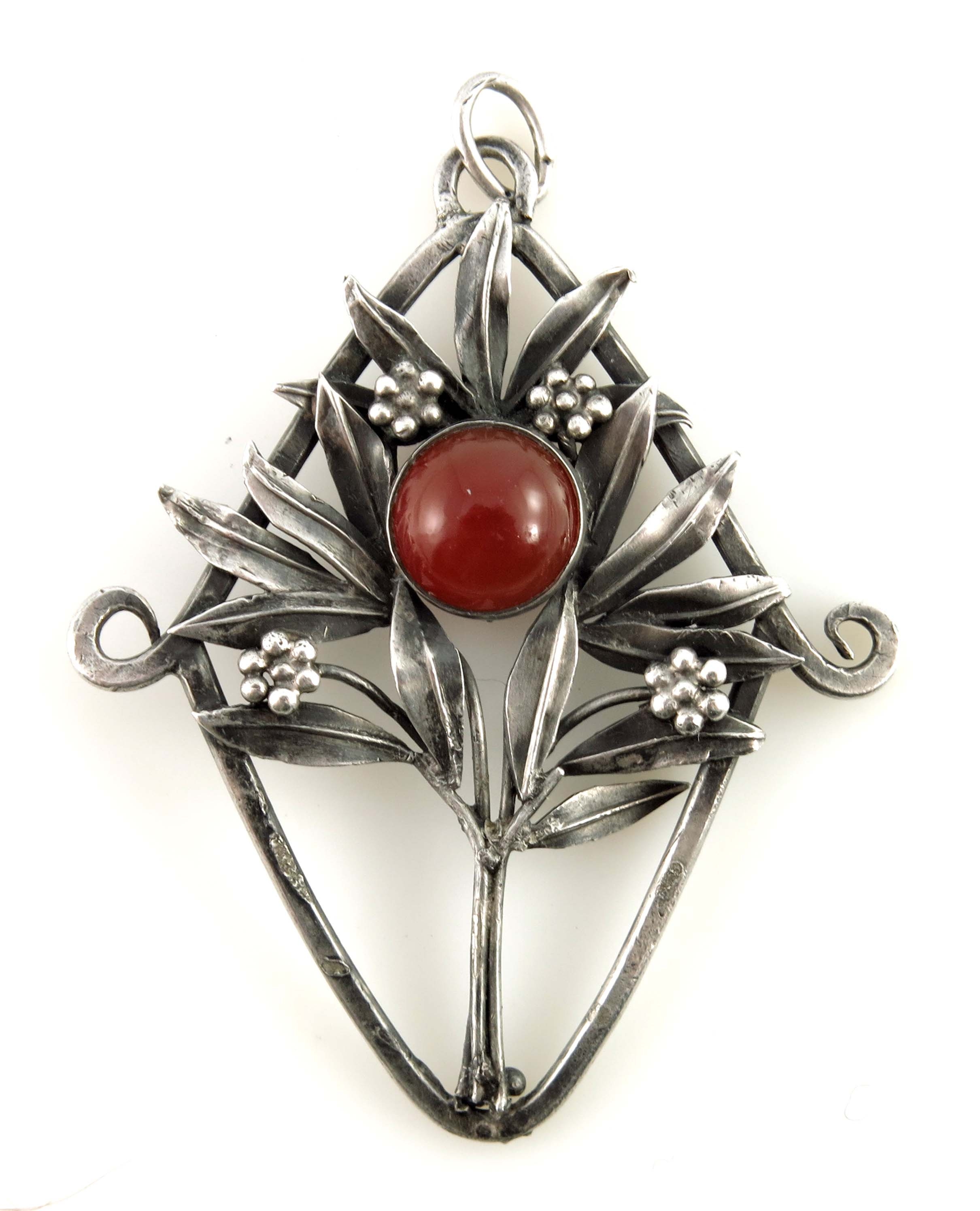 An Arts & Crafts silver pendant, in the form of a bay tree, with carnelian cabochon highlight and scrolled sides, length 5.5cm, 6g