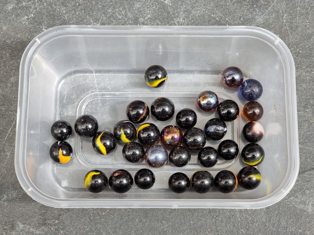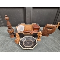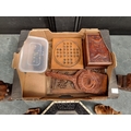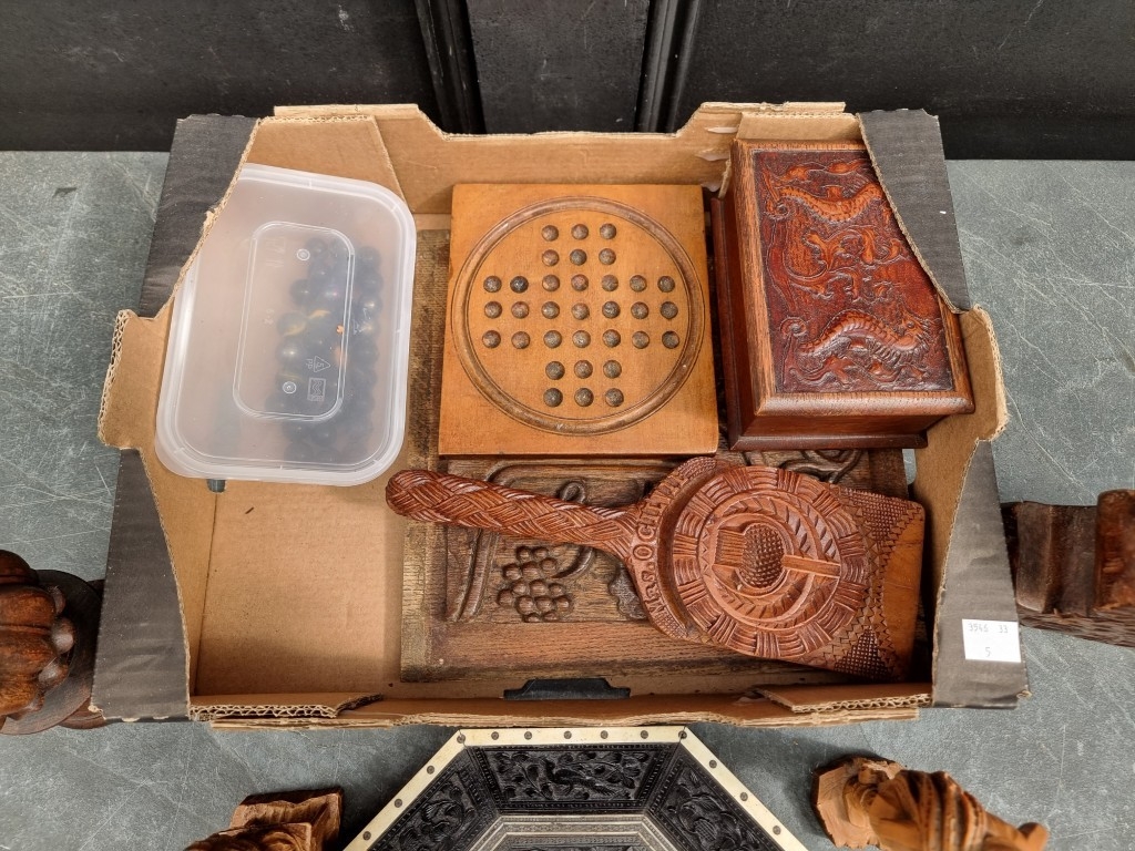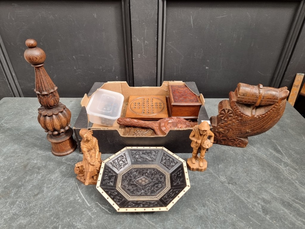 A small group of treen and similar, to include a small solitaire board, 16.5cm wide; and a bone mounted ebony octagonal dish, 22.5cm wide.
