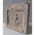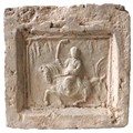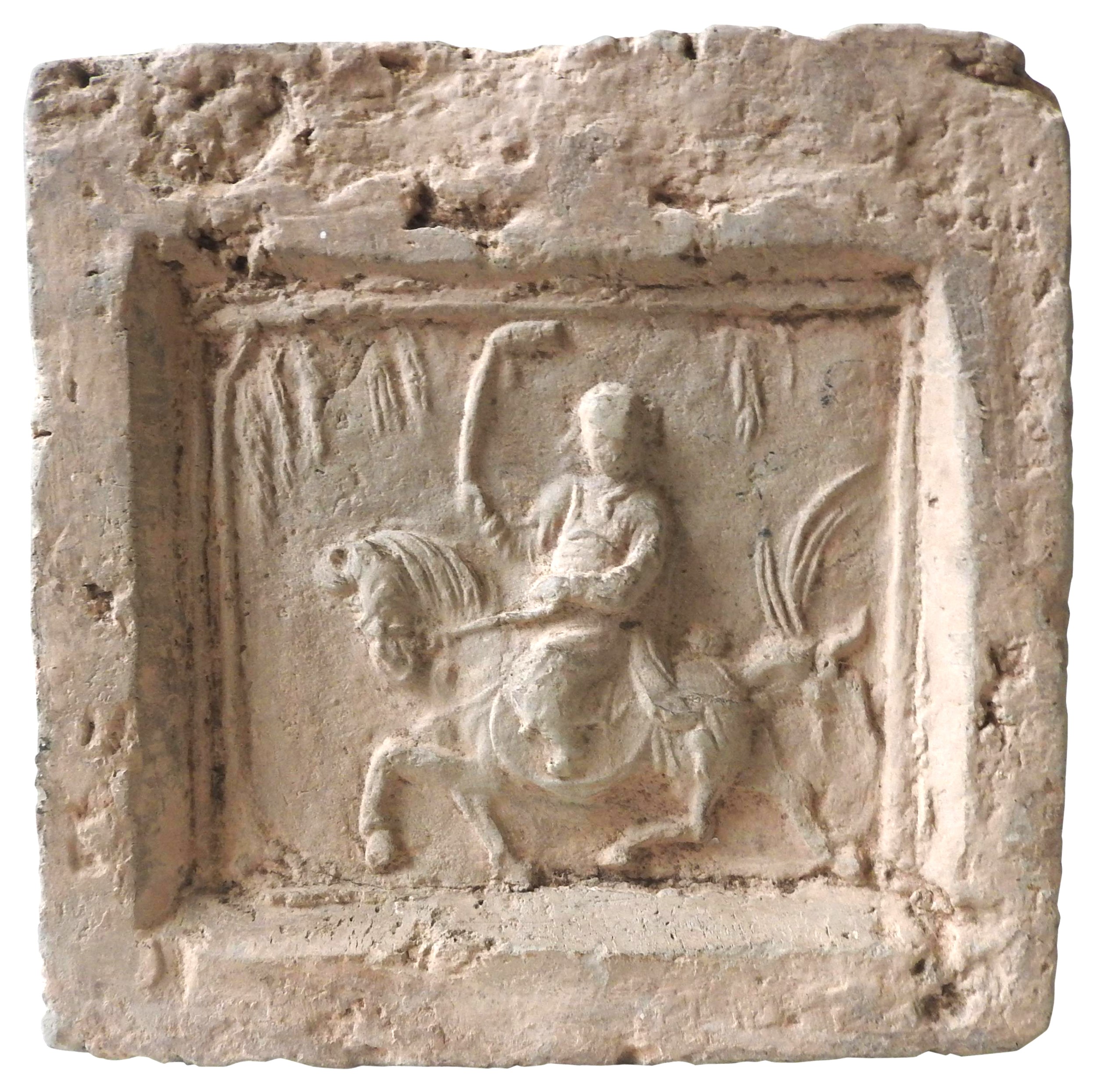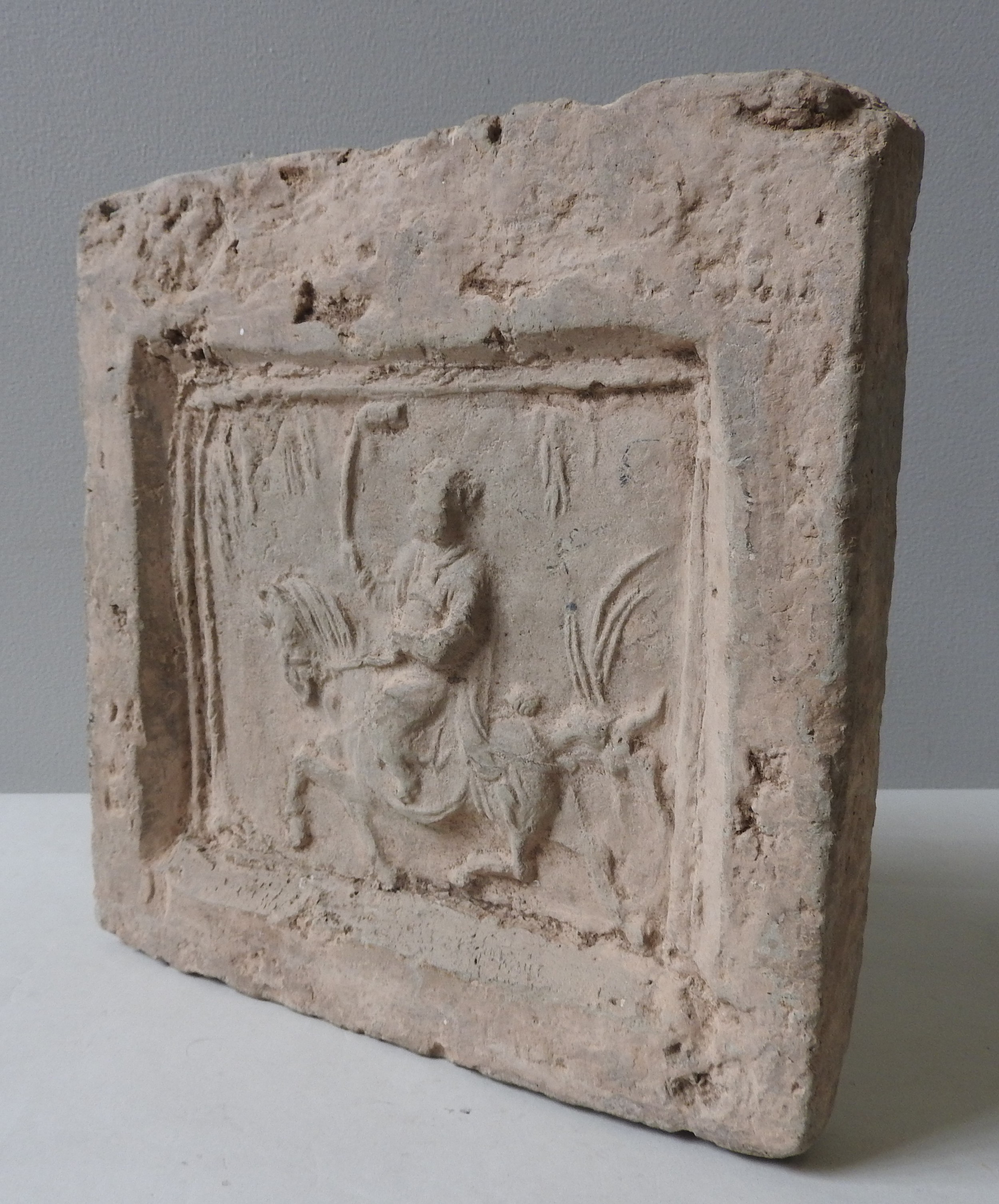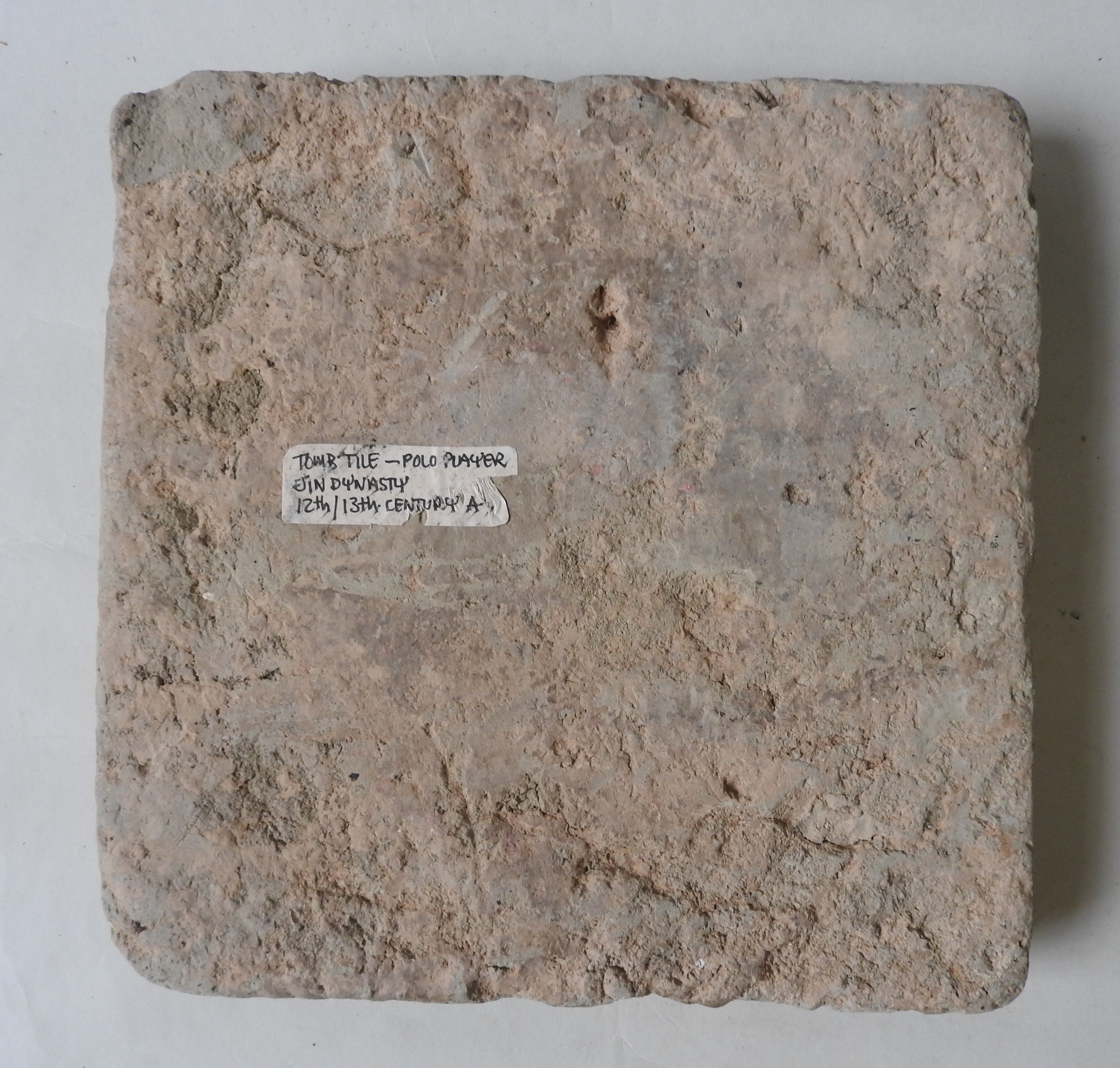 A CHINESE STONE TOMB TILE, the square tile decorated in low relief depicting a polo player on horseback, possibly Jin Dynasty or later
