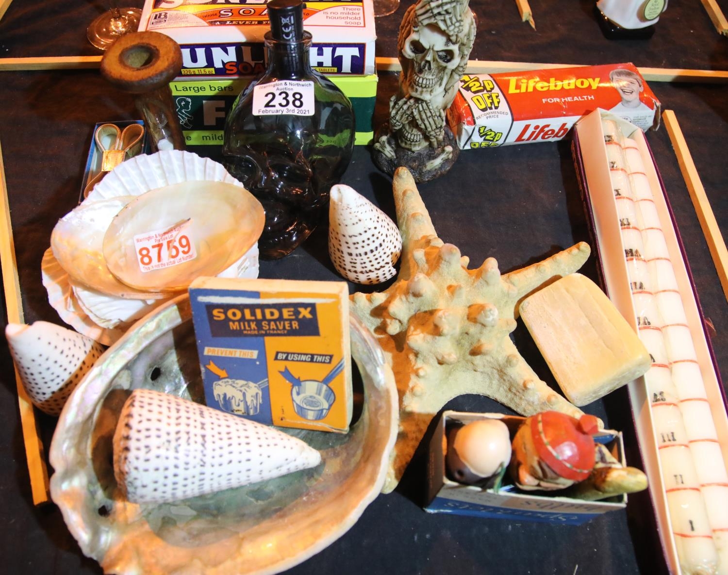 Group of mixed collectables including South sea shells, hour candles and vintage soaps. P&P Group 3 (£25+VAT for the first lot and £5+VAT for subsequent lots)