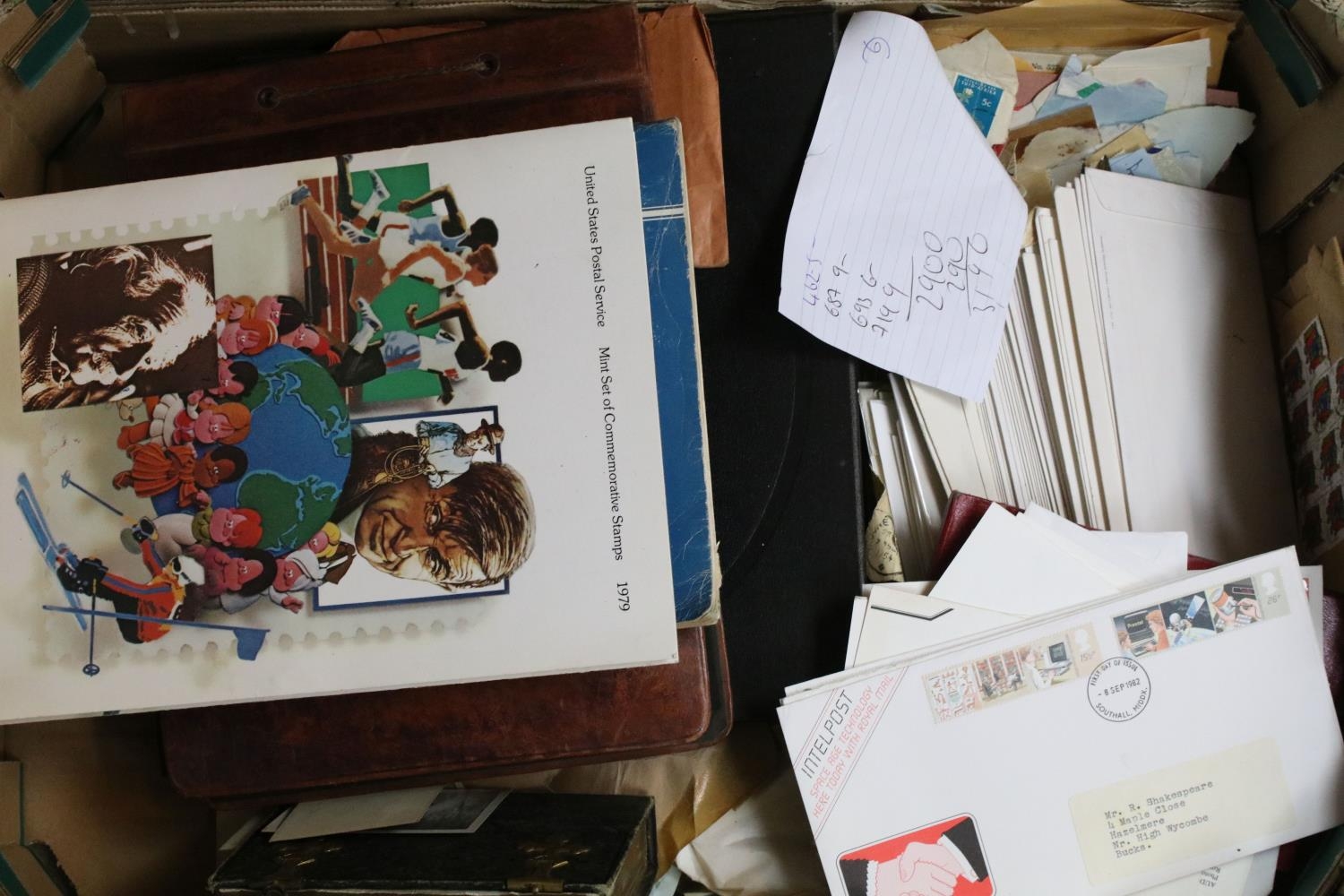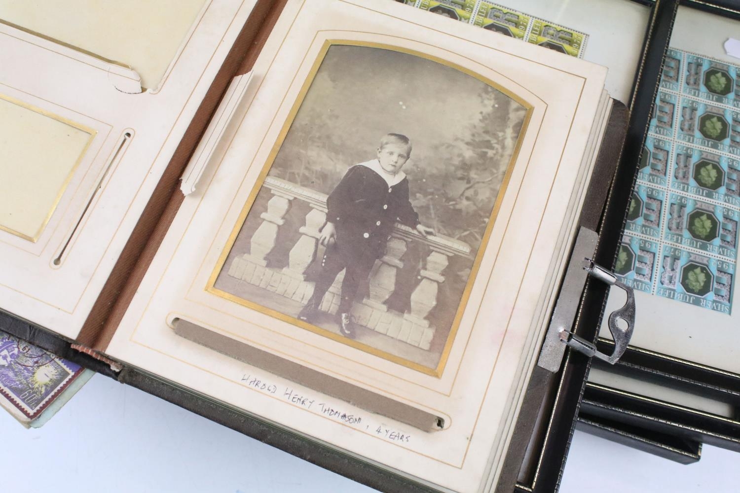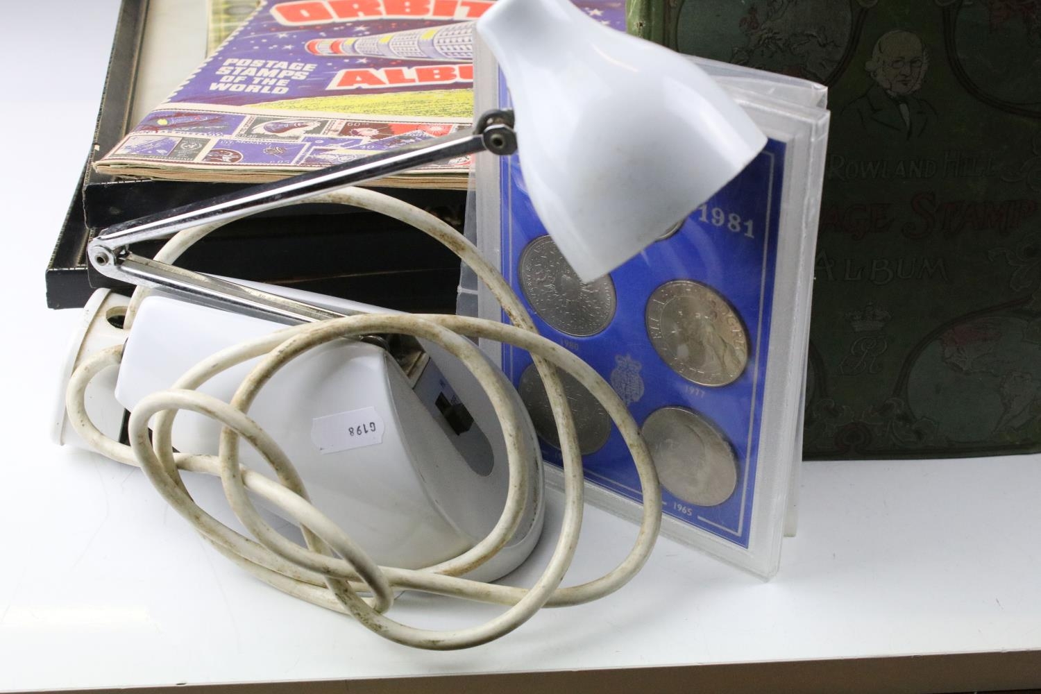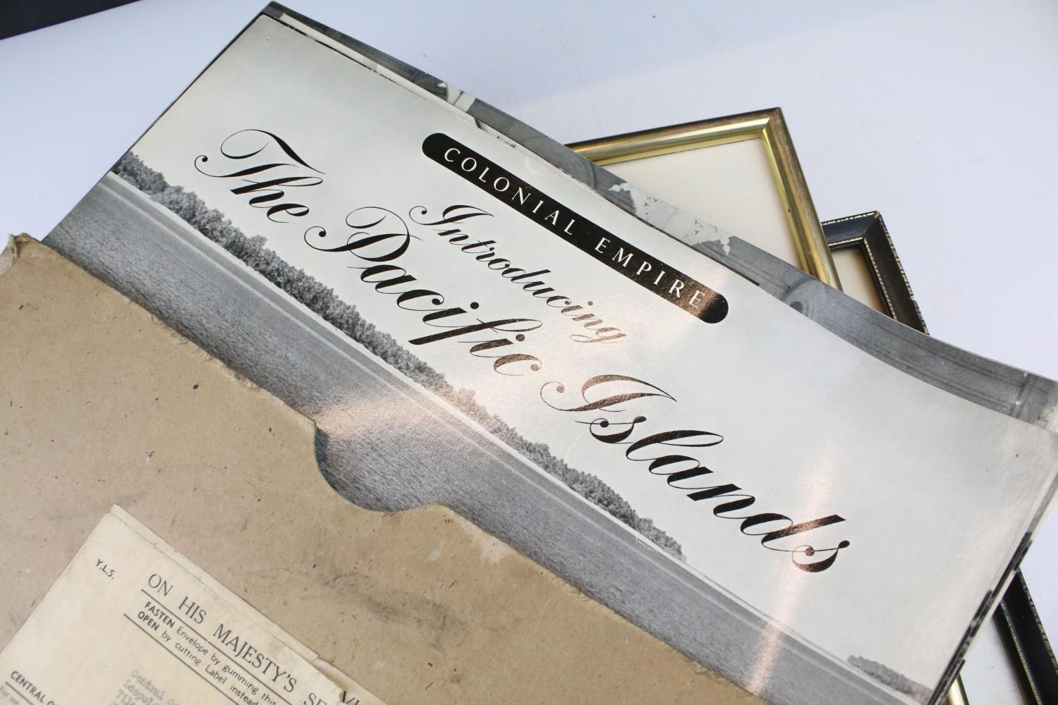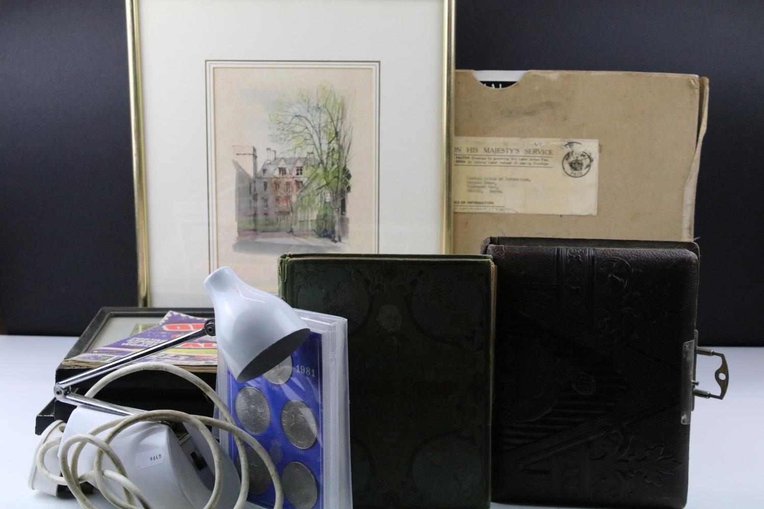 Mixed ephemera & collectables to include framed stamp sheets, 'On His Majesty's Service' photographs, watercolour, Folio Society Peter Pan hardback, Hamilton Industries desk lamp, leather CDV albums, stamp albums, first day covers, etc. (2 trays)
