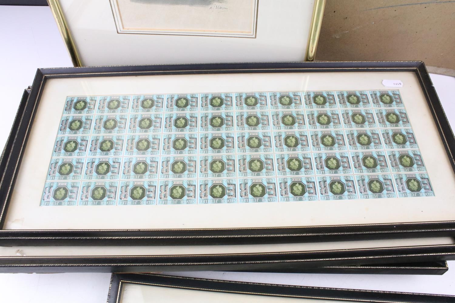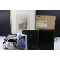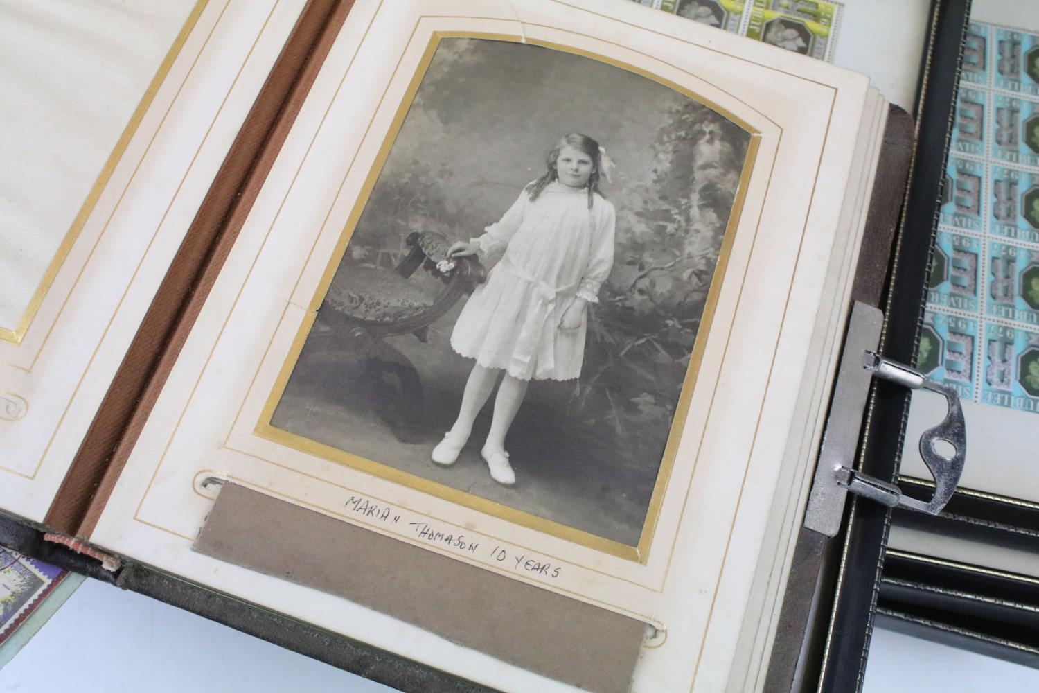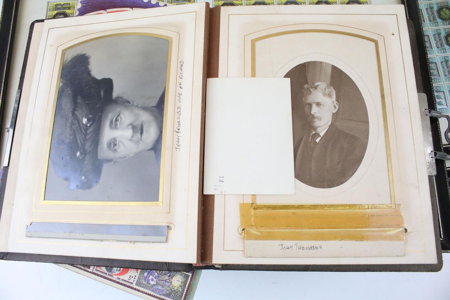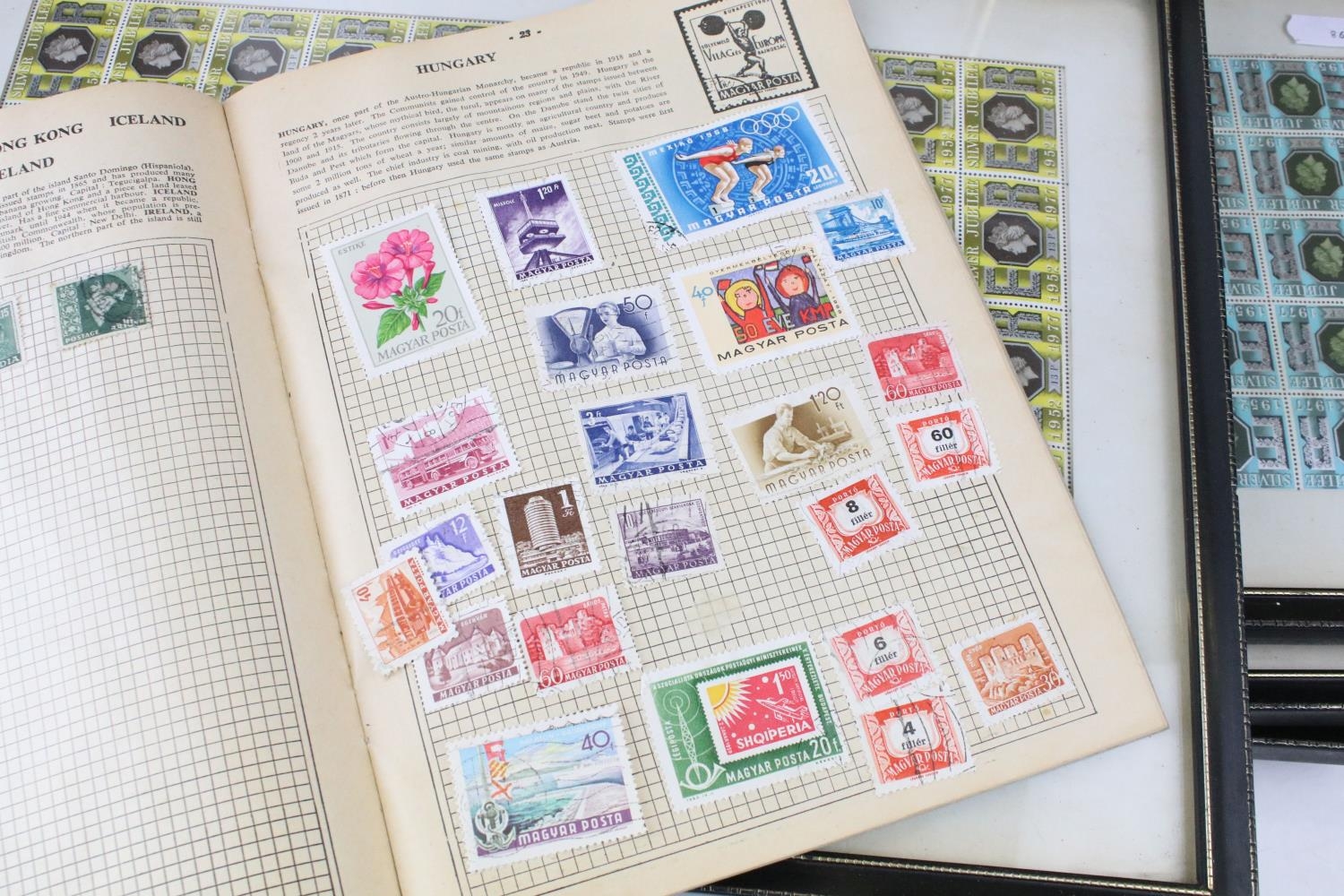 Mixed ephemera & collectables to include framed stamp sheets, 'On His Majesty's Service' photographs, watercolour, Folio Society Peter Pan hardback, Hamilton Industries desk lamp, leather CDV albums, stamp albums, first day covers, etc. (2 trays)