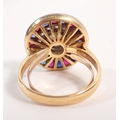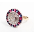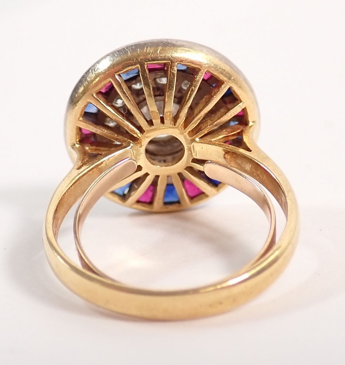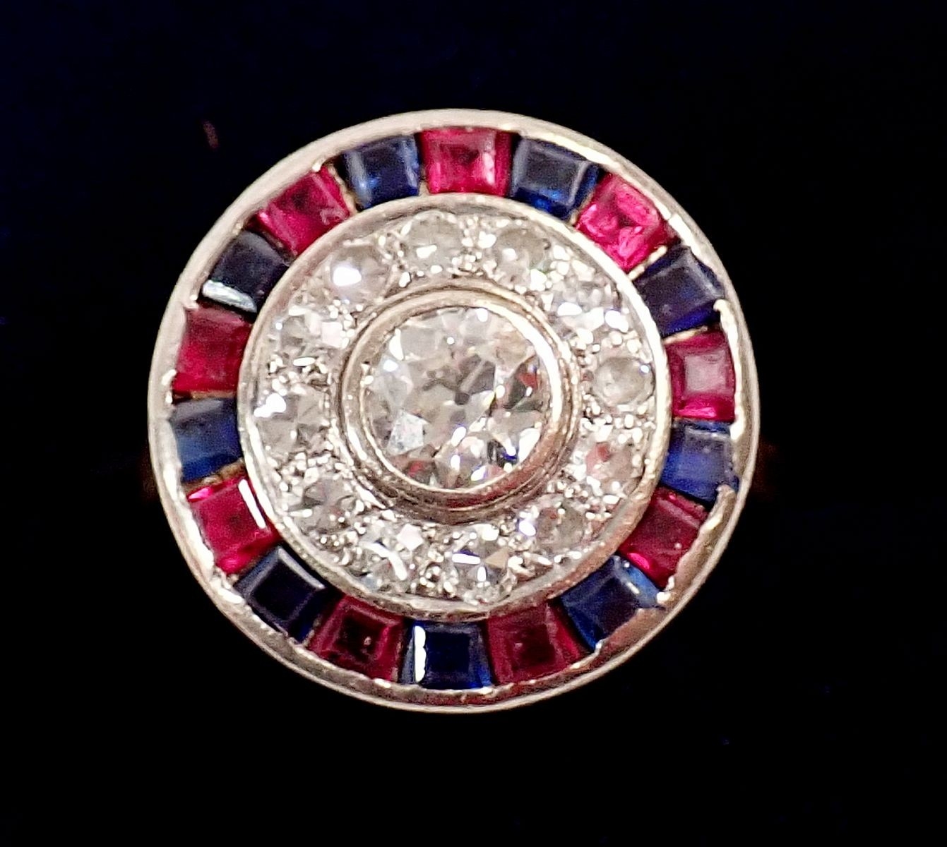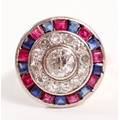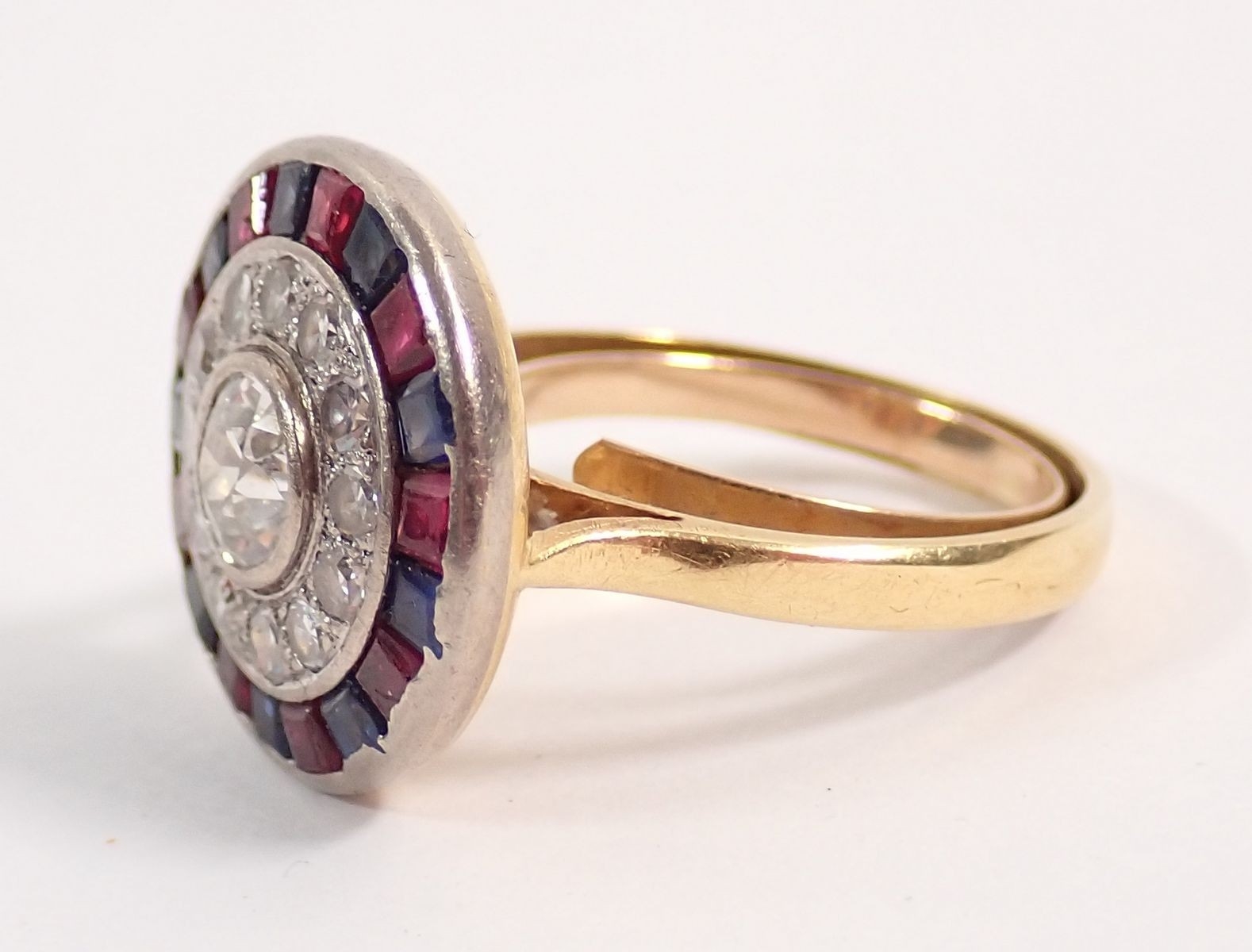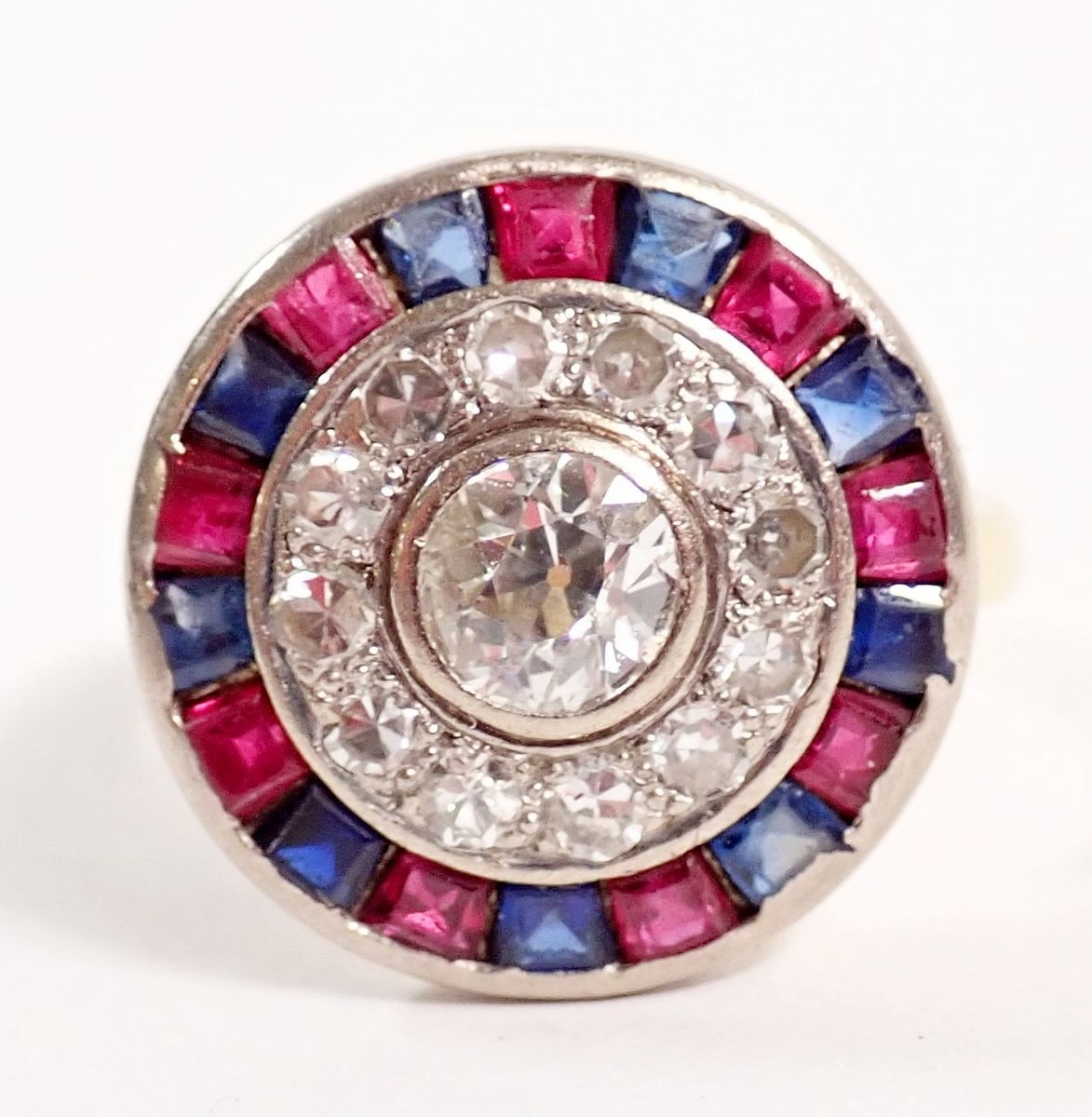 An 18 carat gold, sapphire, ruby and diamond target ring, the central diamond (approx 5mm) within border of diamonds and alternating calibre cut sapphires and rubies, size L, 7g