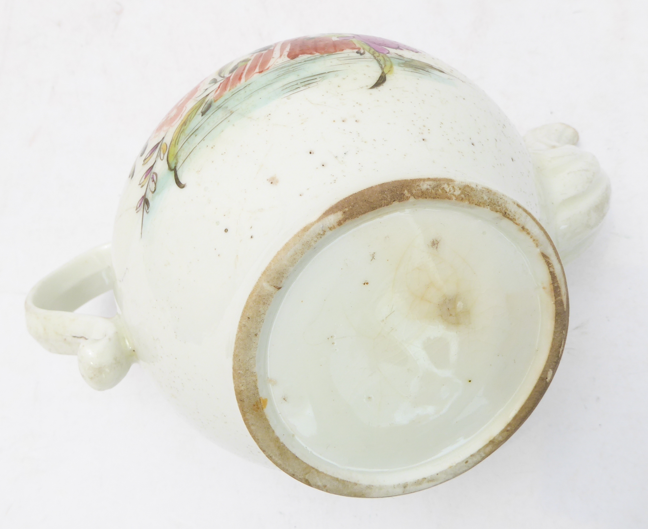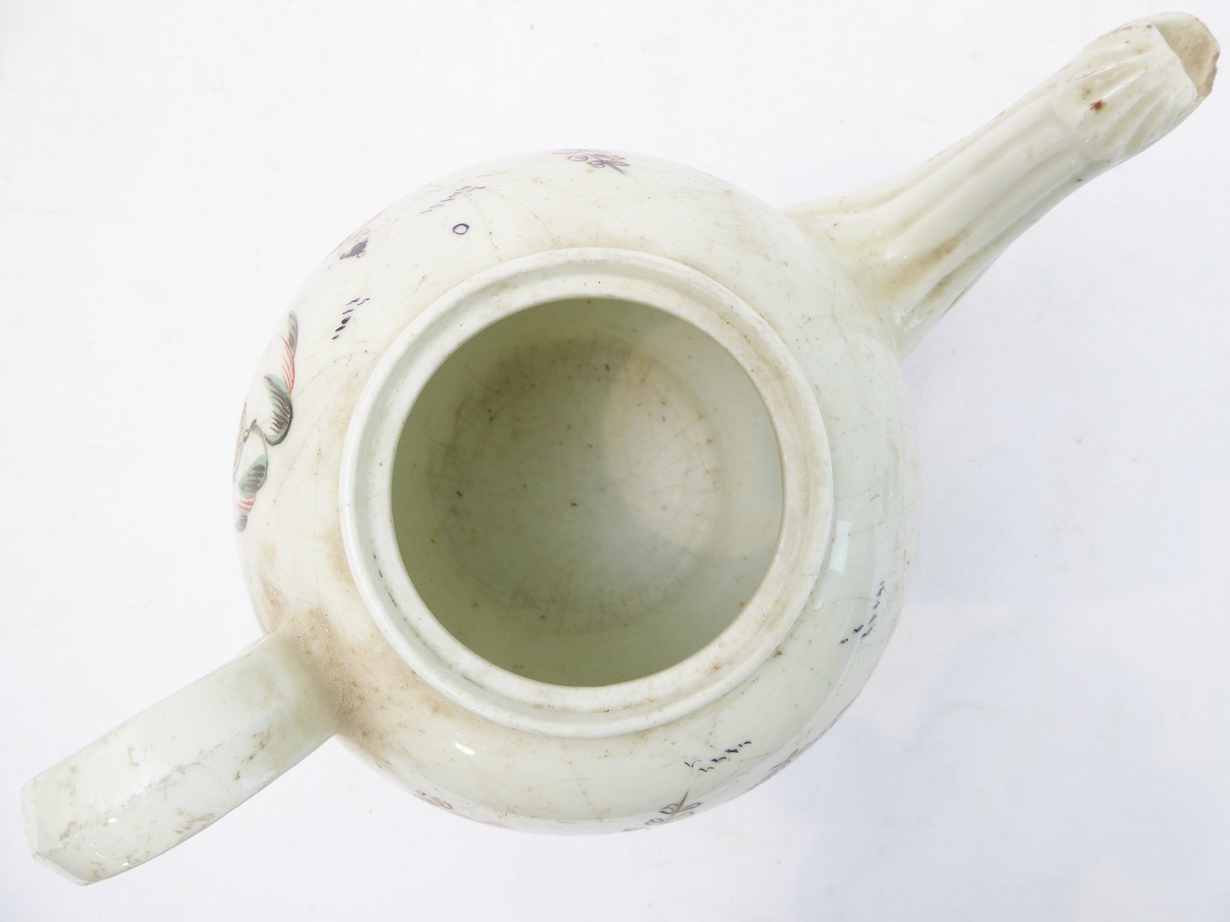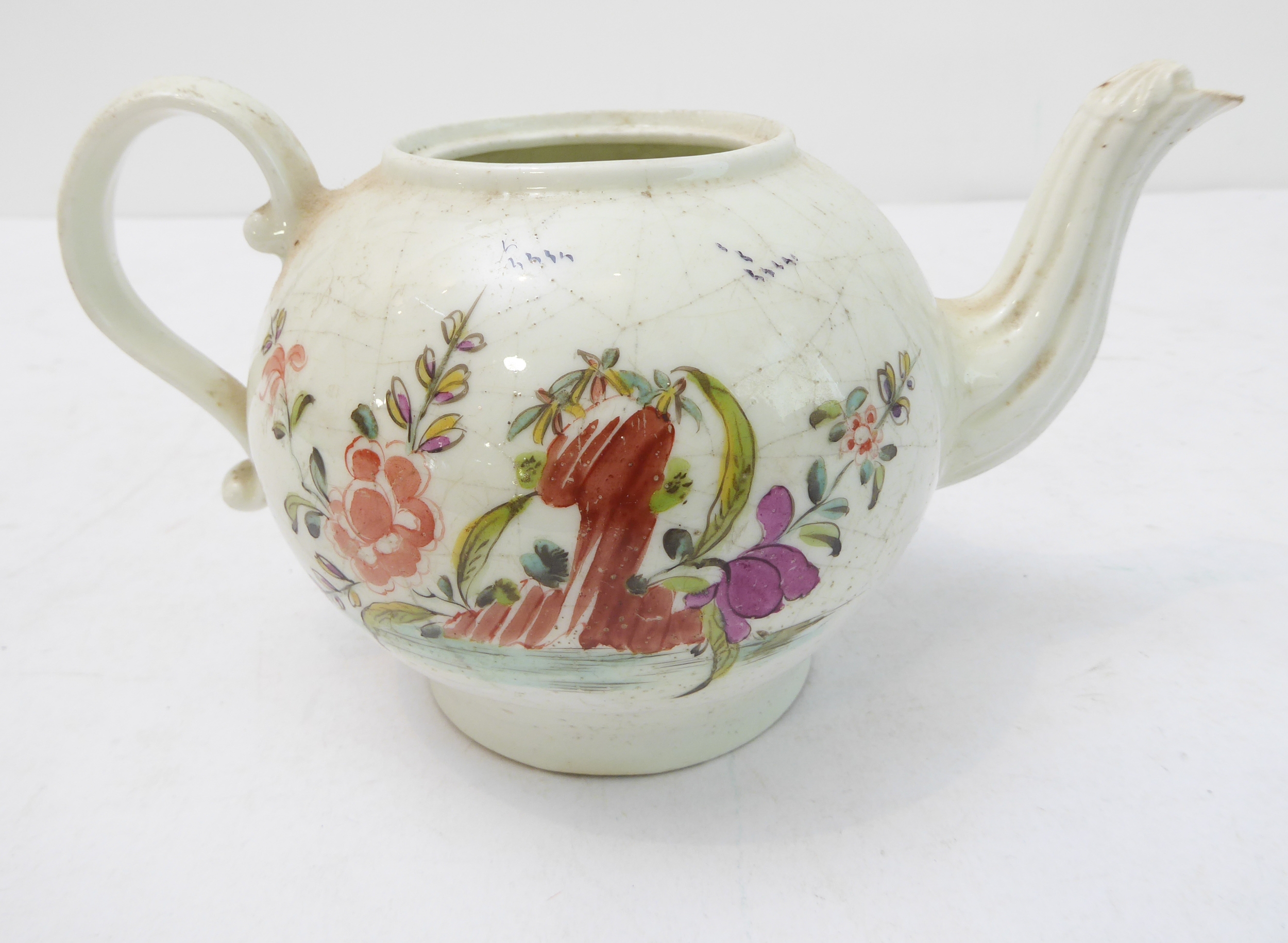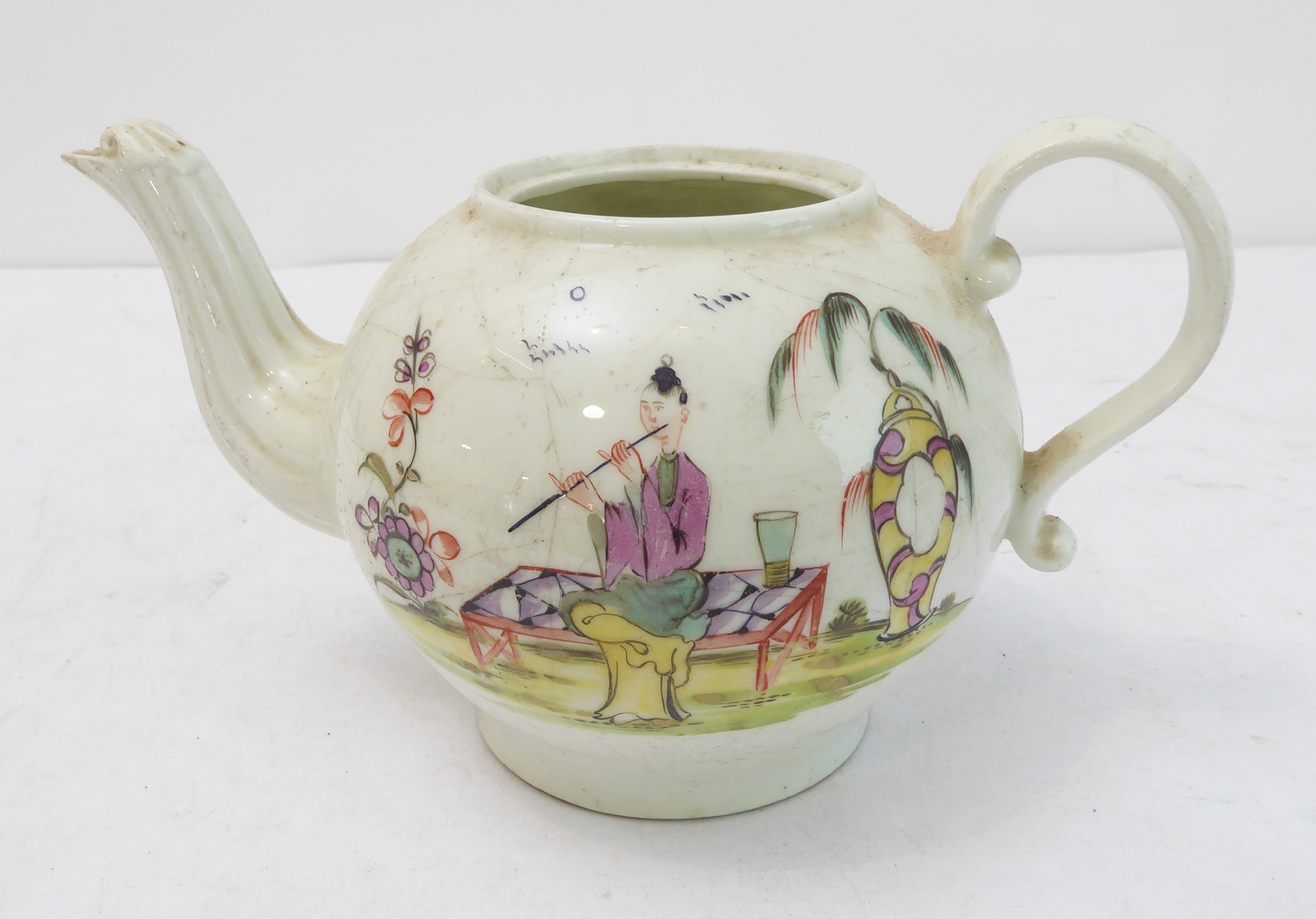A late 18th to early 19th century English bullet-shaped teapot (minus cover) decorated in the Orientalist taste (18 cm wide)