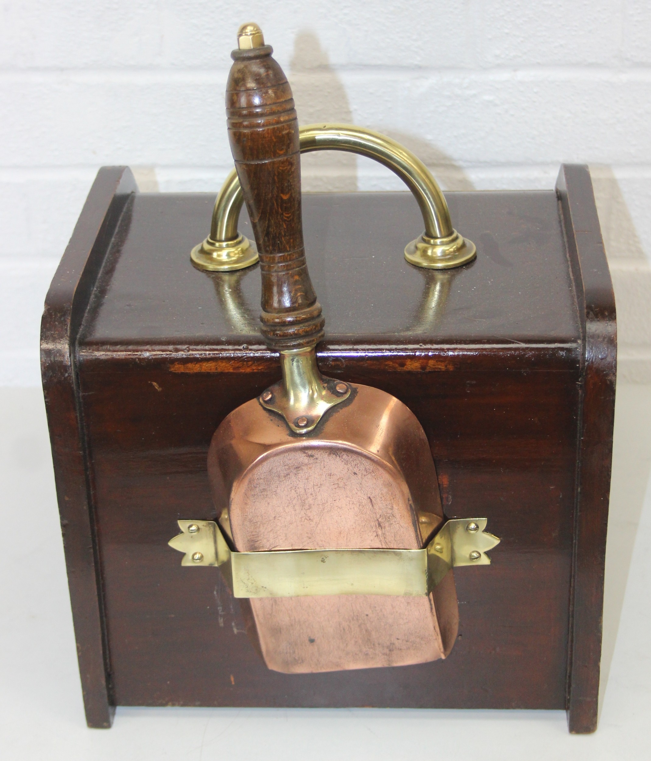 An antique mahogany coal scuttle with polished brass fittings and shovel, 30cm wide x 44cm deep