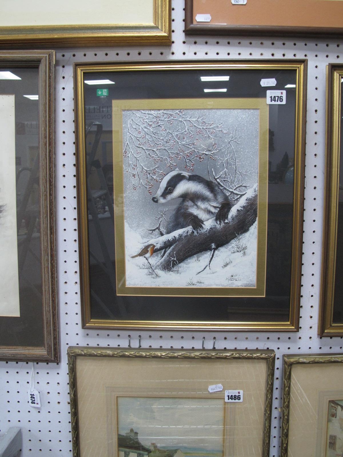 Barbara Mitchell (Sheffield Artist) Badger in Winter Setting, mixed media, signed lower right 30 x 22.5cm.