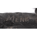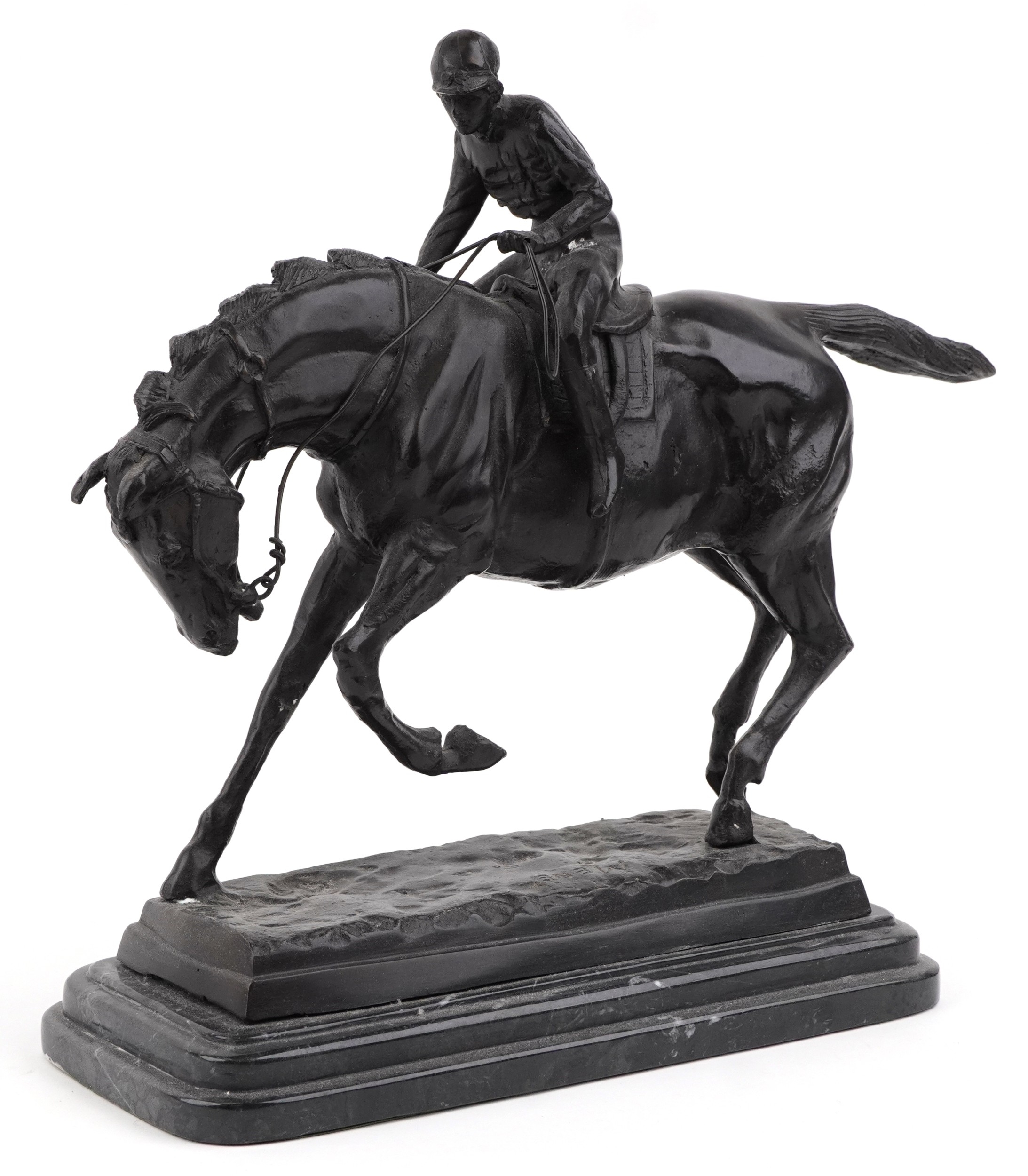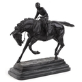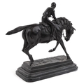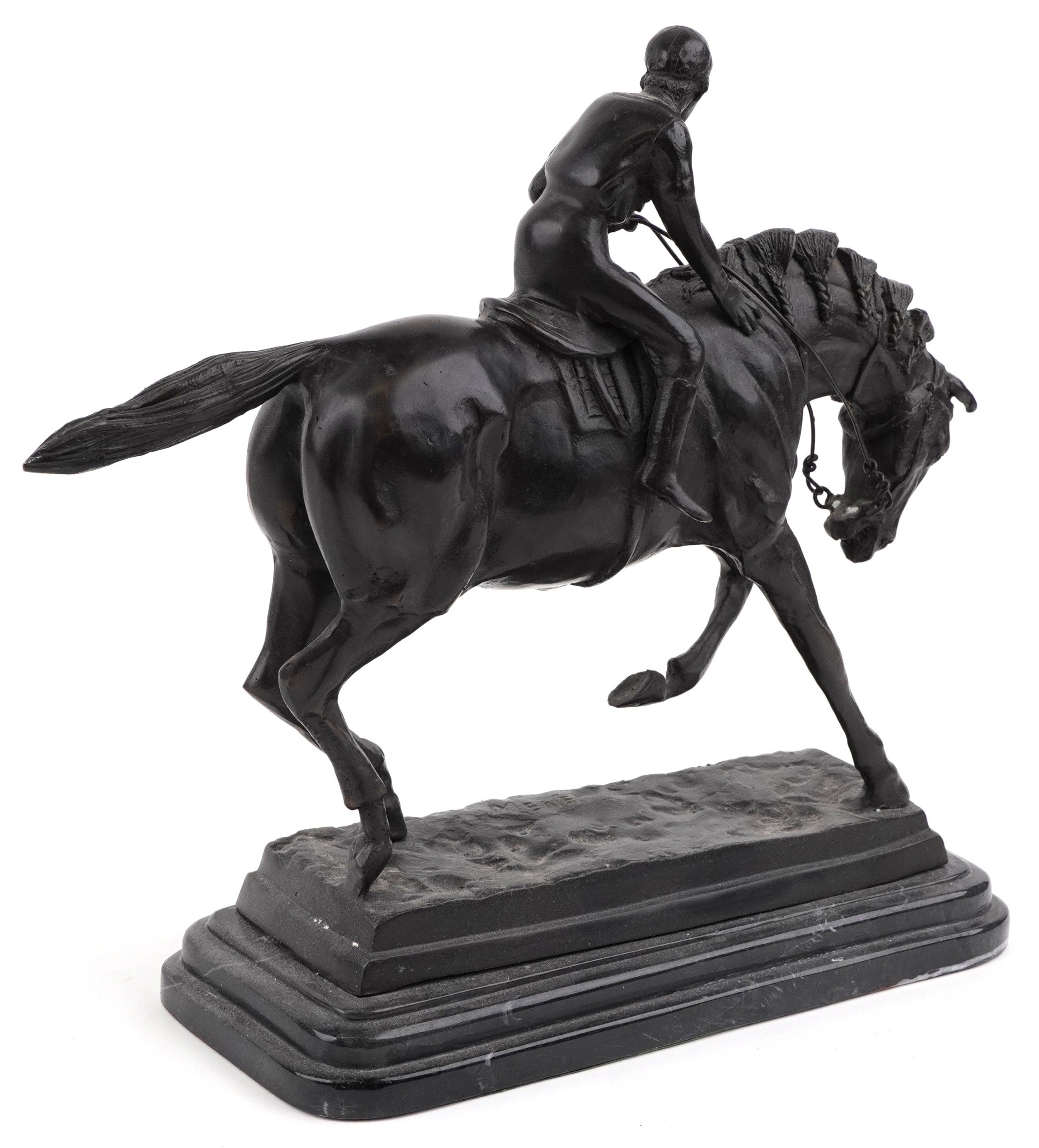 After Mene, a bronze study of a jockey on horseback raised on a black marble base, 37cm in length.