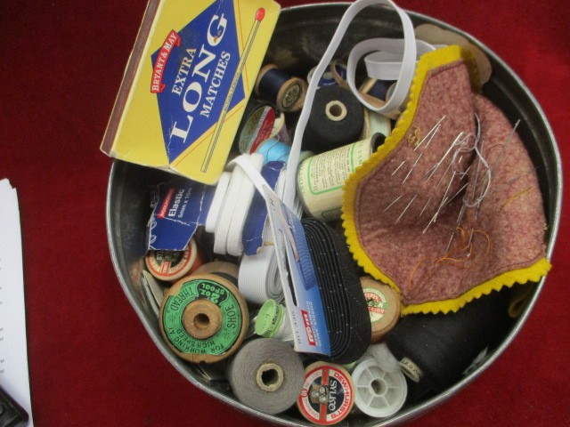 VINTAGE TIN AND SEWING ITEMS COTTONS ETC