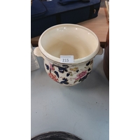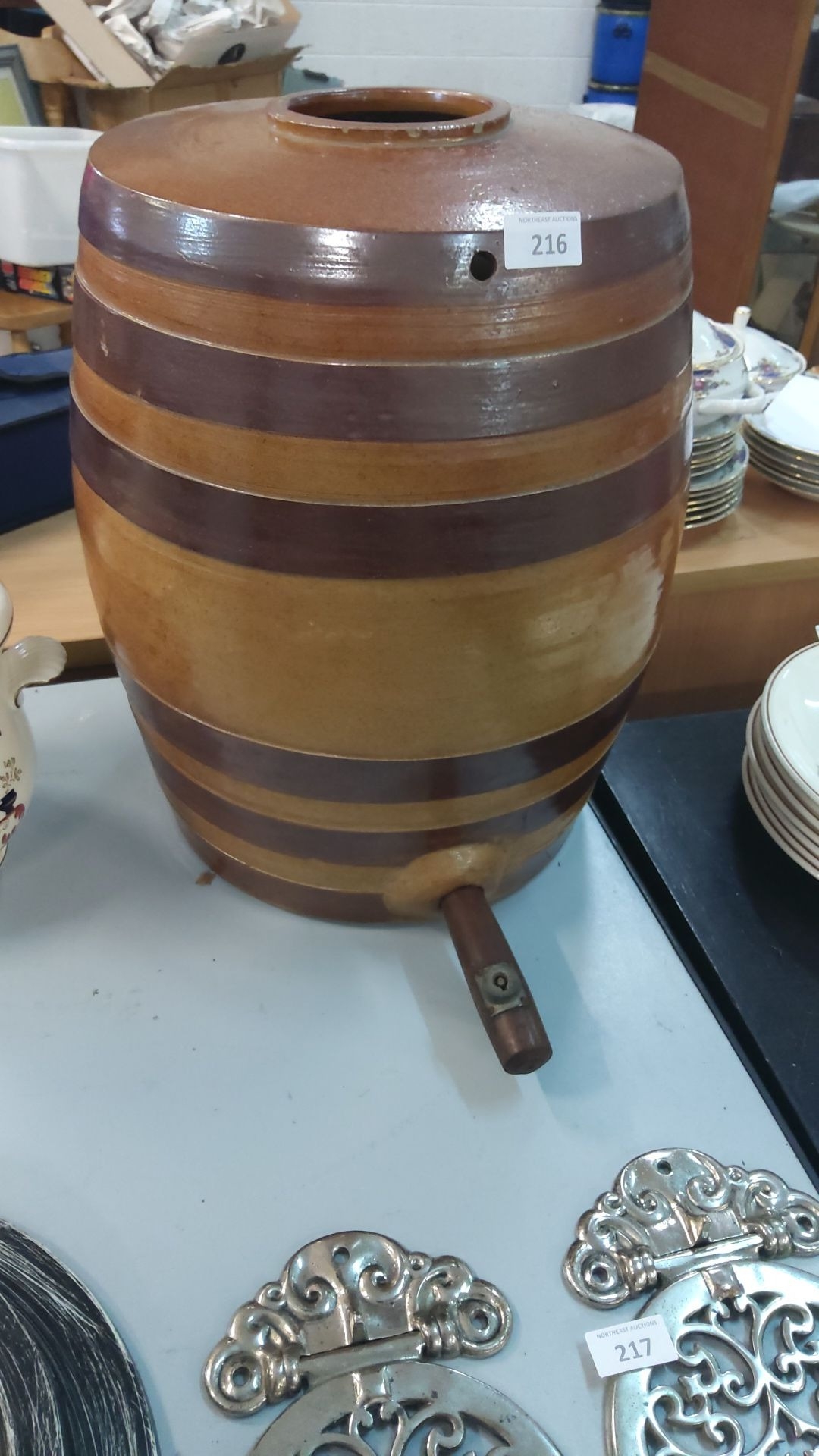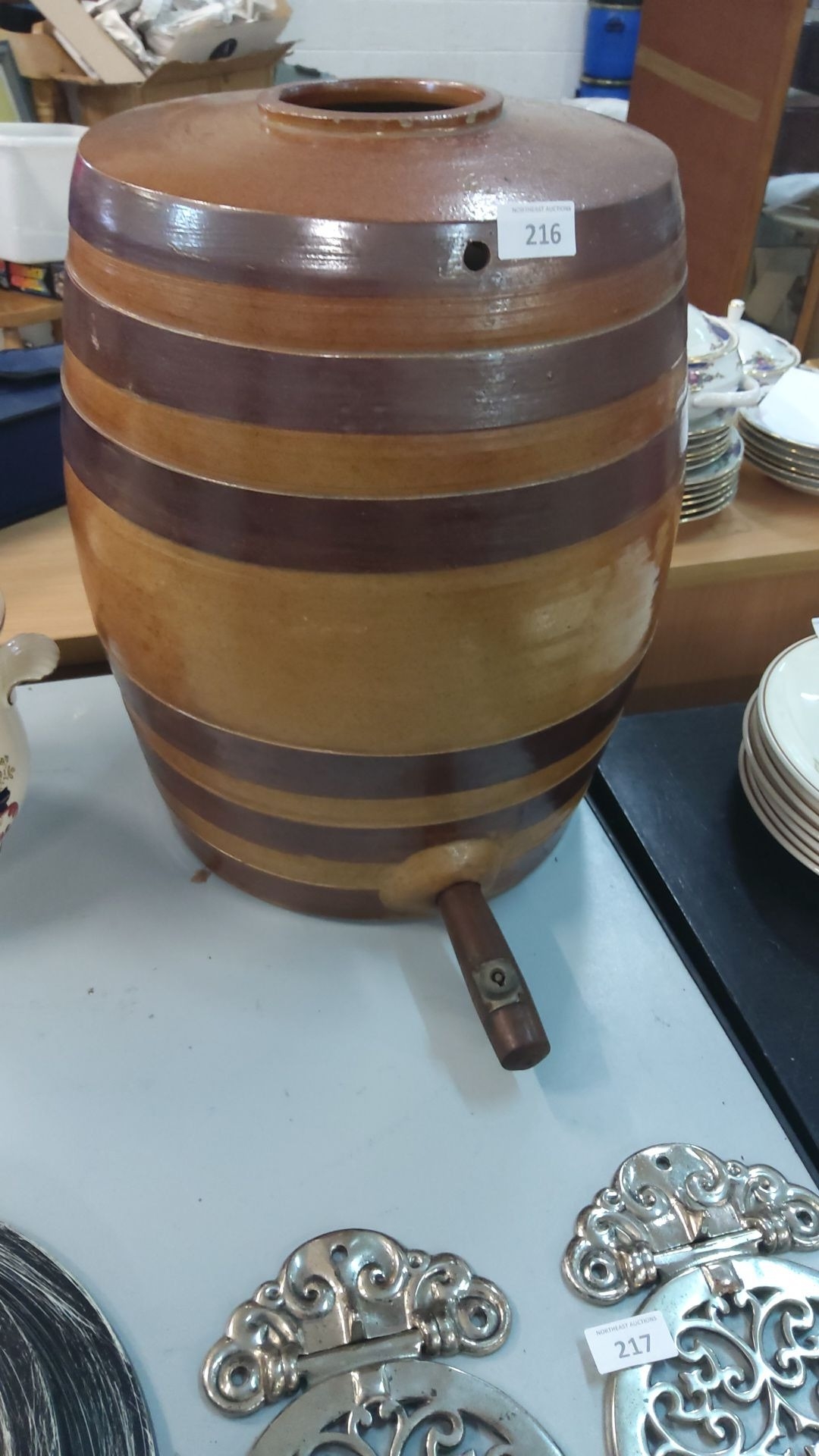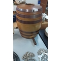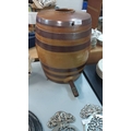 Glazed ceramic barrel with integrated tap, featuring brown bands, from the mid-20th century.