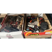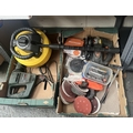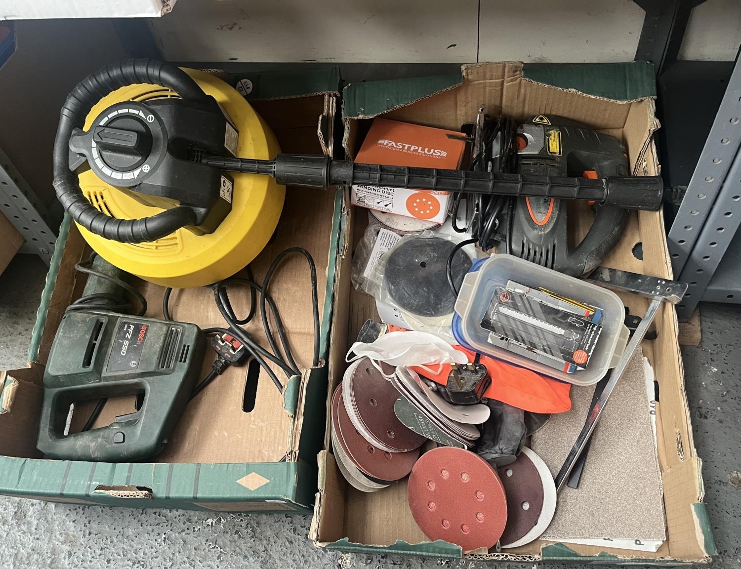 2 Boxes containing sanding discs, power tools and a pressure washer attachment
