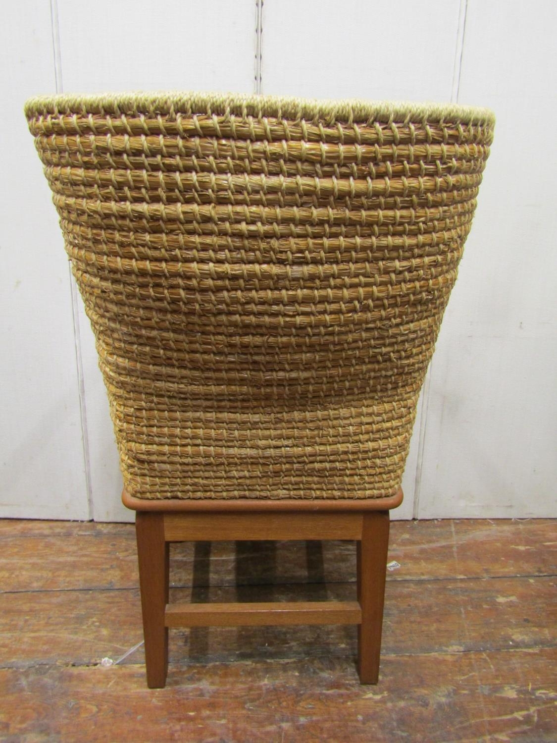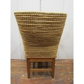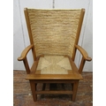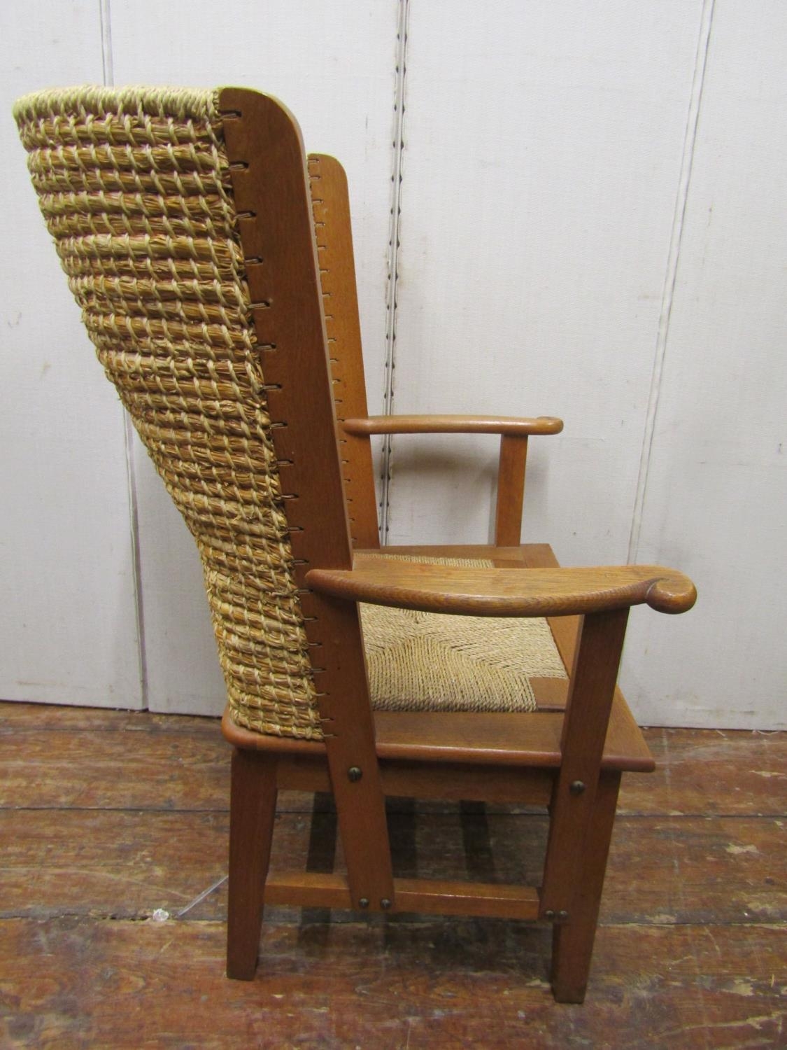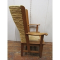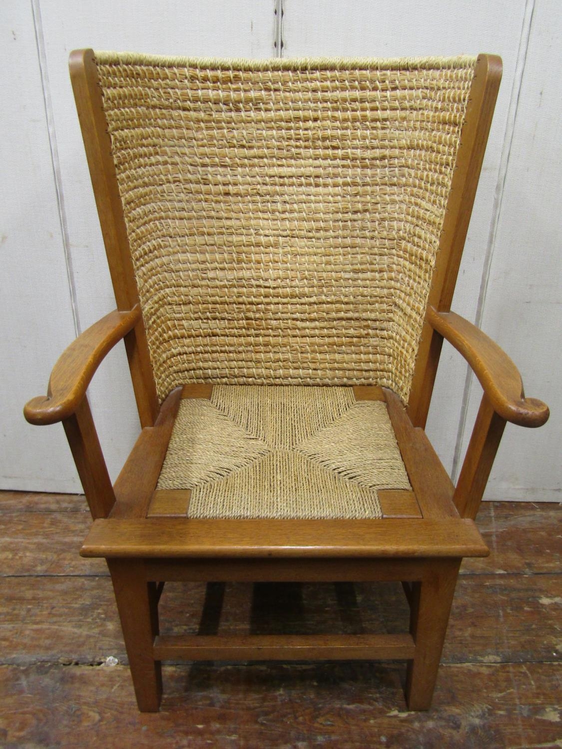 An Orkney chair - mid 20th century, in oak with straw work canopy back, makers stamp DM Kirkness of Kirkwall, Orkney, R.E. with thistle head centre, 84cm high