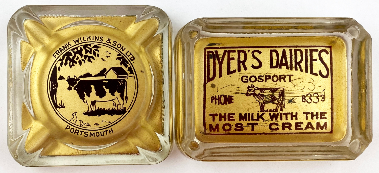 PORTSMOUTH & GOSPORT DAIRY ASHTRAY DUO. Clear glass, gold & red transfer, Portsmouth & Gosport. Slight scratches to one. (2)