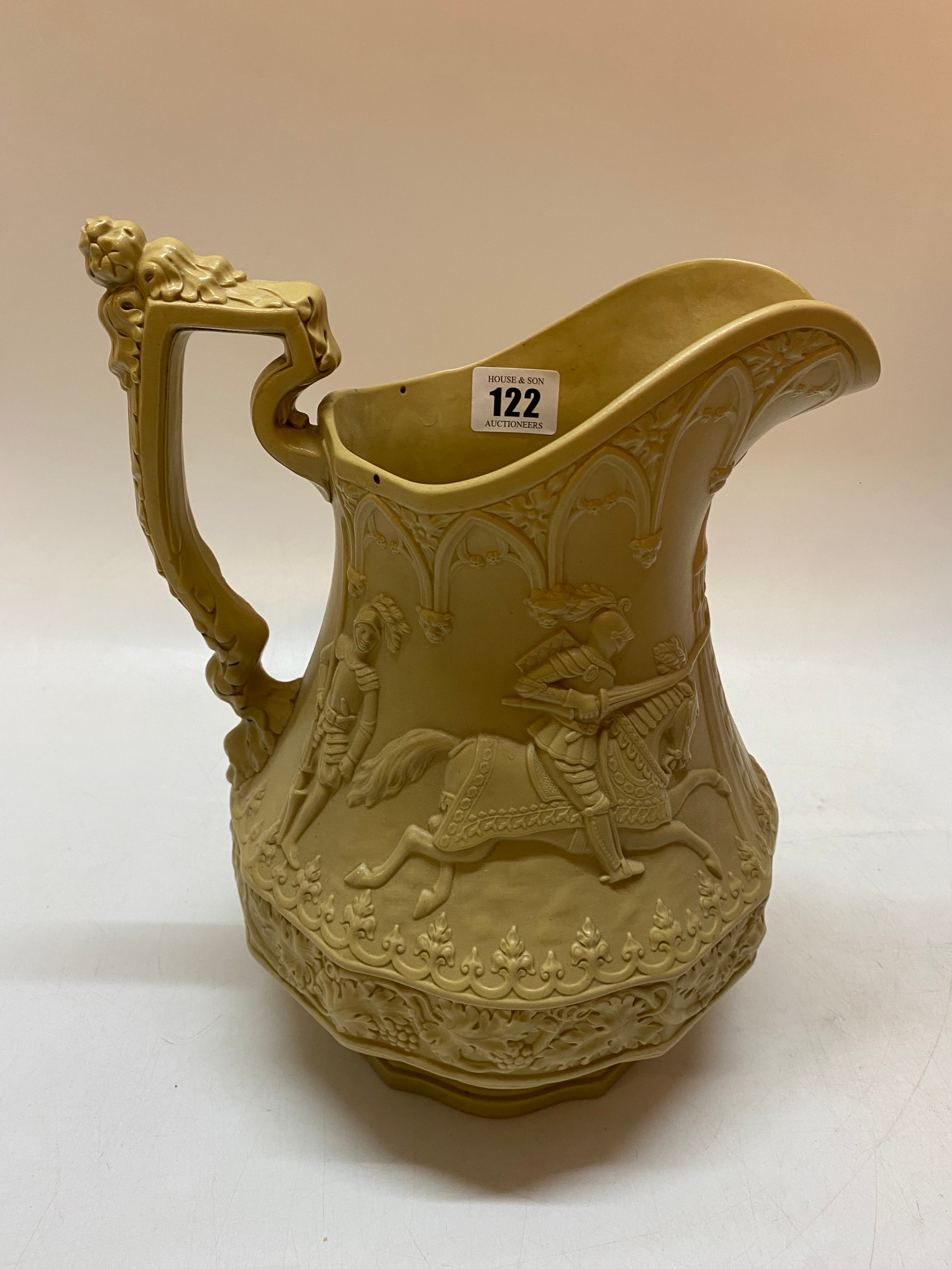 A large Ridgeway jug decorated knights on horseback, on shaped base - 11in. high