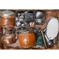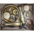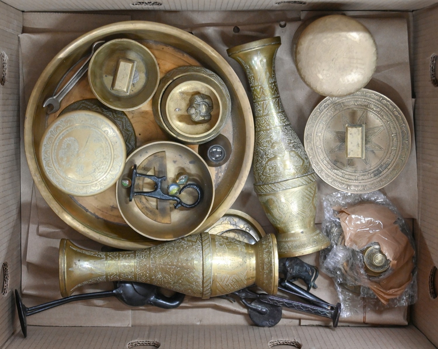 Miscellaneous Middle Eastern and other metalware, early 20th c and later, to include a pair of engraved brass flared neck vases, 25cm h, jars and covers, inkwell, dishes and trays, etc