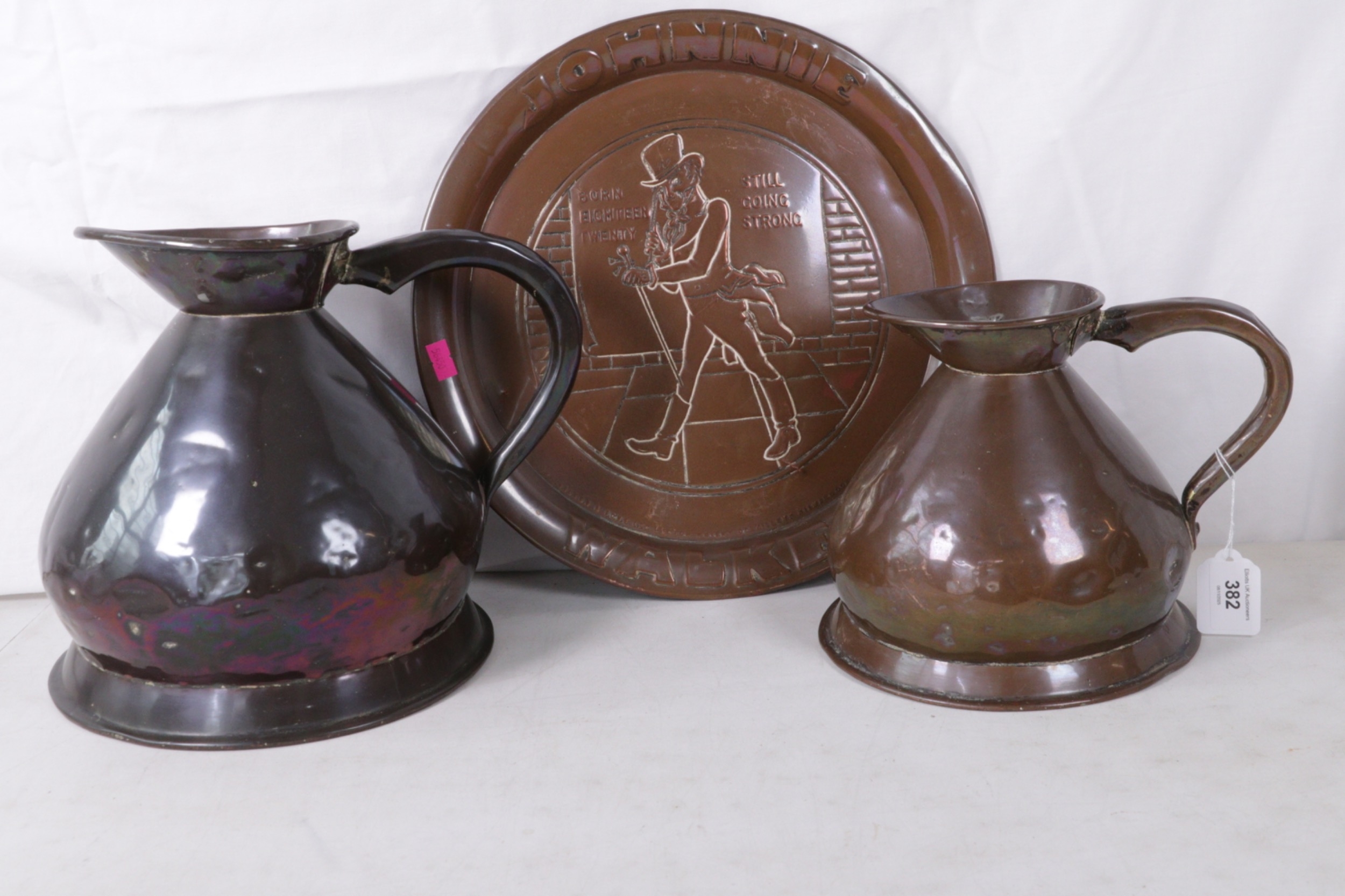 Vintage copper Johnnie Walker tray together with a one gallon and half gallon jug