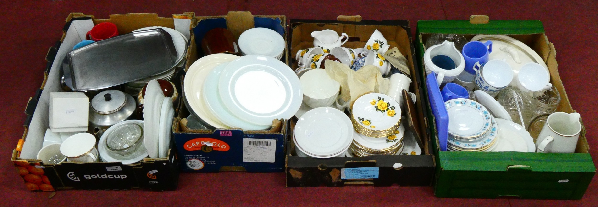 Decorative and Domestic Ceramics, to include a Royal Vase part tea service decorated with yellow roses, stoneware jars, pressed glass, tureens, teapots, etc:- Four Boxes