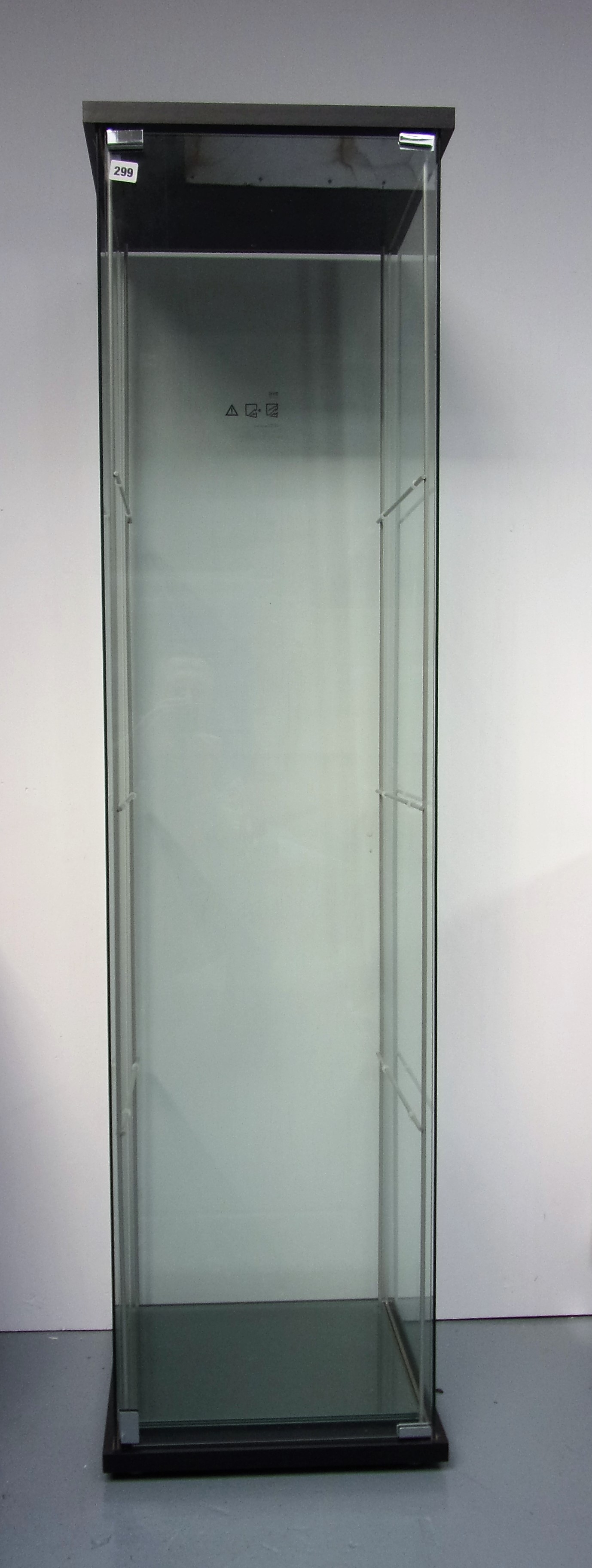 MODERN GLAZED DISPLAY CABINETS OF FREE STANDING STYLE OF IKEA MAKE REF AA-926745-1 APPROX 16 INCH X 14 INCH WITH OVERALL HEIGHT OF 64 INCHES WITH 4 TIERED GLASS SHELVES, IDEAL FOR COLLECTORS