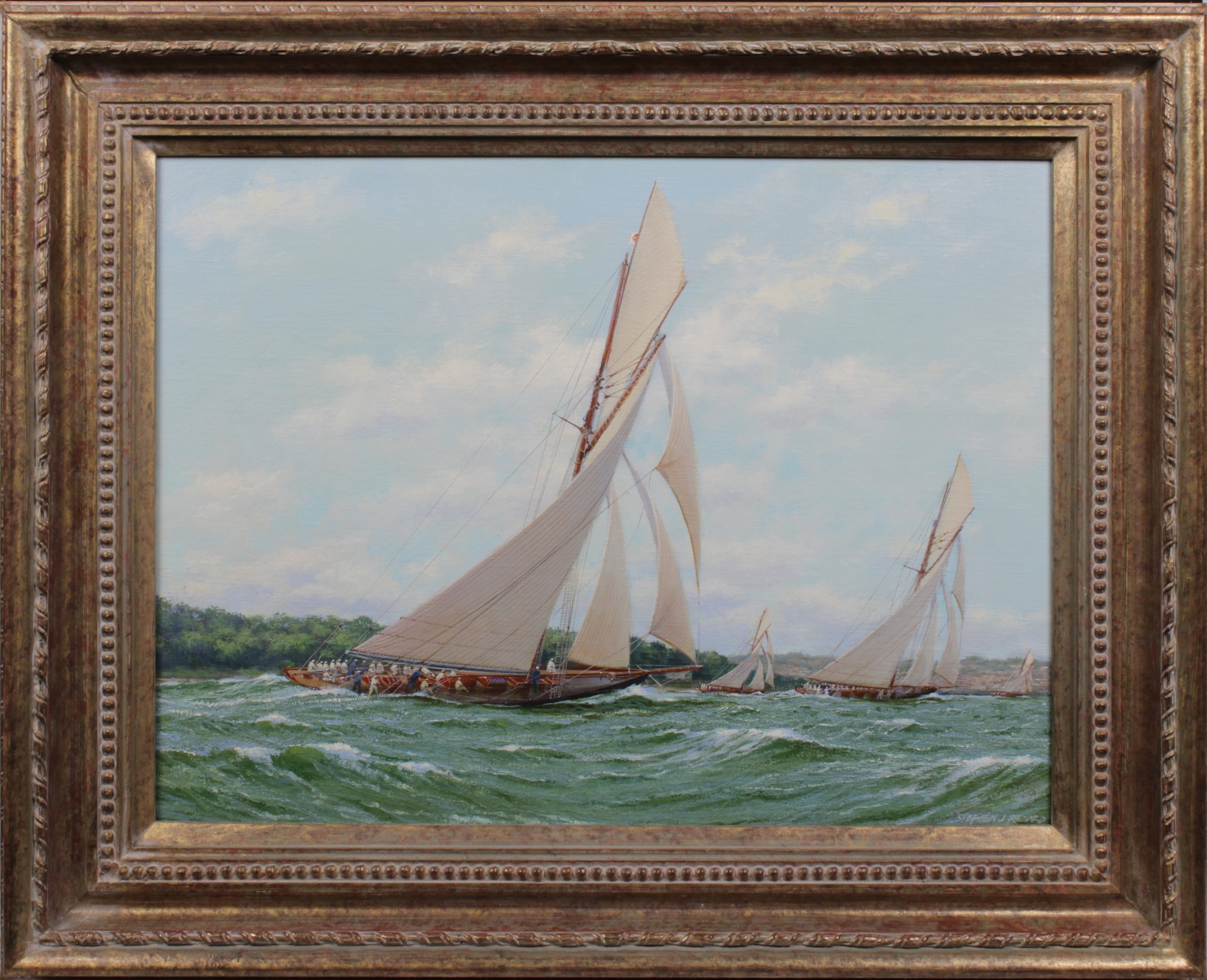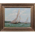 Stephen J Renard (British, b.1947), "Meteor II and Britannia off Cowes 1896"Signed, signed to stretcher, oil on canvas, 36.25cm x 49cm